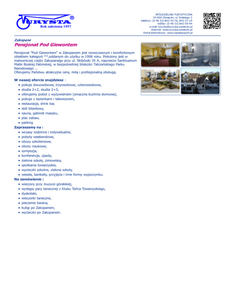 SPÓŁDZIELNIA TURYSTYCZNA 32-600 Oświęcim, ul. Solskiego 2 telefony: (0 48 33) 842-43-76, 842-27-19 tel/fax: (0 48 33) 842-59-94 e-mail: [email protected] Internet: www.turysta.oswiecim.pl Portal internetowy: www.nawakacje24.pl Zakopane Pensjonat Pod Giewontem Pensjonat "Pod Giewontem" w Zakopanem jest nowoczesnym i komfortowym obiektem kategorii **,oddanym do uŜytku w 1996 roku. PołoŜony jest w malowniczej części Zakopanego przy ul. Skibówki 35 A, naprzeciw Sanktuarium Matki Boskiej Fatimskiej, w bezpośredniej bliskości Tatrzańskiego Parku Narodowego ... Oferujemy Państwu atrakcyjne ceny, miłą i profesjonalną obsługę. W naszej ofercie znajdziesz : pokoje dwuosobowe, trzyosobowe, czteroosobowe, studia 2+2, studia 2+3, oferujemy pobyt z wyŜywieniem (smaczna kuchnia domowa), pokoje z łazienkami i telewizorem, restauracja, drink bar, stół bilardowy, sauna, gabinet masaŜu, plac zabaw, parking Zapraszamy na : wczasy rodzinne i indywidualne, pobyty weekendowe, obozy szkoleniowe, obozy naukowe, sympozja, konferencje, zjazdy, zielone szkoły, zimowiska, spotkania towarzyskie, wycieczki szkolne, zielone szkoły, wesela, bankiety, przyjęcia i inne formy wypoczynku. Na zamówienie : wieczory przy muzyce góralskiej, występy pary tanecznej z Klubu Tańca Towarzyskiego, dyskoteki, wieczorki taneczne, pieczenie barana, kuligi po Zakopanem, wycieczki po Zakopanem.