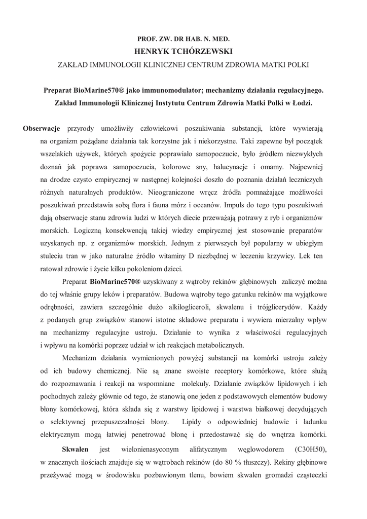 PROF. ZW. DR HAB. N. MED. HENRYK TCHÓRZEWSKI ZAKŁAD IMMUNOLOGII KLINICZNEJ CENTRUM ZDROWIA MATKI POLKI Preparat BioMarine570® jako immunomodulator; mechanizmy działania regulacyjnego. Zakład Immunologii Klinicznej Instytutu Centrum Zdrowia Matki Polki w Łodzi. Obserwacje przyrody umo liwiły człowiekowi poszukiwania substancji, które wywieraj Ŝ ą na organizm po dane działania tak korzystne jak i niekorzystne. Taki zapewne był pocz tek Ŝ ą ą wszelakich u ywek, których spo ycie poprawiało samopoczucie, było ródłem niezwykłych Ŝ Ŝ ź dozna jak poprawa samopoczucia, kolorowe sny, halucynacje i omamy. Najpewniej ń na drodze czysto empirycznej w nast pnej kolejno ci doszło do poznania działa leczniczych ę ś ń ró nych naturalnych produktów. Nieograniczone wr cz ródła pomna aj ce mo liwo ci Ŝ ę Ŝ ź Ŝ ą ś poszukiwa przedstawia sob flora i fauna mórz i oceanów. Impuls do tego typu poszukiwa ń ą ń daj obserwacje stanu zdrowia ludzi w których diecie przewa aj potrawy z ryb i organizmów Ŝ ą ą morskich. Logiczn konsekwencj ą takiej wiedzy empirycznej jest stosowanie preparatów ą uzyskanych np. z organizmów morskich. Jednym z pierwszych był popularny w ubiegłym stuleciu tran w jako naturalne ródło witaminy D niezb dnej w leczeniu krzywicy. Lek ten ź ę ratował zdrowie i ycie kilku pokoleniom dzieci. Ŝ Preparat BioMarine570® uzyskiwany z w troby rekinów gł binowych zaliczy mo na Ŝ ą ę ć do tej wła nie grupy leków i preparatów. Budowa w troby tego gatunku rekinów ma wyj tkowe ś ą ą odr bno ci, zawiera szczególnie du o alkilogliceroli, skwalenu i trójglicerydów. Ka dy Ŝ ę Ŝ ś z podanych grup zwi zków stanowi istotne składowe preparatu i wywiera mierzalny wpływ ą na mechanizmy regulacyjne ustroju. Działanie to wynika z wła ciwo ci regulacyjnych ś ś i wpływu na komórki poprzez udział w ich reakcjach metabolicznych. Mechanizm działania wymienionych powy ej substancji na komórki ustroju zale y Ŝ od ich budowy chemicznej. Nie s Ŝ znane swoiste receptory komórkowe, które słu Ŝ ą ą do rozpoznawania i reakcji na wspomniane molekuły. Działanie zwi zków lipidowych i ich ą pochodnych zale y głównie od tego, e stanowi one jeden z podstawowych elementów budowy Ŝ Ŝ ą błony komórkowej, która składa si z warstwy lipidowej i warstwa białkowej decyduj cych ę ą o selektywnej przepuszczalno ci błony. Lipidy o odpowiedniej budowie i ładunku ś elektrycznym mog łatwiej penetrowa ą Skwalen ć jest błon wielonienasyconym ę i przedostawa si ć alifatycznym ę do wn trza komórki. ę w glowodorem ę (C30H50), w znacznych ilo ciach znajduje si w w trobach rekinów (do 80 % tłuszczy). Rekiny gł binowe ś prze ywa Ŝ ć ę mog ą ą ę w rodowisku pozbawionym tlenu, bowiem skwalen gromadzi cz steczki ś ą tlenu, które nast pnie mog ę by ą u yte do podtrzymywania funkcji Ŝ ć yciowych organizmu Ŝ w warunkach bezwzgl dnego braku tlenu w rodowisku. Dzi ki tym cechom fizykochemicznym ę ś ę pełni on funkcje jako antyoksydant. Istniej te pojedyncze doniesienia, ze skwalen mo e by Ŝ Ŝ ą ć prekursorem glikokortykoidów. Stanowi on te do 11% zawarto ci tłuszczów w organizmie Ŝ ś człowieka, jest wydzielany z potem w ilo ciach od 125 do 475 mg/dob . Jest prekursorem ś ę cholesterolu. Pod wpływem promieniowania UV nast puje peroksydacja skwalenu przez ę reaktywne formy tlenu, powstaj ce w skórze, pochodne te mog ą Langerhansa, ale jednocze nie stymuluj ś komórki ć powstawanie prostaglandyn i leukotrienów, ą ś te za stanowi uszkadza ą znane mediatory reakcji zapalnych i regulacyjnych. Powstaj ce po rednie ą ą metabolity przemian skwalenu potencjalizuj ś działanie cytostatyczne leków cytostatycznych ą w do wiadczalnej terapii niektórych typów białaczek i raków. Jedynie po rednio mo na Ŝ ś ś si doszukiwa ć reakcji, które wyja niaj ę ś mechanizm działania skwalenu. Powstaj ce ą ą autokrynnie z jego udziałem prostaglandyny aktywuj w komórce docelowej błonow ą ą cyklaz adenylow . Cyklaza adenylowa podwy sza st enie wewn trzkomórkowego cAMP, Ŝ Ŝ ę ą ę ą który hamuje wydzielanie komórkowych mediatorów zapalenia lub limfokin odpowiedzialnych za regulacje reakcji immunologicznych lub zapalnych. Prostaglandyny hamuj tak e komórki Ŝ ą supresorowe T, przez co dochodzi do wzgl dnej przewagi limfocytów wspomagaj cych ę ą nale y, i nasilenia odpowiedzi immunologicznej. Przypomnie Ŝ ć Ŝ e prawidłowa regulacja odpowiedzi immunologicznej zale y od równowagi pomi dzy limfocytami T wspomagaj cymi Ŝ ę ą (CD4) i hamuj cymi (CD8), przewaga jednej z populacji decyduje o nasileniu b d hamowaniu ą ą ź reakcji odporno ciowych. Te rozwa ania teoretyczne potwierdzone zostały w badaniach Ŝ ś do wiadczalnych wykonanych na myszach. W badaniach tych wykazano, e skwalen nasila Ŝ ś funkcje komórek NK, fagocytów, zwi ksza zawarto ę ś ć limfocytów T, zwi ksza aktywno ę komórek produkuj cych przeciwciała, co mo e wskazywa ą ć odpowiedzialnych za odporno ś ś na potencjalizacj Ŝ ę ć funkcji komórkow , w tym by mo e tak e przeciwnowotworow . Ŝ ć ą Ŝ ć ą Skwalen od dziesi tków lat wykorzystywany jest w przemy le kosmetyków, ą ś ma wła ciwo ci ochronne w stosunku do działania promieni ultrafioletowych. W badaniach ś ś do wiadczalnych na myszach wykazano, ś Ŝ e nasila aktywno ś komórek NK oraz funkcje ć fagocytarne komórek prezentuj cych antygeny, co ma istotne znaczenia w procesie rozwoju ą reakcji immunologicznych. Ponadto w niektórych układach do wiadczalnych wzmaga ś nadwra liwo typu pó nego. Działania powy sze skłoniły do bada Ŝ ś Ŝ ć ź ń na wła ciwo ciami ś ś chemoprotekcyjnymi skwalenu w leczeniu do wiadczalnych nowotworów u myszy. Niektóre ś dane do wiadczalne wskazuj , e mo e nasila działanie cytostatyków – leków hamuj cych Ŝ ś ą Ŝ ć ą wzrost komórek nowotworowych, przez co mo na zmniejsza ich dawki 