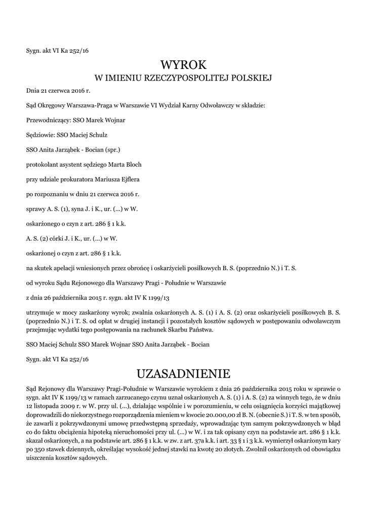 Sygn. akt VI Ka 252/16 WYROK W IMIENIU RZECZYPOSPOLITEJ POLSKIEJ Dnia 21 czerwca 2016 r. Sąd Okręgowy Warszawa-Praga w Warszawie VI Wydział Karny Odwoławczy w składzie: Przewodniczący: SSO Marek Wojnar Sędziowie: SSO Maciej Schulz SSO Anita Jarząbek - Bocian (spr.) protokolant asystent sędziego Marta Bloch przy udziale prokuratora Mariusza Ejflera po rozpoznaniu w dniu 21 czerwca 2016 r. sprawy A. S. (1), syna J. i K., ur. (...) w W. oskarżonego o czyn z art. 286 § 1 k.k. A. S. (2) córki J. i K., ur. (...) w W. oskarżonej o czyn z art. 286 § 1 k.k. na skutek apelacji wniesionych przez obrońcę i oskarżycieli posiłkowych B. S. (poprzednio N.) i T. S. od wyroku Sądu Rejonowego dla Warszawy Pragi - Południe w Warszawie z dnia 26 października 2015 r. sygn. akt IV K 1199/13 utrzymuje w mocy zaskarżony wyrok; zwalnia oskarżonych A. S. (1) i A. S. (2) oraz oskarżycieli posiłkowych B. S. (poprzednio N.) i T. S. od opłat w drugiej instancji i pozostałych kosztów sądowych w postępowaniu odwoławczym przejmując wydatki tego postępowania na rachunek Skarbu Państwa. SSO Maciej Schulz SSO Marek Wojnar SSO Anita Jarząbek - Bocian Sygn. akt VI Ka 252/16 UZASADNIENIE Sąd Rejonowy dla Warszawy Pragi-Południe w Warszawie wyrokiem z dnia 26 października 2015 roku w sprawie o sygn. akt IV K 1199/13 w ramach zarzucanego czynu uznał oskarżonych A. S. (1) i A. S. (2) za winnych tego, że w dniu 12 listopada 2009 r. w W. przy ul. (...), działając wspólnie i w porozumieniu, w celu osiągnięcia korzyści majątkowej doprowadzili do niekorzystnego rozporządzenia mieniem w kwocie 20.000,00 zł B. N. (obecnie S.) i T. S. w ten sposób, że zawarli z pokrzywdzonymi umowę przedwstępną sprzedaży, wprowadzając tym samym pokrzywdzonych w błąd co do faktu obciążenia hipoteką nieruchomości przy ul. (...) w W. i za tak opisany czyn na podstawie art. 286 § 1 k.k. skazał oskarżonych, a na podstawie art. 286 § 1 k.k. w zw. z art. 37a k.k. i art. 33 § 1 i 3 k.k. wymierzył oskarżonym kary po 350 stawek dziennych, określając wysokość jednej stawki na kwotę 20 złotych. Zwolnił oskarżonych od obowiązku uiszczenia kosztów sądowych. Od powyższego wyroku apelacje wnieśli obrońca oskarżonych oraz oskarżyciele posiłkowi. Obrońca oskarżonych zarzucił naruszenie art. 5 § 2 k.p.k. poprzez uznanie oskarżonych za winnych popełnienia zarzucanego im czynu pomimo, iż w sprawie występuje szereg nie dających się usunąć wątpliwości, dokonanie dowolnej oceny dowodów, pominięcie zasad prawidłowego rozumowania oraz wskazań wiedzy, nie odniesienie się do całości zeznań świadków przesłuchanych w toku postępowania, a także błędy w ustaleniach faktycznych. W konsekwencji powyższych zarzutów wniósł o zmianę zaskarżonego wyroku poprzez uniewinnienie oskarżonych. Oskarżyciele posiłkowi zarzucili rażącą niewspółmierność (łagodność) kary wymierzonej oskarżonym, brak orzeczenia o obowiązku naprawienia szkody oraz niezasadne zwolnienie oskarżonych od obowiązku ponoszenia kosztów sądowych. Sąd Okręgowy zważył, co następuje. Obie złożone w sprawie apelacje nie mogły zostać uwzględnione. Apelacja obrońcy oskarżonych stanowi jedynie polemikę z prawidłowym i właściwie uzasadnionym stanowiskiem Sądu I instancji. Zarówno oskarżeni w toku procesu, jak i obrońca oskarżonych w wywiedzionej apelacji podkreśla fakt, iż pokrzywdzeni B. S. i T. S. nie interesowali się tym, czy na przedmiotowej nieruchomości ustanowione są obciążenia w postaci np. hipoteki oraz że to sami pokrzywdzeni zrezygnowali z podpisania umowy przedwstępnej u notariusza. Obrońca wskazuje również, że pokrzywdzeni nie żądali w żaden sposób okazania odpisów z księgi wieczystej oraz zrezygnowali z ich przedstawienia przed notariuszem, jak również że oskarżeni nie mieli wpływu na tworzenie umowy przedwstępnej. Wyżej wymienione okoliczności nie mają tak naprawdę znaczenia dla ustalenia czy doszło do przestępstwa z art. 286 § 1 k.k. Oskarżeni podpisali umowę przedwstępną z pokrzywdzonymi, co oznacza, że złożyli oświadczenie woli o treści w niej zawartej. Oświadczyli tym samym, że przedmiotowa nieruchomość nie jest obciążona długami, ciężarami ani ograniczeniami w rozporządzaniu, ani też roszczeniami osób trzecich, nie są prowadzone w stosunku do niej żadne postępowania sądowe, egzekucyjne czy administracyjne i inne (k. 3). Ponadto oskarżeni uzgodnili, że bez względu na to, kto ponosi winę w przypadku odstąpienia od umowy, zaliczka w kwocie 20.000 złotych zostanie zwrócona pokrzywdzonym. Oskarżeni nie mogą tłumaczyć podpisania tak skonstruowanej umowy tym, że została ona napisana przez pokrzywdzonych i jedynie „podsunięta” oskarżonym do podpisu, jak również jej niedokładną lekturą. Umowa z k. 3 akt sprawy nie jest dokumentem obszernym, nie zawiera trudnych do zrozumienia prawniczych terminów, a jej, nawet wnikliwa, lektura nie zajmuje więcej niż 10 minut. Oskarżona A. S. (2) przed sądem wyjaśniła, iż nie ukrywała kredytu, który był wpisany w księgę wieczystą oraz że nie złożyła oświadczenia na piśmie, że nieruchomość jest nieobciążona. Wyjaśnienia te potwierdził oskarżony. Wyjaśnienia te są w sposób oczywisty nieprawdziwe, albowiem to właśnie przez złożenie podpisu pod umową przedwstępną z pokrzywdzonymi, oskarżeni wyraźnie oświadczyli, że przedmiotowa nieruchomość wolna jest od wszelkich obciążeń. Oskarżeni wprowadzili tym samym w błąd pokrzywdzonych, którzy gdyby byli odpowiednio poinformowani o faktycznym stanie prawnym nieruchomości, nie podpisaliby tejże umowy przedwstępnej i nie wpłacili oskarżonym zaliczki w wysokości 20.000 złotych, której po odstąpieniu od umowy nie otrzymali z powrotem, a co wyraźnie było zastrzeżone w umowie przedwstępnej. Wyzyskując zatem błąd pokrzywdzonych, oskarżeni doprowadzili ich d