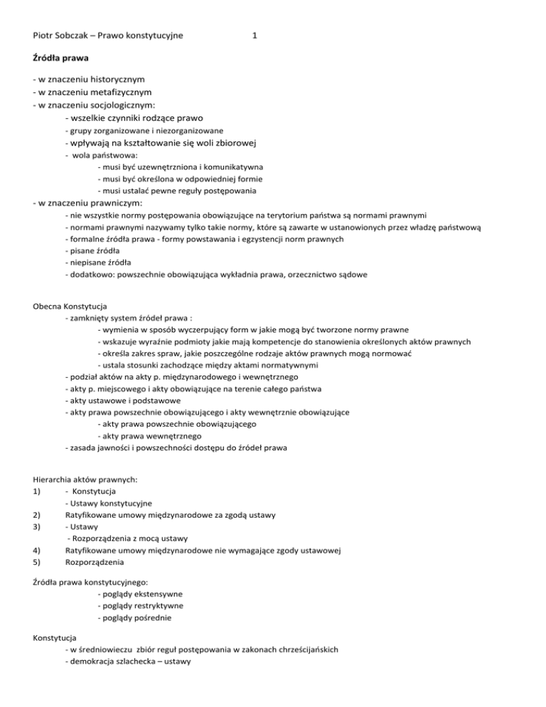 Piotr Sobczak – Prawo konstytucyjne 1 Źródła prawa - w znaczeniu historycznym - w znaczeniu metafizycznym - w znaczeniu socjologicznym: - wszelkie czynniki rodzące prawo - grupy zorganizowane i niezorganizowane - wpływają na kształtowanie się woli zbiorowej - wola państwowa: - musi być uzewnętrzniona i komunikatywna - musi być określona w odpowiedniej formie - musi ustalać pewne reguły postępowania - w znaczeniu prawniczym: - nie wszystkie normy postępowania obowiązujące na terytorium państwa są normami prawnymi - normami prawnymi nazywamy tylko takie normy, które są zawarte w ustanowionych przez władzę państwową - formalne źródła prawa - formy powstawania i egzystencji norm prawnych - pisane źródła - niepisane źródła - dodatkowo: powszechnie obowiązująca wykładnia prawa, orzecznictwo sądowe Obecna Konstytucja - zamknięty system źródeł prawa : - wymienia w sposób wyczerpujący form w jakie mogą być tworzone normy prawne - wskazuje wyraźnie podmioty jakie mają kompetencje do stanowienia określonych aktów prawnych - określa zakres spraw, jakie poszczególne rodzaje aktów prawnych mogą normować - ustala stosunki zachodzące między aktami normatywnymi - podział aktów na akty p. międzynarodowego i wewnętrznego - akty p. miejscowego i akty obowiązujące na terenie całego państwa - akty ustawowe i podstawowe - akty prawa powszechnie obowiązującego i akty wewnętrznie obowiązujące - akty prawa powszechnie obowiązującego - akty prawa wewnętrznego - zasada jawności i powszechności dostępu do źródeł prawa Hierarchia aktów prawnych: 1) - Konstytucja - Ustawy konstytucyjne 2) Ratyfikowane umowy międzynarodowe za zgodą ustawy 3) - Ustawy - Rozporządzenia z mocą ustawy 4) Ratyfikowane umowy międzynarodowe nie wymagające zgody ustawowej 5) Rozporządzenia Źródła prawa konstytucyjnego: - poglądy ekstensywne - poglądy restryktywne - poglądy pośrednie Konstytucja - w średniowieczu zbiór reguł postępowania w zakonach chrześcijańskich - demokracja szlachecka – ustawy Piotr Sobczak – Prawo konstytucyjne 2 - Konstytucja 3-Maja – oficjalna nazwa Ustawa Rządowa - od końca XVIII w. na świecie zaczęto dość powszechnie używać pojęcia konstytucji dla aktu który określał podstawy ustrojowe państwa - do XVIII ustrój regulowany inaczej – prawo zwyczajowe, akty monarchów - pierwsze konstytucje ograniczają władzę monarszą - równowaga między władzami, uniemożliwienie powrotu absolutyzmu - konstytucja faktyczna – rzeczywisty ustrój państwa - konstytucja (zn. prawnicze) – ustawa zasadnicza (nazwa Konstytucja, czasem Ustawa Rządowa, Ustawa Zasadnicza, Karta Konstytucyjna, Ustawa Konstytucyjna) - początki: -walka mieszczaństwa z feudałami o prawa polityczne - szkoła prawa natury - teoria umowy społecznej - teoria podziału władzy - koncepcja suwerenności ludu - racjonalizm - liberalizm i egalitaryzm - wojny napoleońskie - związane z walką o niepodległość - podstawa prawna wszystkich elementów życia politycznego i społeczno-gospodarczego państwa Rodzaje konstytucji - pisane i niepisane – sposób ujęcia treści - k. pisana - treść w jednej ustawie zasadniczej - k. niepiana – akty królewskie, zwyczaj, precedensy, pewne ustawy itd. - sztywne i giętkie - k. sztywna – najwyższa moc prawna, trudniejszy tryb zmiany niż ustawy - k. giętka – tryb zmiany taki sam jak ustawy - fikcyjne i rzeczywiste - k. rzeczywista – odzwierciedla realny ustrój państwa, układ sił politycznych, przestrzegana w praktyce - k. fikcyjna – normy zapisane w konstytucji nie odzwierciedlają realnego ustroju, łamane w praktyce