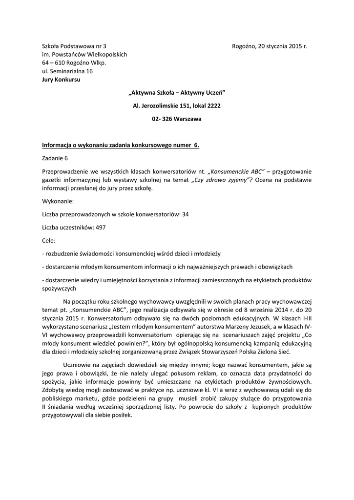 Szkoła Podstawowa nr 3 im. Powstańców Wielkopolskich 64 – 610 Rogoźno Wlkp. ul. Seminarialna 16 Jury Konkursu Rogoźno, 20 stycznia 2015 r. „Aktywna Szkoła – Aktywny Uczeń” Al. Jerozolimskie 151, lokal 2222 02- 326 Warszawa Informacja o wykonaniu zadania konkursowego numer 6. Zadanie 6 Przeprowadzenie we wszystkich klasach konwersatoriów nt. „Konsumenckie ABC” – przygotowanie gazetki informacyjnej lub wystawy szkolnej na temat „Czy zdrowo żyjemy”? Ocena na podstawie informacji przesłanej do jury przez szkołę. Wykonanie: Liczba przeprowadzonych w szkole konwersatoriów: 34 Liczba uczestników: 497 Cele: - rozbudzenie świadomości konsumenckiej wśród dzieci i młodzieży - dostarczenie młodym konsumentom informacji o ich najważniejszych prawach i obowiązkach - dostarczenie wiedzy i umiejętności korzystania z informacji zamieszczonych na etykietach produktów spożywczych Na początku roku szkolnego wychowawcy uwzględnili w swoich planach pracy wychowawczej temat pt. „Konsumenckie ABC”, jego realizacja odbywała się w okresie od 8 września 2014 r. do 20 stycznia 2015 r. Konwersatorium odbywało się na dwóch poziomach edukacyjnych. W klasach I-III wykorzystano scenariusz „Jestem młodym konsumentem” autorstwa Marzeny Jezusek, a w klasach IVVI wychowawcy przeprowadzili konwersatorium opierając się na scenariuszach zajęć projektu „Co młody konsument wiedzieć powinien?”, który był ogólnopolską konsumencką kampanią edukacyjną dla dzieci i młodzieży szkolnej zorganizowaną przez Związek Stowarzyszeń Polska Zielona Sieć. Uczniowie na zajęciach dowiedzieli się między innymi; kogo nazwać konsumentem, jakie są jego prawa i obowiązki, że nie należy ulegać pokusom reklam, co oznacza data przydatności do spożycia, jakie informacje powinny być umieszczane na etykietach produktów żywnościowych. Zdobytą wiedzę mogli zastosować w praktyce np. uczniowie kl. VI a wraz z wychowawcą udali się do pobliskiego marketu, gdzie podzieleni na grupy musieli zrobić zakupy służące do przygotowania II śniadania według wcześniej sporządzonej listy. Po powrocie do szkoły z kupionych produktów przygotowywali dla siebie posiłek. Uczniowie klasy VI a w roli konsumentów W klasie VI a uczniowie na zajęcia mieli przynieść etykiety produktów spożywczych. Następnie na karteczkach wypisywali, jakie informacje zawiera dana etykieta. Efektem końcowym była plansza, na której składniki produktów żywnościowych podzielono na barwniki spożywcze, konserwanty, antyutleniacze, emulgatory z zaznaczeniem, które z nich są nieszkodliwe, podejrzane oraz niebezpieczne. Plansza została umieszczona na szkolnej gazetce celem przekazania opracowanych informacji całej społeczności szkolnej. Uczniowie klas starszych wykonywali gazetki w ramach szkolnego konkursu o miano „Super klasy”. Każda klasa miała za zadanie w okresie od 9 do 16 stycznia br. wykonać w swoich salach lekcyjnych gazetkę informacyjną nt. „Czy zdrowo żyjemy?”. Najczęstszym wątkiem przewodnim w pracach była odpowiednia aktywność fizyczna oraz zasady zdrowego żywienia. Jury oceniało estetykę, pomysłowość oraz wkład pracy. Zwycięzcami okazali się uczniowie klasy VI c. Dodatkowo od października do grudnia 2014 r. uczniowie klas I a i III b wraz z wychowawcami uczestniczyli w konkursie Tesco dla Szkół – „Kulinarni odkrywcy”. Konkurs miał na celu uświadomić uczniom, że gotowanie nie musi wcale być trudne ani monotonne. Uczniowie musieli nakręcić filmik, przygotować gazetki ścienne, mogli również sprawdzić swoją wiedzę nt. zdrowego żywienia rozwiązując zadania i quizy na stronie www.tescodlaszkol.pl. Uczestnictwo w konkursie pozwoliło uczniom zobaczyć jak wygląda gotowanie poczynając od wykonania świadomych zakupów poprzez poznanie zasad zdrowego racjonalnego żywienia, a kończąc na kulinarnej zabawie. Uczniowie kl. III b - uczestnicy konkursu „Kulinarni odkrywcy” Nasza szkoła bierze udział w programie „Mam kota na punkcie mleka”. Został on zainicjowany przez Polską Izbę Mleka we współpracy z Polską Federacją Hodowców Bydła i Producentów Mleka. Skierowany jest zarówno do dzieci, jak i rodziców oraz nauczycieli. Jego celem jest zwiększenie wiedzy dzieci na temat odżywczych walorów mleka oraz jego przetworów. Misja akcji w naturalny sposób łączy się z potrzebą kształtowania prawidłowych nawyków żywieniowych i promowania aktywnego stylu życia wśród dzieci. Działania zaplanowane są na trzy lata (do sierpnia 2015 r). Uczestniczą w nich uczniowie obecnych klas V i VI. W ramach programu uczniowie uczestniczyli w cyklu zajęć ( 3 x 45 minut) poprowadzonych przez nauczycieli przyrody według scenariuszy opracowanych przez autorów programu, mieli możliwość wzięcia udziału w konkursach klasowych i międzyszkolnych organizowanych w szkole oraz na stronie internetowej www.mamkotanapunkciemleka.pl, rodzice natomiast otrzymali materiały edukacyjne. Szkolny konkurs kulinarny „Potrawy z mleka” Uczestniczymy także w programach Unii Europejskiej wspierających zdrową, zbilansowaną dietę dzieci i młodzieży w szkołach – „Szklanka mleka” oraz „Owoce w szkole”. Dzięki nim uczniowie klas I-VI otrzymują bezpłatnie 3 razy w tygodniu mleko, a klas młodszych dodatkowo owoce i warzywa. Programy te kształtują zdrowe nawyki żywieniowe oraz promują zbilansowaną dietę. Od grudnia 2014 r. uczniowie podczas pobytu w szkole mają możliwość zakupu kanapek w różnych wersjach, przygotowywanych i sprzedawanych przez firmę „Bułeczkomania”. Dzięki temu działaniu osoby, które nie przyniosły II śniadania do szkoły lub miały go za mało mogą kupić zdrową żywność. W ten sposób uczniowie mogą zaspokoić swoje potrzeby żywieniowe a szkoła zapobiega skutkom nieprawidłowego żywienia. Postawione w tym zadaniu cele zostały zrealizowane, uczniowie nie tyl