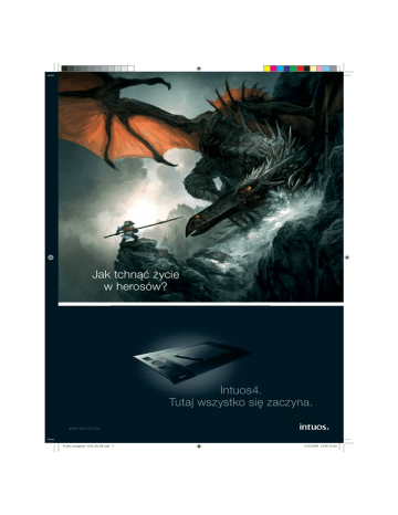 Titelseite U1 Floris Didden z KARAKTER, Artysta projektant Jak tchnąć życie w herosów? Intuos4. Tutaj wszystko się zaczyna. www.wacom.eu I4_Bro_Ausgesch_1103_All_RZ.indd 3 12.03.2009 13:45:13 Uhr U2 N D Z u p w w ko m rę ta E p le p u Czy zastanawiałeś się kiedyś, jak tchnąć życie w ludzkość? “Przez zwracanie uwagi na najdrobniejszy szczegół – piksel po pikselu. Dlatego potrzebuję narzędzia, które właśnie to potrafi robić” Robert Preston, Artysta cyfrowy Odkryj, jak kreatywne pomysły nabierają życia – czy są to fotografie, ilustracje, projekty 3D, animacje czy też sztuki piękne. Przedstawiamy tablet piórkowy Intuos4. Stworzony dla kreatywnych profesjonalistów. Przez Wacom. I4_Bro_Ausgesch_1103_All_RZ.indd 4 12.03.2009 13:45:14 Uhr Seite 03 Fotografia: Robin Preston L. I4_Bro_Ausgesch_1103_All_RZ.indd 8 12.03.2009 13:45:33 Uhr Seite 04 Czy wyobrażałeś sobie kiedyś, jak tchnąć życie w zło? “Trzeba wyobraźni, mnóstwa czasu i narzędzia, którym można rysować godzinami bez zmęczenia” Akira Endo i Robert Hranitzky, Projektanci 3D I4_Bro_Ausgesch_1103_All_RZ.indd 9 12.03.2009 13:45:36 Uhr Seite 05 Projekt 3D: Akira Endo i Robert Hranitzky I4_Bro_Ausgesch_1103_All_RZ.indd 12 12.03.2009 13:45:51 Uhr Seite 06 Czy pytałeś siebie kiedyś, jak tchnąć życie w tyranów? “Rodzi się to w mojej głowie, z wiecznego niezadowolenia. Dlatego potrzebuję narzędzi, którymi można wszystko” Rafał Wojtunik, Projektant 3D I4_Bro_Ausgesch_1103_All_RZ.indd 13 12.03.2009 13:45:55 Uhr Seite 07 Projekt 3D: Rafał Wojtunik Intuos4. Tutaj wszystko się zaczyna. I4_Bro_Ausgesch_1103_All_RZ.indd 14 12.03.2009 13:45:57 Uhr Seite 08 Intuos4: redefiniuje kategorię tabletów piórkowych. Już na pierwszy rzut oka. I4_Bro_Ausgesch_1103_All_RZ.indd 11 12.03.2009 13:45:44 Uhr Seite 09 Wacom, specjalista od tabletów piórkowych, stworzył Intuos4 z inspiracji członków globalnej, profesjonalnej społeczności Wacom. W rezultacie powstał tablet piórkowy, który może odmienić życie zawodowe tysięcy kreatywnych talentów na całym świecie. Tak naturalny, jak tylko możliwe Kształt i powierzchnia zostały opracowane zupełnie od nowa, aby umożliwić ergonomiczne, równomierne pociągnięcia piórkiem nawet przez dłuższy czas. Pierścień możliwości Definiowany przez użytkownika Touch Ring z funkcją przełączania umożliwia intuicyjne sterowanie przewijaniem, skalowaniem, wielkością pędzla, obracaniem obszaru roboczego i zaznaczaniem warstw – dokładnie tak, jak tego chcesz. Klucze do sukcesu Programowalne przyciski ExpressKeys™ pozwalają na tworzenie własnych skrótów klawiszowych, właściwych dla danej aplikacji. W modelach tabletu M, L i XL wyświetlacze OLED informują o aktualnej funkcji przycisku. I4_Bro_Ausgesch_1103_All_RZ.indd 10 12.03.2009 13:45:38 Uhr Seite 10 We wszystko możesz tchnąć życie – jeżeli wejdziesz w świat Intuos4. Rozmiar jest istotny: wybierz między S, M, L i XL. I4_Bro_Ausgesch_1103_All_RZ.indd 7 12.03.2009 13:45:30 Uhr Klappseite ist 2 mm verkürzt Klappseite Chwyć piórko. Ustaw obustronny Intuos4 w najdogodniejszej dla siebie pozycji. Wybierz odpowiednią końcówkę z podstawki pod piórko. Załóż kolorowy pierścień indentyfikacyjny. Zrób pierwsze pociągnięcie i odkryj niezwykłość końcówki ‘Wacom Tip Sensor’ o zdumiewającej liczbie 2048 poziomów wrażliwości na nacisk, dającej poczucie naturalności przy rysowaniu lub pracy nad ilustracją. Dokończ projekt. Odłóż piórko na podstawkę. Odpręż się i pomyśl z zadowoleniem, że nadanie czemuś nowemu życia nigdy jeszcze nie było tak łatwe. W E 4 N T F i w © w p s B I4_Bro_Ausgesch_1103_All_RZ.indd 1 12.03.2009 13:45:05 Uhr U3 Najwyższy komfort. Dla tych, którzy pracują najwięcej. Za Intuos4 kryje się idea opracowania narzędzia, które ułatwiłoby życie każdemu, którego ambicją są doskonałe, profesjonalne rezultaty. Takie rezultaty, które zwykle wymagają wielu godzin ciężkiej pracy. Dlatego Wacom wyposażył Intuos4 tak, aby stwarzał jak największy komfort. Cienki i ergonomiczny, z wyprofilowanym miejscem pod dłoń, zapewnia odpowiednie podparcie dla ręki i wygodę nawet przy wielogodzinnej pracy. Design tabletu pozwala na jego obrócenie, przez co przyciski ExpressKeys™ znajdują się zawsze w odpowiedniej pozycji, niezależnie od tego, czy jesteś prawo- czy leworęczny. Zapomnij o zmęczeniu ręki: wyprofilowane pióro Grip Pen znacznie zmniejsza konieczną siłę uchwytu. Zaawansowane funkcje. Dla większej kreatywnej wydajności. Kreatywni profesjonaliści nie myślą o tym, co robią – po prostu to robią. Dzięki kilku zaawansowanym funkcjom Intuos4 ich praca jest bardziej intuicyjna. Dynamiczne wyświetlacze ExpressKey™ pokazują bieżące, specyficzne dla danej aplikacji funkcje każdego przycisku. Dzięki wielofunkcyjnemu Touch Ring przewijanie, skalowanie i wielkość pędzla sterowane są za dotknięciem palca. W nowym trybie precyzji pióra Grip Pen można z łatwością dopracowywać szczegóły na poziomie piksela. Nowe menu obrotowe umożliwia zorganizowany i szybki dostęp do skrótów klawiszowych – za jednym dotknięciem pióra. Grip Pen Intuos4. Wyposażony w gumowy obszar uchwytu znacznie zmniejszający siłę chwytu. Grip Pen Intuos4. Wyposażony w wymienialny, pogrubiony uchwyt do pióra. Classic Pen Intuos4. Ma ten sam zestaw funkcji, co pióro Grip Pen, lecz smuklejszy profil. I4_Bro_Ausgesch_1103_All_RZ.indd 5 12.03.2009 13:45:17 Uhr Na Dl Co Oz te pr ta ob pr W nie pr zg da po nie zw ró Klappseite ist 2 mm verkürzt Najlepsze w swojej klasie narzędzia sterowania. Dla najlepszych w swojej klasie rezultatów. Co znaczy “sterowanie” w trakcie procesu twórczego? Oznacza, że wszystko odbywa się precyzyjnie, tak jak tego chcesz. Pozwala na to doskonałe współdziałanie programowalnych przez użytkownika narzędzi sterowania, takich jak przyciski ExpressKeys™