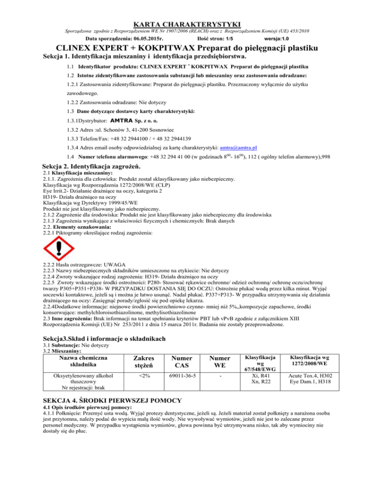 KARTA CHARAKTERYSTYKI Sporządzona zgodnie z Rozporządzeniem WE Nr 1907/2006 (REACH) oraz z Rozporządzeniem Komisji (UE) 453/2010 Data sporządzenia: 06.05.2015r. Ilość stron: 1/5 wersja:1.0 CLINEX EXPERT + KOKPITWAX Preparat do pielęgnacji plastiku Sekcja 1. Identyfikacja mieszaniny i identyfikacja przedsiębiorstwa. 1.1 Identyfikator produktu: CLINEX EXPERT + KOKPITWAX Preparat do pielęgnacji plastiku 1.2 Istotne zidentyfikowane zastosowania substancji lub mieszaniny oraz zastosowania odradzane: 1.2.1 Zastosowania zidentyfikowane: Preparat do pielęgnacji plastiku. Przeznaczony wyłącznie do użytku zawodowego. 1.2.2 Zastosowania odradzane: Nie dotyczy 1.3 Dane dotyczące dostawcy karty charakterystyki: 1.3.1Dystrybutor: AMTRA Sp. z o. o. 1.3.2 Adres :ul. Schonów 3, 41-200 Sosnowiec 1.3.3 Telefon/Fax: +48 32 2944100 / + 48 32 2944139 1.3.4 Adres email osoby odpowiedzialnej za kartę charakterystyki: [email protected] 1.4 Numer telefonu alarmowego: +48 32 294 41 00 (w godzinach 800- 1600), 112 ( ogólny telefon alarmowy),998 Sekcja 2. Identyfikacja zagrożeń. 2.1 Klasyfikacja mieszaniny: 2.1.1. Zagrożenia dla człowieka: Produkt został sklasyfikowany jako niebezpieczny. Klasyfikacja wg Rozporządzenia 1272/2008/WE (CLP) Eye Irrit.2- Działanie drażniące na oczy, kategoria 2 H319- Działa drażniąco na oczy Klasyfikacja wg Dyrektywy 1999/45/WE Produkt nie jest klasyfikowany jako niebezpieczny. 2.1.2 Zagrożenie dla środowiska: Produkt nie jest klasyfikowany jako niebezpieczny dla środowiska 2.1.3 Zagrożenia wynikające z właściwości fizycznych i chemicznych: Brak danych 2.2. Elementy oznakowania: 2.2.1 Piktogramy określające rodzaj zagrożenia: 2.2.2 Hasła ostrzegawcze: UWAGA 2.2.3 Nazwy niebezpiecznych składników umieszczone na etykiecie: Nie dotyczy 2.2.4 Zwroty wskazujące rodzaj zagrożenia: H319- Działa drażniąco na oczy 2.2.5 Zwroty wskazujące środki ostrożności: P280- Stosować rękawice ochronne/ odzież ochronną/ ochronę oczu/ochronę twarzy P305+P351+P338- W PRZYPADKU DOSTANIA SIĘ DO OCZU: Ostrożnie płukać wodą przez kilka minut. Wyjąć soczewki kontaktowe, jeżeli są i można je łatwo usunąć. Nadal płukać. P337+P313- W przypadku utrzymywania się działania drażniącego na oczy: Zasięgnąć porady/zgłosić się pod opiekę lekarza. 2.2.4Dodatkowe informacje: niejnowe środki powierzchniowo czynne- mniej niż 5%,,kompozycje zapachowe, środki konserwujące: methylchloroisothiazolinone, methylisothiazolinone 2.3 Inne zagrożenia: Brak informacji na temat spełniania kryteriów PBT lub vPvB zgodnie z załącznikiem XIII Rozporządzenia Komisji (UE) Nr 253/2011 z dnia 15 marca 2011r. Badania nie zostały przeprowadzone. Sekcja3.Skład i informacje o składnikach 3.1 Substancje: Nie dotyczy 3.2 Mieszaniny: Nazwa chemiczna składnika Zakres stężeń Numer CAS Numer WE Oksyetylenowany alkohol tłuszczowy Nr rejestracji: brak <2% 69011-36-5 - Klasyfikacja wg 67/548/EWG Xi, R41 Xn, R22 Klasyfikacja wg 1272/2008/WE Acute Tox.4, H302 Eye Dam.1, H318 SEKCJA 4. ŚRODKI PIERWSZEJ POMOCY 4.1 Opis środków pierwszej pomocy: 4.1.1 Połknięcie: Przemyć usta wodą. Wyjąć protezy dentystyczne, jeżeli są. Jeżeli materiał został połknięty a narażona osoba jest przytomna, należy podać do wypicia małą ilość wody. Nie wywoływać wymiotów, jeżeli nie jest to zalecane przez personel medyczny. W przypadku wystąpienia wymiotów, głowa powinna być utrzymywana nisko, tak aby wymiociny nie dostały się do płuc. KARTA CHARAKTERYSTYKI Sporządzona zgodnie z Rozporządzeniem WE Nr 1907/2006 (REACH) oraz z Rozporządzeniem Komisji (UE) 453/2010 Data sporządzenia: 06.05.2015r. Ilość stron: 2/5 wersja:1.0 CLINEX EXPERT + KOKPITWAX Preparat do pielęgnacji plastiku 4.1.2. Zatrucie inhalacyjne: Wynieść poszkodowanego z miejsca narażenia i zapewnić dostęp świeżego powietrza oraz spokój i odpoczynek. W przypadku dolegliwości zapewnić pomoc lekarską. 4.1.3. Skażenie skóry: Spłukać skażoną skórę dużą ilością wody. Zdjąć skażoną odzież i buty. Należy kontynuować płukanie przez co najmniej 10 minut. Jeżeli podrażnienie się utrzymuje, skontaktować się z lekarzem. 4.1.4.Skażenie oczu: Jeżeli poszkodowany nosi szkła kontaktowe niezwłocznie je wyjąć. Dokładnie przemyć oczy dużą ilością wody, wywijając powieki. Unikać silnego strumienia , ze względu na niebezpieczeństwo uszkodzenia rogówki. Zapewnić natychmiastową pomoc okulisty. Uwaga: osoby narażone na skażenie oczu powinny być pouczone o konieczności i sposobie natychmiastowego płukania oczu 4.2 Najważniejsze ostre i opóźnione objawy oraz skutki narażenia: 4.2.1 Skażenie oczu: Do poważnych objawów można zaliczyć: ból lub podrażnienie, łzawienie, zaczerwienienie 4.3 Wskazania dotyczące wszelkiej natychmiastowej pomocy lekarskiej i szczególnego postępowania z poszkodowanym: Leczyć objawowo. SEKCJA 5. POSTĘPOWANIE W PRZYPADKU POŻARU 5.1 Środki gaśnicze: 5.1.1 Odpowiednie środki gaśnicze: Stosować powszechne środki gaśnicze; w zależności od otoczenia. 5.1.2 Niewłaściwe środki gaśnicze: Nie używać strumienia wody. 5.2 Szczególne zagrożenia związane z mieszaniną: Brak danych. 5.3 Informacje dla straży pożarnej: Środki ochrony ogólnej typowe w przypadku pożaru. Nie należy przebywać w zagrożonej ogniem strefie bez odpowiedniego ubrania odpornego na chemikalia i aparatu do oddychania z niezależnym obiegiem powietrza. Zagrożone pożarem zbiorniki usunąć jeśli to możliwe i nie wiąże się z nadmiernym ryzykiem lub chłodzić rozpyloną wodą z odpowiedniej odległości. Izolować teren przez wyprowadzenie wszystkich osób z najbliższej okolicy wypadku, jeżeli wybuch pożar. Nie należy podejmować żadnych działań, które stwarzałyby ryzyko dla kogokolwiek chyba że jest się odpowiednio przeszkolonym. SEKCJA 6. POSTĘPOWANIE W PRZYPADKU NIEZAMIERZONEGO UWOLIENIA DO ŚRODOWISKA 6.1 Indywidua