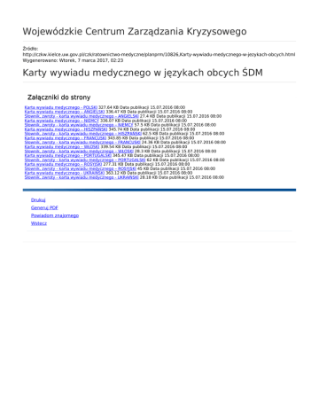 Wojewódzkie Centrum Zarządzania Kryzysowego Źródło: http://czkw.kielce.uw.gov.pl/czk/ratownictwo-medyczne/planprm/10826,Karty-wywiadu-medycznego-w-jezykach-obcych.html Wygenerowano: Wtorek, 7 marca 2017, 02:23 Karty wywiadu medycznego w językach obcych ŚDM Załączniki do strony Karta wywiadu medycznego - POLSKI 327.64 KB Data publikacji 15.07.2016 08:00 Karta wywiadu medycznego – ANGIELSKI 336.47 KB Data publikacji 15.07.2016 08:00 Słownik, zwroty - karta wywiadu medycznego – ANGIELSKI 27.4 KB Data publikacji 15.07.2016 08:00 Karta wywiadu medycznego – NIEMCY 336.07 KB Data publikacji 15.07.2016 08:00 Słownik, zwroty - karta wywiadu medycznego – NIEMCY 57.5 KB Data publikacji 15.07.2016 08:00 Karta wywiadu medycznego – HISZPAŃSKI 345.74 KB Data publikacji 15.07.2016 08:00 Słownik, zwroty - karta wywiadu medycznego – HISZPAŃSKI 62.5 KB Data publikacji 15.07.2016 08:00 Karta wywiadu medycznego – FRANCUSKI 343.85 KB Data publikacji 15.07.2016 08:00 Słownik, zwroty - karta wywiadu medycznego – FRANCUSKI 24.36 KB Data publikacji 15.07.2016 08:00 Karta wywiadu medycznego – WŁOSKI 339.54 KB Data publikacji 15.07.2016 08:00 Słownik, zwroty - karta wywiadu medycznego – WŁOSKI 28.3 KB Data publikacji 15.07.2016 08:00 Karta wywiadu medycznego – PORTUGALSKI 345.47 KB Data publikacji 15.07.2016 08:00 Słownik, zwroty - karta wywiadu medycznego – PORTUGALSKI 62 KB Data publikacji 15.07.2016 08:00 Karta wywiadu medycznego – ROSYJSKI 277.31 KB Data publikacji 15.07.2016 08:00 Słownik, zwroty - karta wywiadu medycznego – ROSYJSKI 45 KB Data publikacji 15.07.2016 08:00 Karta wywiadu medycznego - UKRAIŃSKI 363.12 KB Data publikacji 15.07.2016 08:00 Słownik, zwroty - karta wywiadu medycznego - UKRAIŃSKI 28.18 KB Data publikacji 15.07.2016 08:00 Drukuj Generuj PDF Powiadom znajomego Wstecz