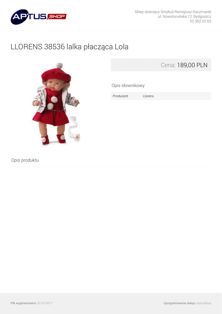 Sklep dziecięcy Smykuś Remigiusz Kaczmarek ul. Nowotoruńska 12, Bydgoszcz 52 362 02 63 LLORENS 38536 lalka płacząca Lola Cena: 189,00 PLN Opis słownikowy Producent Llorens Opis produktu Plik wygenerowano: 07-03-2017 Powered by TCPDF (www.tcpdf.org) Oprogramowanie sklepu: AptusShop