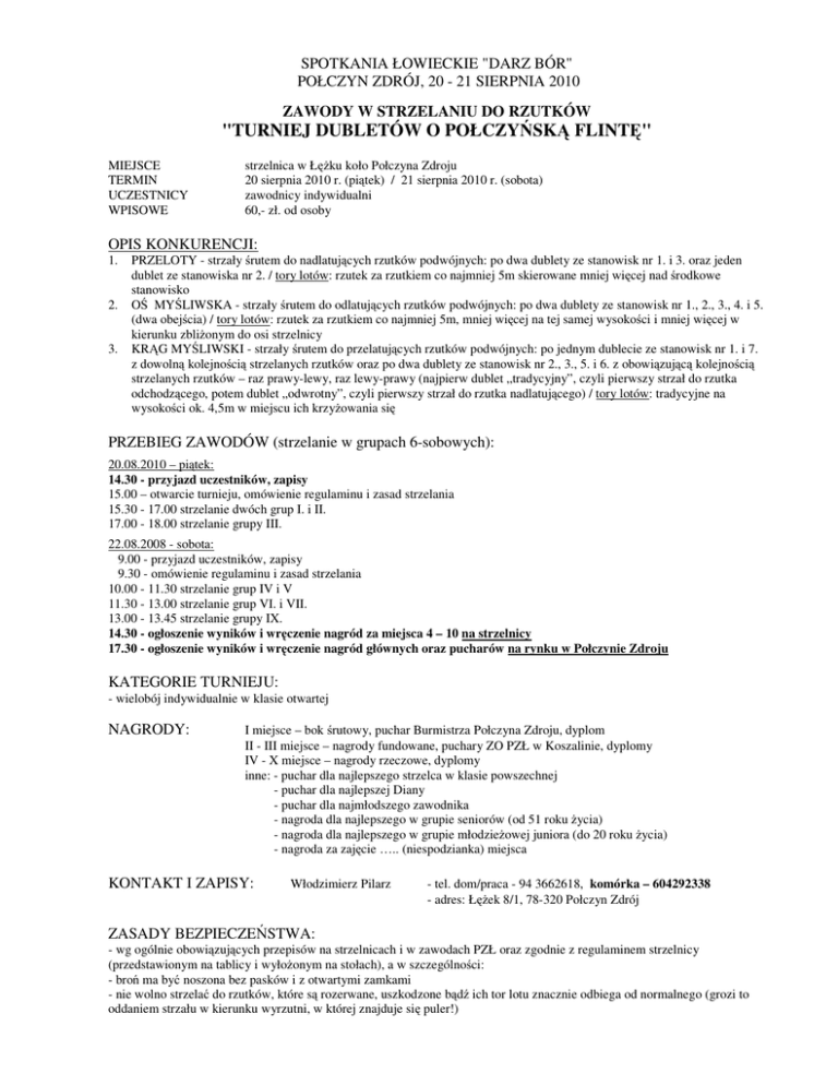 SPOTKANIA ŁOWIECKIE "DARZ BÓR" POŁCZYN ZDRÓJ, 20 - 21 SIERPNIA 2010 ZAWODY W STRZELANIU DO RZUTKÓW "TURNIEJ DUBLETÓW O POŁCZYŃSKĄ FLINTĘ" MIEJSCE TERMIN UCZESTNICY WPISOWE strzelnica w Łężku koło Połczyna Zdroju 20 sierpnia 2010 r. (piątek) / 21 sierpnia 2010 r. (sobota) zawodnicy indywidualni 60,- zł. od osoby OPIS KONKURENCJI: 1. 2. 3. PRZELOTY - strzały śrutem do nadlatujących rzutków podwójnych: po dwa dublety ze stanowisk nr 1. i 3. oraz jeden dublet ze stanowiska nr 2. / tory lotów: rzutek za rzutkiem co najmniej 5m skierowane mniej więcej nad środkowe stanowisko OŚ MYŚLIWSKA - strzały śrutem do odlatujących rzutków podwójnych: po dwa dublety ze stanowisk nr 1., 2., 3., 4. i 5. (dwa obejścia) / tory lotów: rzutek za rzutkiem co najmniej 5m, mniej więcej na tej samej wysokości i mniej więcej w kierunku zbliżonym do osi strzelnicy KRĄG MYŚLIWSKI - strzały śrutem do przelatujących rzutków podwójnych: po jednym dublecie ze stanowisk nr 1. i 7. z dowolną kolejnością strzelanych rzutków oraz po dwa dublety ze stanowisk nr 2., 3., 5. i 6. z obowiązującą kolejnością strzelanych rzutków – raz prawy-lewy, raz lewy-prawy (najpierw dublet „tradycyjny”, czyli pierwszy strzał do rzutka odchodzącego, potem dublet „odwrotny”, czyli pierwszy strzał do rzutka nadlatującego) / tory lotów: tradycyjne na wysokości ok. 4,5m w miejscu ich krzyżowania się PRZEBIEG ZAWODÓW (strzelanie w grupach 6-sobowych): 20.08.2010 – piątek: 14.30 - przyjazd uczestników, zapisy 15.00 – otwarcie turnieju, omówienie regulaminu i zasad strzelania 15.30 - 17.00 strzelanie dwóch grup I. i II. 17.00 - 18.00 strzelanie grupy III. 22.08.2008 - sobota: 9.00 - przyjazd uczestników, zapisy 9.30 - omówienie regulaminu i zasad strzelania 10.00 - 11.30 strzelanie grup IV i V 11.30 - 13.00 strzelanie grup VI. i VII. 13.00 - 13.45 strzelanie grupy IX. 14.30 - ogłoszenie wyników i wręczenie nagród za miejsca 4 – 10 na strzelnicy 17.30 - ogłoszenie wyników i wręczenie nagród głównych oraz pucharów na rynku w Połczynie Zdroju KATEGORIE TURNIEJU: - wielobój indywidualnie w klasie otwartej NAGRODY: I miejsce – bok śrutowy, puchar Burmistrza Połczyna Zdroju, dyplom II - III miejsce – nagrody fundowane, puchary ZO PZŁ w Koszalinie, dyplomy IV - X miejsce – nagrody rzeczowe, dyplomy inne: - puchar dla najlepszego strzelca w klasie powszechnej - puchar dla najlepszej Diany - puchar dla najmłodszego zawodnika - nagroda dla najlepszego w grupie seniorów (od 51 roku życia) - nagroda dla najlepszego w grupie młodzieżowej juniora (do 20 roku życia) - nagroda za zajęcie ….. (niespodzianka) miejsca KONTAKT I ZAPISY: Włodzimierz Pilarz - tel. dom/praca - 94 3662618, komórka – 604292338 - adres: Łężek 8/1, 78-320 Połczyn Zdrój ZASADY BEZPIECZEŃSTWA: - wg ogólnie obowiązujących przepisów na strzelnicach i w zawodach PZŁ oraz zgodnie z regulaminem strzelnicy (przedstawionym na tablicy i wyłożonym na stołach), a w szczególności: - broń ma być noszona bez pasków i z otwartymi zamkami - nie wolno strzelać do rzutków, które są rozerwane, uszkodzone bądź ich tor lotu znacznie odbiega od normalnego (grozi to oddaniem strzału w kierunku wyrzutni, w której znajduje się puler!) - na stanowiskach przelotów po oddaniu strzałów należy najpierw „wrócić” lufami w kierunku wyrzutni, a dopiero potem je opuścić i otworzyć broń (by nie robić tego z lufami skierowanymi w kierunku obserwatorów!) - na środkowym stanowisku przelotów nie wolno strzelać do tyłu poza płaszczyznę pionową (tak by nie oddawać strzału do tyłu, bądź nie upaść!) ZASADY REGULAMINOWE I OCENA STRZAŁÓW: - generalnie wg prawideł strzeleckich Polskiego Związku Łowieckiego - rzutek uznaje się za trafiany jeśli wyraźnie widoczny jest co najmniej jeden odprysk - przy trafionych jednocześnie rzutkach pierwszym strzałem powtarza się dublet (chyba, że zawodnik chce, by zaliczyć mu trafienie tylko jednego rzutka) - przy trafionych jednocześnie rzutkach drugim strzałem uznaje się trafienie jednego rzutka - jeżeli jeden z rzutków wyjdzie rozerwany, lub nie zostanie przyjęty z uwagi na nieprawidłowy lot, albo nastąpi niewypał z winy amunicji powtarza się dublet (chyba, że zawodnik, który trafił pierwszego rzutka, chce by uznać mu jedno trafienie) - można zawsze strzelać dwa razy do tego samego rzutka / na kręgu myśliwskim wymuszona kolejność strzelań dotyczy tylko pierwszego rzutka - zawodnik, który na kręgu myśliwskim pierwszym strzałem rozbije nie tego rzutka, którego powinien i nie odda drugiego strzału może powtórzyć dublet, i jeśli strzeli w nim oba rzutki, to zalicza mu się jedno trafienie - przy równej ilości punktów o pierwszym miejscu w zawodach decyduje baraż na osi myśliwskiej (10 dubletów) / jeśli baraż ten nie da rozstrzygnięcia, to powtarza się go do pierwszej przewagi na stanowisku / o kolejności strzelań w barażu decyduje losowanie - przy równej ilości punktów o pozostałych miejscach decydują kolejno: lepszy wynik na kręgu myśliwskim, lepszy wynik na osi myśliwskiej, mniejsza ilość strzelonych dubletów (czyli tym samym mniejsza ilość podwójnych pudeł) UWAGI: - strzelający w sobotę mogą mieć pogorszone warunki z uwagi na słońce (osie strzeleckie skierowane są w kierunku wschodnim) - zawodnicy przed i po strzelaniu, które będzie trwało około 1,5 godziny dla dwóch grup, będą mogli uczestniczyć w innych imprezach łowieckich zorganizowanych w tym czasie na terenie Połczyna Zdroju (jarmark, prezentacje, wystawy, konkursy, pokazy, występy, koncerty, itp.) - wszystkie rzutki są puszczane ręcznie, mogą więc wystąpić różnice w torach lotów (np. drugi rzutek będzie podążać za pierwszym raz 5m, a raz 10m, mogą zdarzyć się nierówne odchylenia między torami rzutków, rzutki z budek na kręgu mogą zostać podane w niewielkim odstępi
