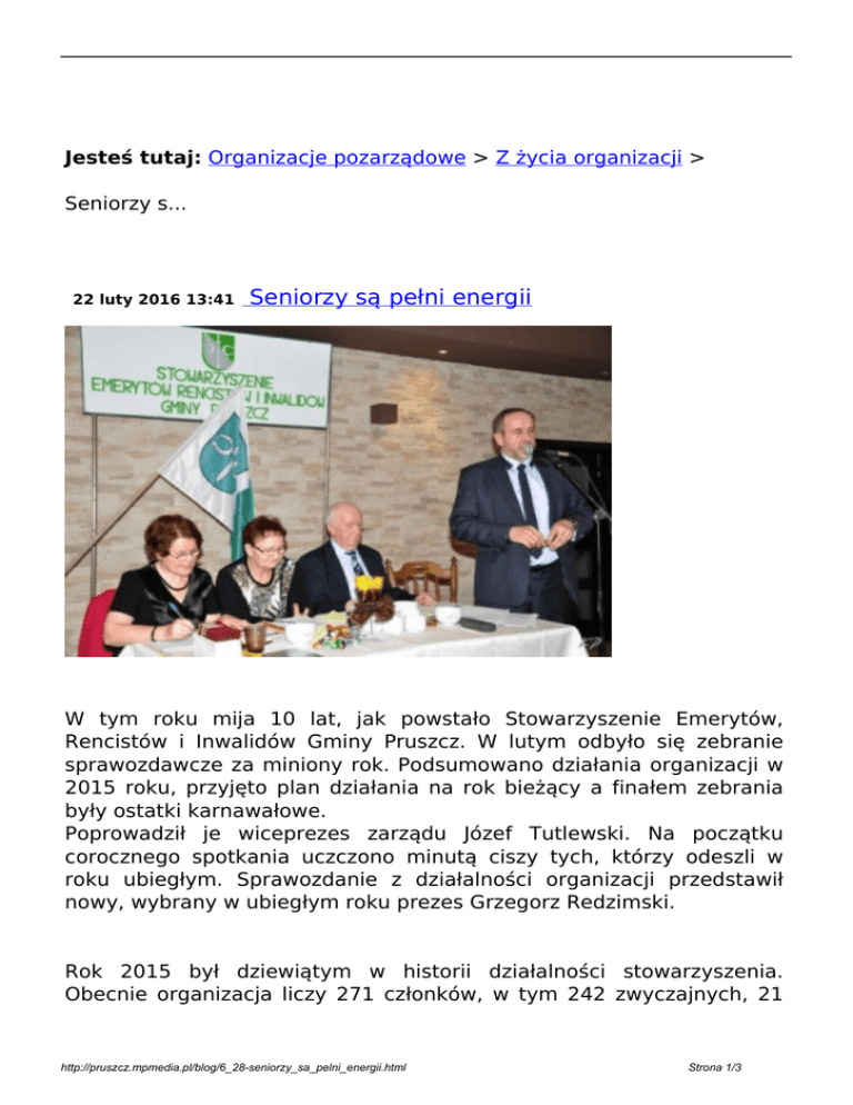 Jesteś tutaj: Organizacje pozarządowe > Z życia organizacji > Seniorzy s... 22 luty 2016 13:41 Seniorzy są pełni energii W tym roku mija 10 lat, jak powstało Stowarzyszenie Emerytów, Rencistów i Inwalidów Gminy Pruszcz. W lutym odbyło się zebranie sprawozdawcze za miniony rok. Podsumowano działania organizacji w 2015 roku, przyjęto plan działania na rok bieżący a finałem zebrania były ostatki karnawałowe. Poprowadził je wiceprezes zarządu Józef Tutlewski. Na początku corocznego spotkania uczczono minutą ciszy tych, którzy odeszli w roku ubiegłym. Sprawozdanie z działalności organizacji przedstawił nowy, wybrany w ubiegłym roku prezes Grzegorz Redzimski. Rok 2015 był dziewiątym w historii działalności stowarzyszenia. Obecnie organizacja liczy 271 członków, w tym 242 zwyczajnych, 21 http://pruszcz.mpmedia.pl/blog/6_28-seniorzy_sa_pelni_energii.html Strona 1/3 wspierających i 8 honorowych. – Miniony rok można udać za udany dla stowarzyszenia, ponieważ udało się nam zrealizować wszystkie planowane zadania a w niektórych działach nawet je przekroczyliśmymówi Grzegorz Redzimski, prezes stowarzyszenia.- Duża w tym zasługa samych członków, którzy chętnie brali udział w planowanych zadaniachdodaje. Seniorzy uczestniczyli w 3 wycieczkach autokarowych, 5 spotkaniach integracyjnych w formie wieczorków tanecznych. Miały miejsce również 3 wyjazdy jednodniowe. Dwa razy chętni wzięli udział w koncertach, które odbyły się latem w Pieczyskach. Były wyjazdy na basen a także turnusy wypoczynkowe w Tleniu. Taką nowością były wczasy w Tleniu i jak zaznaczył prezes w tym roku takich wyjazdów będzie więcej. Seniorzy mieli również możliwość skorzystania z kursu komputerowego, który cieszył się sporym zainteresowaniem. Nie zabrakło tak tradycyjnych imprez jak Andrzejki, spotkanie opłatkowe, Dzień Seniora czy uczestniczenie we mszy św. w maju w Topolnie. -Jeśli chodzi o wycieczki to seniorzy mieli możliwość zwiedzenia Częstochowy, Wieliczki, Uniejowa- mówi Maria Szews, przew. Komisji Kultury i Rekreacji. -Byli również w Warszawie, Sandomierzu, Zamościu, Lublinie. Mile wspominają wyjazd na winobranie do Zielonej Góry- dodaje. Członkowie stowarzyszenia także uczestniczą w różnych zajęciach, które organizują inne organizacje. W GOKSiRze biorą udział w warsztatach plastycznych oraz w zajęciach nowo powstałego chóru. Warto podkreślić fakt, iż stowarzyszenie współpracuje z różnymi organizacjami. Jeśli chodzi o finansowanie różnych imprez organizacja pokrywa koszty ze swoich funduszy oraz dzięki wsparciu miejscowego Banku Spółdzielczego czy też Gminnej Spółdzielni „Samopomoc Chłopska”. W uroczystości wziął udział starosta Franciszek Koszowski, wójt Dariusz Wądołowski, Przewodniczący Rady Gminy Pruszcz Przemysław Sznajdrowski, dyr. GOKSiR-u Mirosław Kopka, dyr. BS Beata Banasiak, prezes GS-u Marcin Kłosowicz, kierownik GBP Aleksandra Rosińska- http://pruszcz.mpmedia.pl/blog/6_28-seniorzy_sa_pelni_energii.html Strona 2/3 Burek, lekarz Danuta Jarosz. Wszyscy goście z uznaniem odnosili się do sprawozdania i życzyli dalszych sukcesów a także nie omieszkali pomóc seniorom w miarę swoich możliwości. W dalszej części zebrania przyjęto wszystkie sprawozdania a także udzielono zarządowi absolutorium i przyjęto plan pracy na rok bieżący. Przyjęto również nowych członków w szeregi stowarzyszenia. Zebranie miało miejsce dwa dni przed zakończeniem karnawału toteż seniorzy postanowili się dobrze zabawić jak to robią zazwyczaj w trakcie wieczorków tanecznych. Do tańca grał Andrzej Smeja. KP „Czas Świecia”, 19 luty 2016 r. FOTORELACJA drukuj Wróć http://pruszcz.mpmedia.pl/blog/6_28-seniorzy_sa_pelni_energii.html Powered by TCPDF (www.tcpdf.org) Strona 3/3