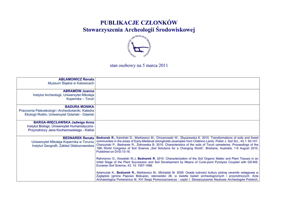 PUBLIKACJE CZŁONKÓW Stowarzyszenia Archeologii Środowiskowej stan osobowy na 5 marca 2011 ABŁAMOWICZ Renata Muzeum Śląskie w Katowicach ABRAMÓW Joanna Instytut Archeologii, Uniwersytet Mikołaja Kopernika – Toruń BADURA MONIKA Pracownia Paleoekologii i Archeobotaniki, Katedra Ekologii Roślin, Uniwersytet Gdański - Gdańsk BARGA-WIĘCŁAWSKA Jadwiga Anna Instytut Biologii, Uniwersytet HumanistycznoPrzyrodniczy Jana Kochanowskiego - Kielce BEDNAREK Renata Bednarek R., Kamiński D., Markiewicz M., Chrzanowski W., Zbyszewska K. 2010. Transformations of soils and forest Uniwersytet Mikołaja Kopernika w Toruniu communities in the areas of Early-Medieval strongholds (examples from Chełmno Land). Polish J. Soil Sci., 43,1: 93-101. Instytut Geografii, Zakład Gleboznawstwa Charzyński P., Bednarek R., Żołnowska B. 2010. Characteristics of the soils of Toruń cemeteries. Proceedings of the 19th World Congress of Soil Science „Soil Solutions for a Changing World”, Brisbane, Australia, 1-6 August 2010, Published on DVD:13-16. Rahmonov O., Kowalski W.J, Bednarek R. 2010. Characterization of the Soil Organic Matter and Plant Tissues in an Initial Stage of the Plant Succession and Soil Development by Means of Curie-point Pyrolysis Coupled with GS-MS. Eurasian Soil Science, 43, 13: 1557-1568. Adamczak K., Bednarek R., Markiewicz M., Michalski M. 2009. Osada ludności kultury późnej ceramiki wstęgowej w Żyglądzie (gmina Papowo Biskupie), stanowisko 26, w świetle badań archeologicznych i przyrodniczych. Acta Archaeologica Pomeranica III, XVI Sesja Pomorzoznawcza - część I. Stowarzyszenie Naukowe Archeologów Polskich, Szczecin: 11-20. Bednarek R., Charzyński P., Kabała C. [tłumaczenie i redakcja]. 2009. Klasyfikacja Zasobów Glebowych Świata. 2006. Aktualizacja 2007. World Reference Base for Soil Resources 2006. Wydawnictwo Naukowe UMK, Toruń. Bednarek R., Dąbrowski M, Świtoniak M. 2009. Antropogeniczne przekształcenia pokrywy glebowej w wybranych typach rzeźby młodoglacjalnej na przykładzie gminy Jeżewo”, Zesz. Probl. Post. Nauk Roln. 540, 2: 139-146. Bednarek R., Komisarek J., Marcinek J., Mocek A., Piaścik H., Skiba S. 2009. Systematyka gleb Polski, wersja pierwsza wydania 5, J. Marcinek, J. Komisarek (red.) Wydawnictwo Uniwersytetu Przyrodniczego w Poznaniu, Poznań. Bednarek R., Markiewicz M. 2009. Ślady zabudowy łużyckiej osady obronnej na stanowisku archeologicznym w Grodnie, gm. Chełmża, na podstawie analizy zawartości fosforu. Archeologia Epok Brązu i Żelaza, Studia i materiały T.1, Wyd. Naukowe UMK, Toruń: 257-270. Kabała C., Bednarek R., Drzymała S., Drewnik M., Marzec M. [opracowanie]. 2009. Klasyfikacja uziarnienia gleb i utworów mineralnych - PTG 2008. Rocz. Glebozn., 60, 2: 5-16. Bednarek R. 2008. Wykorzystanie metod gleboznawczych i paleopedologicznych w badaniach archeologicznych [w:] Człowiek i środowisko przyrodnicze we wczesnym średniowieczu w świetle badań interdyscyplinarnych. W. Chudziak (red.). Wyd. Naukowe UMK, Toruń: 63-106. Bednarek R., Charzyński P. 2008. Problems encountered when classifying podzol soils of Poland using international classification WRB 1998 and 2006. Agrochimija i Gruntoznawstwo 69, Charkiw: 5-9. Bednarek R., Markiewicz M. 2008. Ślady zabudowy łużyckiej osady obronnej na stanowisku archeologicznym w Grodnie, gm. Chełmża, na podstawie analizy zawartości fosforu [w:] Archeologia Epok Brązu i Żelaza, Studia i materiały, 1, J. Gackowski (red.), Toruń: 233-246. Bednarek R. 2007. Znaczenie studiów paleopedologicznych w archeologii środowiskowej. [w:] Środowisko – Człowiek – Cywilizacja, 1, M. Makohonienko, D. Makowiecki, Z. Kurnatowska (red.), Bogucki Wydawnictwo Naukowe, Poznań: 7192. Bednarek R., Markiewicz M. 2007. Ślady zabudowy osady obronnej ludności kultury łużyckiej w Grodnie, gm. Chełmża (stan. 6), na podstawie analizy zawartości fosforu. [w:] Archeologia Epok Brązu i Żelaza, Studia i materiały, 1, J. Gackowski (red.), Toruń: 233-246. Bednarek R., Markiewicz M. 2007. Zawartość fosforu w glebach jako wskaźnik dawnej działalności człowieka na wczesnośredniowiecznych grodziskach w Pokrzydowie i Gronowie (Pojezierze Chełmińsko-Dobrzyńskie) [w:] Zapis działalności człowieka w środowisku przyrodniczym, 3, E. Smolska, P. Szwarczewski (red.), Wyd. SWPR, Warszawa: 714. Bednarek R., Sewerniak P., Gruba R. 2007. Analiza porównawcza czarnych ziem i gleb murszastych na terenie Brodnickiego Parku Krajobrazowego. [w:] Ochrona i zagospodarowanie Drwęcy. T.1 (red. W. Marszelewski, L. Kozłowski), UMK, Toruń: 19-30. Charzyński P., Bednarek R., Hulisz P. 2007. Pozycja systematyczna polskich gleb w Miedzynarodowej Klasyfikacji WRB 2006. Rocz. Glebozn. 58, 3/4: 52-58. Bednarek R., Jankowski M. 2006. Gleby. [w:] Toruń i jego okolice. Monografia przyrodnicza. Wyd. UMK, Toruń: 153176. Bednarek R., Markiewicz M. 2006.Rekonstrukcja granic dawnych kultur na podstawie badań właściwości gleb. Prace Komisji Krajobrazu Kulturowego PTG nr 5 „Granice i ich rola w krajobrazach kulturowych”, J.Plit [red.]. KKK PTG, Oddz. Katowicki PTG, Sosnowiec: 127-137. Bednarek R., Charzyński P., Kwiatkowska A. 2006.Classification of Podzols in 1998 and 2006 Editions of World Reference Base Soil Classification Systems from the Polish Point of View. [w:] 18th World Congress of Soil Science July 9-15, 2006 – Philadelphia, Pennsylvania, USA. Bednarek R., Sewerniak P., Gruba R. 2006. Genesis, properties and use value of black earths mucky soils. [w:] Macro and Trace Elements, 23rd Workshop, 27 September 2006, Jena: 700-705. Bednarek R., Pokojska U. 2005. Profesor Zbigniew Prusinkiewicz – uczony i nauczyciel (1923-2004). Rocz. Glebozn. 56, 1/2: 191-195. Bednarek R., Sewerniak P., Rutkowski L. 2005. The causes of soil and vegetation variability in the area of designed „Dybowo” nature reserve near Toruń. Ecological Questions 6: 27-36. Charzyński P., Hulisz P., Bednarek R. 2005. Di