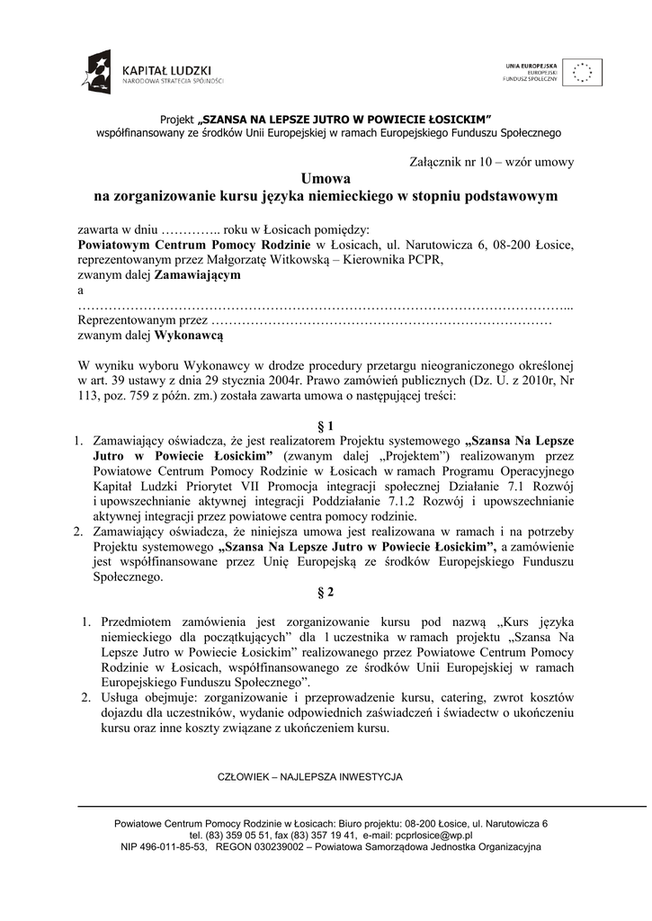 Projekt „SZANSA NA LEPSZE JUTRO W POWIECIE ŁOSICKIM” współfinansowany ze środków Unii Europejskiej w ramach Europejskiego Funduszu Społecznego Załącznik nr 10 – wzór umowy Umowa na zorganizowanie kursu języka niemieckiego w stopniu podstawowym zawarta w dniu ………….. roku w Łosicach pomiędzy: Powiatowym Centrum Pomocy Rodzinie w Łosicach, ul. Narutowicza 6, 08-200 Łosice, reprezentowanym przez Małgorzatę Witkowską – Kierownika PCPR, zwanym dalej Zamawiającym a …………………………………………………………………………………………………... Reprezentowanym przez …………………………………………………………………… zwanym dalej Wykonawcą W wyniku wyboru Wykonawcy w drodze procedury przetargu nieograniczonego określonej w art. 39 ustawy z dnia 29 stycznia 2004r. Prawo zamówień publicznych (Dz. U. z 2010r, Nr 113, poz. 759 z późn. zm.) została zawarta umowa o następującej treści: §1 1. Zamawiający oświadcza, że jest realizatorem Projektu systemowego „Szansa Na Lepsze Jutro w Powiecie Łosickim” (zwanym dalej „Projektem”) realizowanym przez Powiatowe Centrum Pomocy Rodzinie w Łosicach w ramach Programu Operacyjnego Kapitał Ludzki Priorytet VII Promocja integracji społecznej Działanie 7.1 Rozwój i upowszechnianie aktywnej integracji Poddziałanie 7.1.2 Rozwój i upowszechnianie aktywnej integracji przez powiatowe centra pomocy rodzinie. 2. Zamawiający oświadcza, że niniejsza umowa jest realizowana w ramach i na potrzeby Projektu systemowego „Szansa Na Lepsze Jutro w Powiecie Łosickim”, a zamówienie jest współfinansowane przez Unię Europejską ze środków Europejskiego Funduszu Społecznego. §2 1. Przedmiotem zamówienia jest zorganizowanie kursu pod nazwą „Kurs języka niemieckiego dla początkujących” dla 1 uczestnika w ramach projektu „Szansa Na Lepsze Jutro w Powiecie Łosickim” realizowanego przez Powiatowe Centrum Pomocy Rodzinie w Łosicach, współfinansowanego ze środków Unii Europejskiej w ramach Europejskiego Funduszu Społecznego”. 2. Usługa obejmuje: zorganizowanie i przeprowadzenie kursu, catering, zwrot kosztów dojazdu dla uczestników, wydanie odpowiednich zaświadczeń i świadectw o ukończeniu kursu oraz inne koszty związane z ukończeniem kursu. CZŁOWIEK – NAJLEPSZA INWESTYCJA Powiatowe Centrum Pomocy Rodzinie w Łosicach: Biuro projektu: 08-200 Łosice, ul. Narutowicza 6 tel. (83) 359 05 51, fax (83) 357 19 41, e-mail: [email protected] NIP 496-011-85-53, REGON 030239002 – Powiatowa Samorządowa Jednostka Organizacyjna Projekt „SZANSA NA LEPSZE JUTRO W POWIECIE ŁOSICKIM” współfinansowany ze środków Unii Europejskiej w ramach Europejskiego Funduszu Społecznego 3. 4. 5. 6. 7. Czas trwania kursu: 120 godz. lekcyjnych. Liczba osób objętych usługą: 1 uczestnik. Termin wykonania usługi Strony ustalają na okres od : ………………. do ……………. Miejsce organizacji usługi ……………………………………..………………………….. Wykonawca zobowiązany jest wykonać przedmiot Umowy zgodnie z obowiązującymi w tym zakresie przepisami prawa. 8. Zakres świadczeń Wykonawcy określony jest w SIWZ oraz ofercie Wykonawcy, złożonej w postępowaniu na przedmiotową usługę. 9. Wykonawca zobowiązuje się do udzielania i udostępniania Zamawiającemu rzetelnych informacji i wyjaśnień oraz niezbędnych dokumentów w okresie obowiązywania Umowy na każde jego żądanie. §3 1. Wykonawca zobowiązany jest do: 1) Przeprowadzenia kursu zgodnie z tematyką określoną w ofercie. 2) Zorganizowania i przeprowadzenia usługi zgodnie z wymogami SIWZ i zapisami zwartymi w ofercie Wykonawcy. 3) Pokrycia kosztów związanych z dojazdem uczestnika. 4) Zapewnienia jednego opiekuna grupy odpowiedzialnego za prawidłowy przebieg realizacji usługi, który będzie reprezentował interesy uczestników kursu. 5) Przedłożenia Zamawiającemu najpóźniej na 7 dni przed rozpoczęciem kursu szczegółowego harmonogramu zajęć. Harmonogram powinien zawierać daty, godziny, miejsce i zakres tematyczny poszczególnych godzin zajęć; 6) Prowadzenia dziennika zajęć zawierającego listę obecności, daty, godziny i zakres tematyczny poszczególnych zajęć w ramach kursu oraz prowadzenia listy odbioru wyżywienia, listy odbioru materiałów szkoleniowych, zwrotu kosztów dojazdu oraz certyfikatu o ukończeniu szkolenia 7) Przekazania Zamawiającemu w ciągu 7 dni od zakończenia usługi następujących dokumentów: oryginału list obecności, zawierających: imię i nazwisko, datę oraz podpis uczestnika. dziennik zajęć z przeprowadzonego szkolenia, list potwierdzających odbiór materiałów szkoleniowych, cateringu, zwrotu kosztów dojazdu oraz list odbioru zaświadczeń o ukończeniu szkolenia, rejestru wydanych zaświadczeń o ukończeniu szkolenia, kserokopii zaświadczeń o ukończeniu szkolenia, kserokopii świadectwa kwalifikacyjnego. nośnika CD/DVD zawierającego zdjęcia dokumentujące przebieg usługi. CZŁOWIEK – NAJLEPSZA INWESTYCJA Powiatowe Centrum Pomocy Rodzinie w Łosicach: Biuro projektu: 08-200 Łosice, ul. Narutowicza 6 tel. (83) 359 05 51, fax (83) 357 19 41, e-mail: [email protected] NIP 496-011-85-53, REGON 030239002 – Powiatowa Samorządowa Jednostka Organizacyjna Projekt „SZANSA NA LEPSZE JUTRO W POWIECIE ŁOSICKIM” współfinansowany ze środków Unii Europejskiej w ramach Europejskiego Funduszu Społecznego Jednego kompletu materiałów i pomocy szkoleniowych do archiwizacji dokumentacji, faktury za realizację całego zamówienia, 8) Oznakowania miejsca, w którym będzie prowadzony kurs poprzez umieszczenie plakatów informacyjnych dotyczących projektu, które otrzyma od Zamawiającego po podpisaniu umowy o współfinansowaniu projektu ze środków Unii Europejskiej w ramach Europejskiego Funduszu Społecznego. 9) Niezwłocznego zawiadomienia Zamawiającego o każdym 