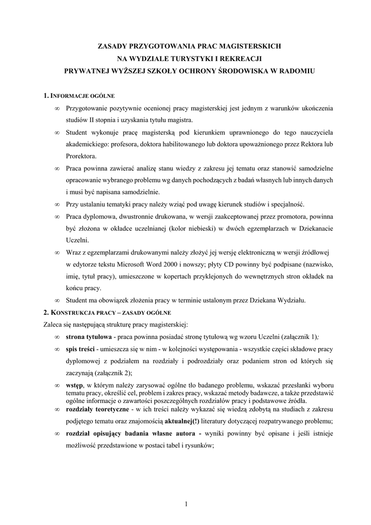 ZASADY PRZYGOTOWANIA PRAC MAGISTERSKICH NA WYDZIALE TURYSTYKI I REKREACJI PRYWATNEJ WYŻSZEJ SZKOŁY OCHRONY ŚRODOWISKA W RADOMIU 1. INFORMACJE OGÓLNE • Przygotowanie pozytywnie ocenionej pracy magisterskiej jest jednym z warunków ukończenia studiów II stopnia i uzyskania tytułu magistra. • Student wykonuje pracę magisterską pod kierunkiem uprawnionego do tego nauczyciela akademickiego: profesora, doktora habilitowanego lub doktora upoważnionego przez Rektora lub Prorektora. • Praca powinna zawierać analizę stanu wiedzy z zakresu jej tematu oraz stanowić samodzielne opracowanie wybranego problemu wg danych pochodzących z badań własnych lub innych danych i musi być napisana samodzielnie. • Przy ustalaniu tematyki pracy należy wziąć pod uwagę kierunek studiów i specjalność. • Praca dyplomowa, dwustronnie drukowana, w wersji zaakceptowanej przez promotora, powinna być złożona w okładce uczelnianej (kolor niebieski) w dwóch egzemplarzach w Dziekanacie Uczelni. • Wraz z egzemplarzami drukowanymi należy złożyć jej wersję elektroniczną w wersji źródłowej w edytorze tekstu Microsoft Word 2000 i nowszy; płyty CD powinny być podpisane (nazwisko, imię, tytuł pracy), umieszczone w kopertach przyklejonych do wewnętrznych stron okładek na końcu pracy. • Student ma obowiązek złożenia pracy w terminie ustalonym przez Dziekana Wydziału. 2. KONSTRUKCJA PRACY – ZASADY OGÓLNE Zaleca się następującą strukturę pracy magisterskiej: • strona tytułowa - praca powinna posiadać stronę tytułową wg wzoru Uczelni (załącznik 1); • spis treści - umieszcza się w nim - w kolejności występowania - wszystkie części składowe pracy dyplomowej z podziałem na rozdziały i podrozdziały oraz podaniem stron od których się zaczynają (załącznik 2); • • wstęp, w którym należy zarysować ogólne tło badanego problemu, wskazać przesłanki wyboru tematu pracy, określić cel, problem i zakres pracy, wskazać metody badawcze, a także przedstawić ogólne informacje o zawartości poszczególnych rozdziałów pracy i podstawowe źródła. rozdziały teoretyczne - w ich treści należy wykazać się wiedzą zdobytą na studiach z zakresu podjętego tematu oraz znajomością aktualnej(!) literatury dotyczącej rozpatrywanego problemu; • rozdział opisujący badania własne autora - wyniki powinny być opisane i jeśli istnieje możliwość przedstawione w postaci tabel i rysunków; 1 • dyskusja / wnioski lub zakończenie - należy wskazać na stopień realizacji celów badań, oraz zweryfikować postawione hipotezy badawcze i sformułować wnioski wynikające badań; • streszczenie - nie dłuższe niż na jedną stronę; należy umieścić w nim podstawowe informacje o pracy - opisać cel, tezy pracy oraz wnioski; • spis literatury - powinien zawierać tylko te pozycje, na które autor powoływał się w tekście przynajmniej raz; w spisie literatury muszą znaleźć się także adresy stron internetowych wykorzystywanych przy pisaniu pracy; • aneks - zawiera ponumerowane załączniki; • kolejne rozdziały powinny rozpoczynać się od nowej strony; • praca powinna być drukowana dwustronnie z uwzględnieniem wymagań redakcyjnych. 3. WYMAGANIA REDAKCYJNE • praca powinna być napisana przy użyciu edytora Microsoft Word 2000 i nowszy; wymagany odstęp między wierszami wynosi 1,5, rodzaj czcionki - Times New Roman, wielkość czcionki – 12 lub 13, marginesy lustrzane (lewy margines 3cm, prawy 2cm), marginesy górny i dolny 2,5cm; • na końcu wersów nie powinny znajdować się spójniki oraz przyimki; • tekst powinien być wyjustowany (wyrównany do prawej i lewej strony); • numeracja stron prowadzona od strony tytułowej, umieszczona na dole i wyśrodkowana (na stronach tytułowych nie umieszcza się numerów); • numeracja rozdziałów i podrozdziałów hierarchiczna, tytuł rozdziału pogrubiona czcionka 16, tytuł podrozdziału pogrubiona czcionka 14; • tabele (załącznik 3): - w tekście należy umieścić odniesienie do zamieszczonej tabeli, następnie analizę oraz interpretację informacji wynikających z danych zawartych w tabeli, - tabele w całej pracy powinny być opisywane w jednolity sposób, - tabele powinny być jednolite pod względem konstrukcji, - każda tabel powinna posiadać: - numer (np. Tabela 1.) - nad tabelą, obowiązuje jedna numeracja tabel w całej pracy, czcionka pogrubiona, - tytuł - umieszczony za numerem tabeli, wyrównany do lewej krawędzi tabeli, zapisany czcionką (bez pogrubienia) jak pozostały tekst, bez kropki na końcu, - źródło - zapisane pod tabelą (czcionka 10) w formie powołania się na piśmiennictwo (należy podać autora i rok wydania publikacji); w przypadku tabel sporządzonych w oparciu o badania własne - nie trzeba podawać źródła, • rysunki (załącznik 4): 2 - w pracy należy umieścić wyłącznie rysunki; bez potrzeby różnicowania części graficznej na wykresy, ryciny, fotografie, schematy, mapy itp., - w tekście należy umieścić odniesienie do zamieszczonego rysunku, następnie analizę i interpretację jego treści, - rysunki w całej pracy powinny być opisywane w jednolity sposób, - każdy rysunek powinien posiadać: - numer (np. Ryc. 1), umieszczony pod rysunkiem; bez kropki na końcu; obowiązuje jedna numeracja w całej pracy, czcionka pogrubiona, - tytuł - umieszczony za numerem rysunku, wyrównany do lewej krawędzi rysunku, zapisany czcionką (bez pogrubienia) jak pozostały tekst, bez kropki na końcu, - źródło - zapisane pod tytułem rysunku (czcionka 10) w formie powołania się na piśmiennictwo (należy podać autora i rok wydania publikacji); w przypadku rysunków sporządzonych w oparciu o badania własne - nie trzeba podawać źródła. 4. PRZYPISY (POWOŁANIE SIĘ NA LITERATURĘ) • wydawnictwo zwarte - opracowanie jednego autora: w tekście w powołaniach na piśmiennictwo podaje się nazwisko oraz rok wydania,