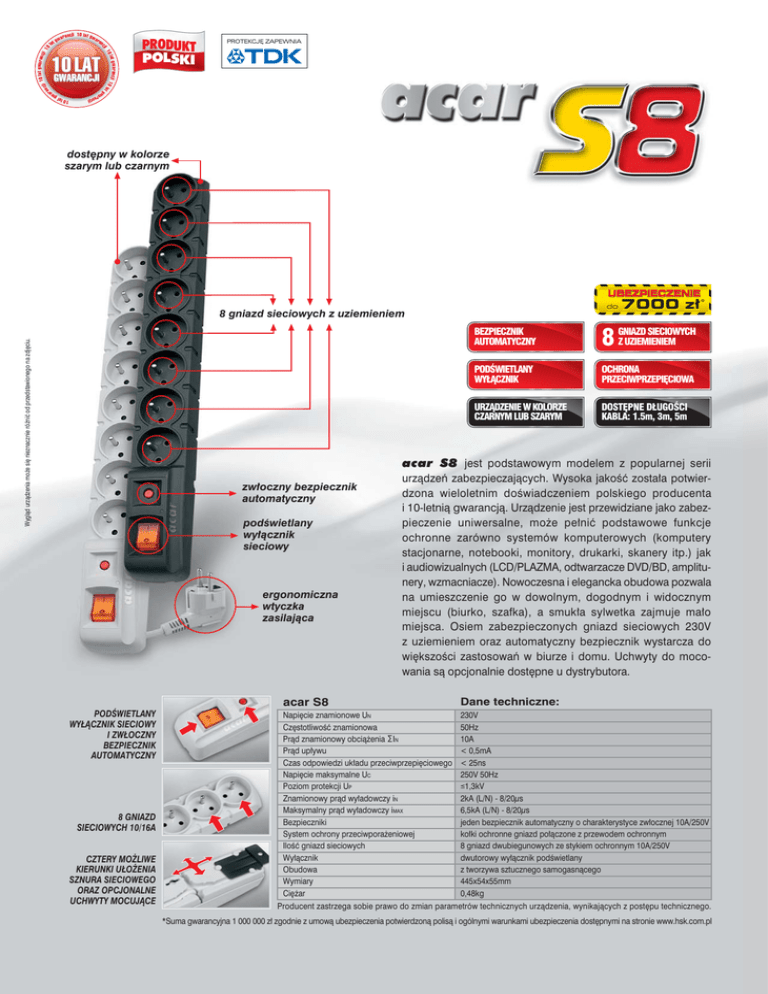10 c ji ji 10 la t g w ar an 10 LAT war an cj i 1 0 g war an nc ar a l at g GWARANCJI PRODUKT POLSKI PROTEKCJÊ ZAPEWNIA g ra la t nc 0 lat ji 1 gw 0 i 1 cj la t w ar an cj i 10 l at gw a dostêpny w kolorze szarym lub czarnym UBEZPIECZENIE do Wygl¹d urz¹dzenia mo¿e siê nieznacznie ró¿niæ od przedstawionego na zdjêciu. 8 gniazd sieciowych z uziemieniem 7000 z³* BEZPIECZNIK AUTOMATYCZNY SIECIOWYCH Z UZIEMIENIEM 8 GNIAZD PODWIETLANY WY£¥CZNIK OCHRONA PRZECIWPRZEPIÊCIOWA URZ¥DZENIE W KOLORZE CZARNYM LUB SZARYM DOSTÊPNE D£UGOCI KABLA: 1.5m, 3m, 5m acar S8 jest podstawowym modelem z popularnej serii zw³oczny bezpiecznik automatyczny podwietlany wy³¹cznik sieciowy ergonomiczna wtyczka zasilaj¹ca PODWIETLANY WY£¥CZNIK SIECIOWY I ZW£OCZNY BEZPIECZNIK AUTOMATYCZNY 8 GNIAZD SIECIOWYCH 10/16A CZTERY MO¯LIWE KIERUNKI U£O¯ENIA SZNURA SIECIOWEGO ORAZ OPCJONALNE UCHWYTY MOCUJ¥CE urz¹dzeñ zabezpieczaj¹cych. Wysoka jakoæ zosta³a potwierdzona wieloletnim dowiadczeniem polskiego producenta i 10-letni¹ gwarancj¹. Urz¹dzenie jest przewidziane jako zabezpieczenie uniwersalne, mo¿e pe³niæ podstawowe funkcje ochronne zarówno systemów komputerowych (komputery stacjonarne, notebooki, monitory, drukarki, skanery itp.) jak i audiowizualnych (LCD/PLAZMA, odtwarzacze DVD/BD, amplitunery, wzmacniacze). Nowoczesna i elegancka obudowa pozwala na umieszczenie go w dowolnym, dogodnym i widocznym miejscu (biurko, szafka), a smuk³a sylwetka zajmuje ma³o miejsca. Osiem zabezpieczonych gniazd sieciowych 230V z uziemieniem oraz automatyczny bezpiecznik wystarcza do wiêkszoci zastosowañ w biurze i domu. Uchwyty do mocowania s¹ opcjonalnie dostêpne u dystrybutora. acar S8 Dane techniczne: Napiêcie znamionowe UN Czêstotliwoæ znamionowa Pr¹d znamionowy obci¹¿enia SIN Pr¹d up³ywu Czas odpowiedzi uk³adu przeciwprzepiêciowego 230V Napiêcie maksymalne UC Poziom protekcji UP 250V 50Hz £1,3kV Znamionowy pr¹d wy³adowczy iN Maksymalny pr¹d wy³adowczy iMAX Bezpieczniki 2kA (L/N) - 8/20µs 6,5kA (L/N) - 8/20µs jeden bezpiecznik automatyczny o charakterystyce zw³ocznej 10A/250V System ochrony przeciwpora¿eniowej Iloæ gniazd sieciowych Wy³¹cznik Obudowa Wymiary ko³ki ochronne gniazd po³¹czone z przewodem ochronnym 8 gniazd dwubiegunowych ze stykiem ochronnym 10A/250V dwutorowy wy³¹cznik podwietlany z tworzywa sztucznego samogasn¹cego 445x54x55mm 0,48kg Ciê¿ar 50Hz 10A < 0,5mA < 25ns Producent zastrzega sobie prawo do zmian parametrów technicznych urz¹dzenia, wynikaj¹cych z postêpu technicznego. *Suma gwarancyjna 1 000 000 z³ zgodnie z umow¹ ubezpieczenia potwierdzon¹ polis¹ i ogólnymi warunkami ubezpieczenia dostêpnymi na stronie www.hsk.com.pl