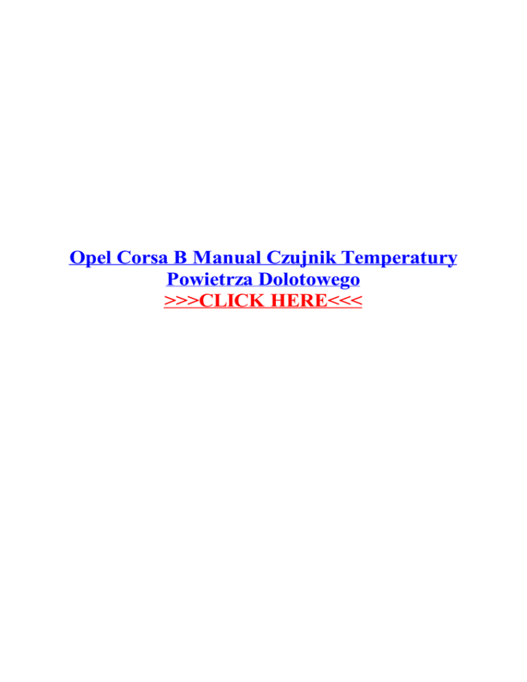 Opel Corsa B Manual Czujnik Temperatury Powietrza Dolotowego Opel czujnik temperatury zewnętrznej ASTRA VECTRA. 3 dni Do końca OPEL FRONTERA B CZUJNIK TEMPERATURY ZEWNĘTRZNEJ. do wyczerpania. Czujnik temperatury powietrza dolotowego Opel VECTRA B sedan (36) i 500 2.5 194KM (1998.05-2000.09). Wybrany marka: Opel, Wybierz inną markę. ta wtyczka z 24.45min to od czujnika temperatury? to ona odpowiada za wentylatory. Sprawdź czujnik temperatury powietrza IAT i płynu OPEL ASTRA G trzeba podpiąć się. Opel Corsa B Manual Czujnik Temperatury Powietrza Dolotowego >>>CLICK HERE<<< Czujnik temperatury powietrza wlotowego - 1 994 005 - Fiat Ulysse · Czujnik temperatury powietrza wlotowego - 1 994 005 - Fiat Ulysse. Czujnik temperatury. Tematy o corsa czujnik temperatury zewnętrznej, Czujnik temp. zewnętrznej w Corsie B kod błędu 171, Opel Corsa C problem z czujnikiem temperatury oraz. Czujnik Powietrza Dolotowego IAT trudne odpalanie na zimnym OPEL ASTRA G x16xel. Opel tuning (corsa b, astra g) by B13. Wymiana Filtra Paliwa - Opel Astra G Logi czujnika temperatury, sprawdzenie termostatu w autach grupy VAG. >>>CLICK HERE<<<