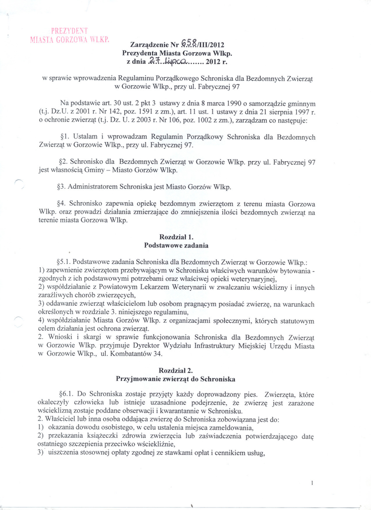 PREZYDE\T MIAST:l GORZOWA WLKP. Zarzadzenie Nr ~.~8./III/2012 Prezydenta Miasta Gorzowa Wlkp. z dnia .~:f..~ 2012r. w sprawie wprowadzenia Regulaminu Porzadkowego Schroniska dla Bezdomnych Zwierzat w Gorzowie Wlkp., przy ul. Fabrycznej 97 Na podstawie art. 30 ust. 2 pkt 3 ustawy z dnia 8 marca 1990 o samorzadzie gminnym (t.j. Dz.U. z 2001 r. Nr 142, poz. 1591 z zm.), art. II ust. 1 ustawy z dnia 21 sierpnia 1997 r. o ochronie zwierzat (t.j. Dz. U. z 2003 r. Nr 106, poz. 1002 z zm.), zarzadzam co nastepuje: §1. Ustalam i wprowadzam Regulamin Porzadkowy Schroniska dla Bezdomnych Zwierzat w Gorzowie Wlkp., przy ul. Fabrycznej 97. §2. Schronisko dla Bezdomnych Zwierzat w Gorzowie Wlkp. przy ul. Fabrycznej 97 jest wlasnoscia Gminy - Miasto Gorzów Wlkp. ..-.. §3. Administratorem Schroniska jest Miasto Gorzów Wlkp. §4. Schronisko zapewnia opieke bezdomnym zwierzetom z terenu miasta Gorzowa Wlkp. oraz prowadzi dzialania zmierzajace do zmniejszenia ilosci bezdomnych zwierzat na terenie miasta Gorzowa Wlkp. Rozdzial 1. Podstawowe zadania §5.1. Podstawowe zadania Schroniska dla Bezdomnych Zwierzat w Gorzowie Wlkp.: l) zapewnienie zwierzetom przebywajacym w Schronisku wlasciwych warunków bytowania zgodnych z ich podstawowymi potrzebami oraz wlasciwej opieki weterynaryjnej, 2) wspóldzialanie z Powiatowym Lekarzem Weterynarii w zwalczaniu wscieklizny i innych zarazliwych chorób zwierzecych, 3) oddawanie zwierzat wlascicielom lub osobom pragnacym posiadac zwierze, na warunkach okreslonych w rozdziale 3. niniejszego regulaminu, 4) wspóldzialanie Miasta Gorzów Wlkp. z organizacjami spolecznymi, których statutowym celem dzialania jest ochrona zwierzat. 2. Wnioski i skargi w sprawie funkcjonowania Schroniska dla Bezdomnych Zwierzat w Gorzowie Wlkp. przyjmuje Dyrektor Wydzialu Infrastruktury Miejskiej Urzedu Miasta w Gorzowie Wlkp., ul. Kombatantów 34. Rozdzial 2. Przyjmowanie zwierzat do Schroniska §6.1. Do Schroniska zostaje przyjety kazdy doprowadzony pies. Zwierzeta, które okaleczyly czlowieka lub istnieje uzasadnione podejrzenie, ze zwierze jest zarazone wscieklizna zostaje poddane obserwacji i kwarantannie w Schronisku. 2. Wlasciciel lub inna osoba oddajaca zwierze do Schroniska zobowiazana jest do: 1) okazania dowodu osobistego, w celu ustalenia miejsca zameldowania, 2) przekazania ksiazeczki zdrowia zwierzecia lub zaswiadczenia potwierdzajacego date ostatniego szczepienia przeciwko wsciekliznie, 3). uiszczenia stosownej oplaty zgodnej ze stawkami oplat i cennikiem uslug, 4) podpisania oswiadczenia (zalacznik nr l do Zarzadzenia Prezydenta Miasta), 5) udzielenia informacji dotyczacych zwierzecia, a mianowicie: powód oddania, stan zdrowia i przebyte choroby oraz cechy charakteru, co ulatwi dalsze postepowanie ze ZWIerzeCIem. r- 3.Schronisko przyjmuje zgloszenia dotyczace zwierzat telefoniczne lub osobiscie w siedzibie Schroniska przy ul. Fabrycznej 97 w Gorzowie Wlkp. l) informacje o psach i kotach, które ulegly wypadkowi ulicznemu przekazywane sa do Wydzialu Infrastruktury Miejskiej Urzedu Miasta w Gorzowie Wlkp. lub bezposrednio do Schroniska, 2) wszelkie informacje dotyczace bezdomnych zwierzat oraz okolicznosci dotyczacych zdarzen z nimi zwiazanych zglaszane przez mieszkanców Gorzowa Wlkp. przekazywane sa do Wydzialu Infrastruktury Miejskiej Urzedu Miasta w Gorzowie Wlkp. lub bezposrednio do Schroniska. 4. Zwierzeta przyjmowane sa przez pracowników Schroniska. 5. Kazde zwierze przyjete do Schroniska zostaje wpisane do rejestru z uwidocznieniem daty przyjecia, danych osoby doprowadzajacej, okolicznosci, w jakich znaleziono zwierze i innych uwag. 6. Pracownik Schroniska dokonuje ogledzin doprowadzonego zwierzecia, a w przypadku potrzeby wzywa lekarza weterynarii, który podejmuje decyzje o dalszym postepowaniu ze ZWIerzeCIem. 7. Zwierzeta przyjmowane do Schroniska zostaja zarejestrowane i poddawane sa 14-dniowej kwarantannie w oddzielnym pomieszczeniu. 8. Suki z cieczka umieszczane sa, w miare mozliwosci, w oddzielnych boksach. Rozdzial 3 Przetrzymywanie zwierzat w Schronisku i ich wydawanie §7.1. Doprowadzone zwierzeta do Schroniska podlegaja badaniom klinicznym. W zaleznosci od zródla ich pochodzenia i posiadanej dokumentacji poddaje sie je dezynsekcji, odrobaczeniu i szczepieniu przeciwko chorobom wirusowym oraz przeciwko wsciekliznie. 2. Czynnosci wymienione w ust. 1 nie dotycza zwierzat: l) zarazliwie chorych, 2) po wypadkach, nie rokujacych nadziei na wyzdrowienie, 3) starych, niedoleznych, cierpiacych - bez szans na adopcje, 4) bardzo agresywnych, stwarzajacych zagrozenie dla ludzi i zwierzat. 3. Zwierzeta wymienione w ust. 2 podlegaja uspieniu, na wyrazne zalecenie lekarza weterynarii. 4. Uspienia zwierzat, o których mowa w ust. 3, dokonuje lekarz weterynarii w sposób humanitarny, zgodnie z obowiazujacymi przepisami na terenie Schroniska bez obecnosci osób postronnych i innych zwierzat. Fakt i przyczyne uspienia zwierzecia odnotowuje w rejestrze zwierzat padlych i poddanych eutanazji. 5. Wlasciciel zwierzecia ma prawo do jego odebrania pod warunkiem udowodnienia wlasnosci i oplacenia kosztów pobytu w Schronisku, zgodnie z cennikiem uslug swiadczonych przez Schronisko. 6. Zwierzeta przebywajace w Schronisku moga byc oddawane nowym wlascicielom nie wczesniej niz po uplywie 14 dni od dnia przyjecia zwierzecia do Schroniska. W wyjatkowych sytuacjach, wg decyzji pracownika Schroniska, zwierzeta moga byc oddawane nowym wlascicielom przed uplywem 14 dni pod warunkiem, ze osoba nabywajaca zwierze zlozy na 2 pismie zobowiazanie zwrotu zwierzecia w przypadku zgloszenia sie w ciagu 14 dni, od dnia przyjecia zwierzecia do Schroniska, osoby posiadajacej prawo do tego zwierzecia. 7. Zwierzeta moga byc wydawane wlascicielom lub nowo nabywajacym po zaszczepieniu przeciwko wsciekliznie i po zbadaniu przez lekarza weterynarii. 8. Osoba nabywajaca zwierze zobowiazana jest do: 1) przedstawienia dowodu tozsamosci celem ujecia jej w rejestrze osób bioracych zwierzeta do adopcji, 2) potw