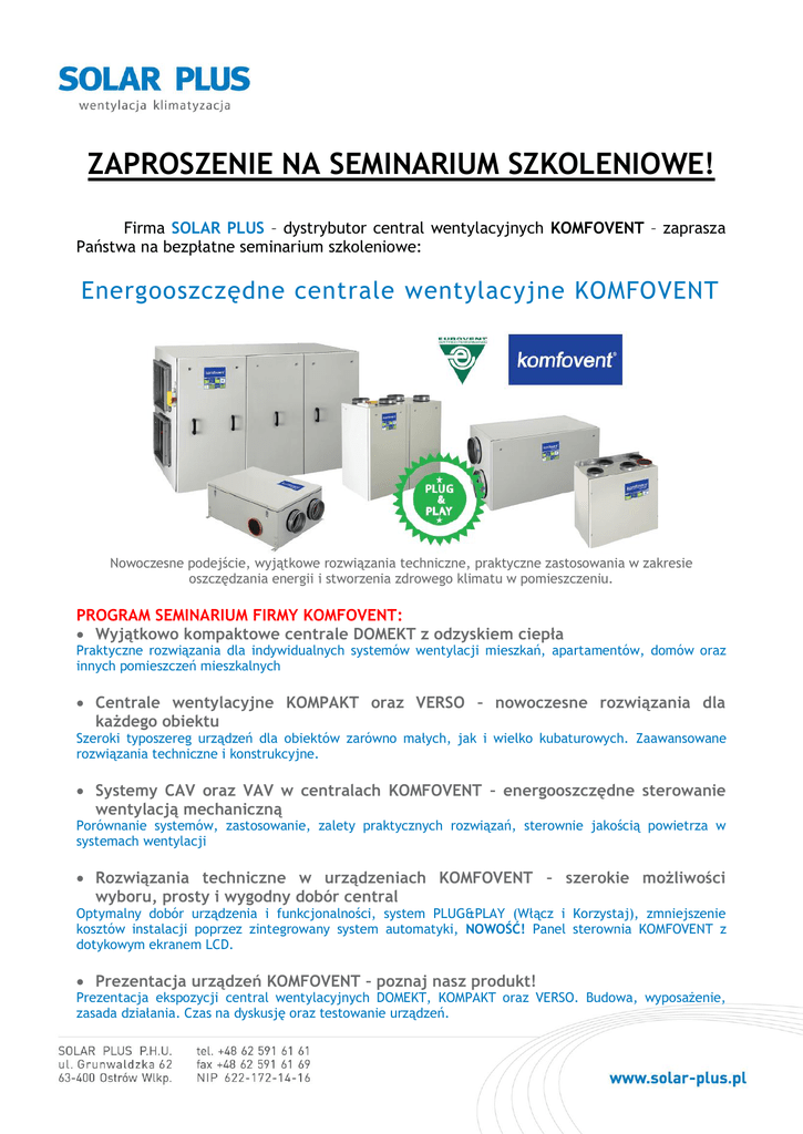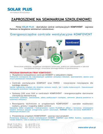 ZAPROSZENIE NA SEMINARIUM SZKOLENIOWE! Firma SOLAR PLUS – dystrybutor central wentylacyjnych KOMFOVENT – zaprasza Państwa na bezpłatne seminarium szkoleniowe: Energooszczędne centrale wentylacyjne KOMFOVENT Nowoczesne podejście, wyjątkowe rozwiązania techniczne, praktyczne zastosowania w zakresie oszczędzania energii i stworzenia zdrowego klimatu w pomieszczeniu. PROGRAM SEMINARIUM FIRMY KOMFOVENT: Wyjątkowo kompaktowe centrale DOMEKT z odzyskiem ciepła Praktyczne rozwiązania dla indywidualnych systemów wentylacji mieszkań, apartamentów, domów oraz innych pomieszczeń mieszkalnych Centrale wentylacyjne KOMPAKT oraz VERSO – nowoczesne rozwiązania dla każdego obiektu Szeroki typoszereg urządzeń dla obiektów zarówno małych, jak i wielko kubaturowych. Zaawansowane rozwiązania techniczne i konstrukcyjne. Systemy CAV oraz VAV w centralach KOMFOVENT – energooszczędne sterowanie wentylacją mechaniczną Porównanie systemów, zastosowanie, zalety praktycznych rozwiązań, sterownie jakością powietrza w systemach wentylacji Rozwiązania techniczne w urządzeniach KOMFOVENT – szerokie możliwości wyboru, prosty i wygodny dobór central Optymalny dobór urządzenia i funkcjonalności, system PLUG&PLAY (Włącz i Korzystaj), zmniejszenie kosztów instalacji poprzez zintegrowany system automatyki, NOWOŚĆ! Panel sterownia KOMFOVENT z dotykowym ekranem LCD. Prezentacja urządzeń KOMFOVENT – poznaj nasz produkt! Prezentacja ekspozycji central wentylacyjnych DOMEKT, KOMPAKT oraz VERSO. Budowa, wyposażenie, zasada działania. Czas na dyskusję oraz testowanie urządzeń. Firma SOLAR PLUS – dystrybutor firmy K-Flex – zaprasza Państwa na bezpłatne seminarium szkoleniowe. K-Flex oferuje izolacje techniczne z kauczuku syntetycznego przeznaczone dla: chłodnictwa, klimatyzacji, wentylacji, ogrzewnictwa w tym techniki solarnej, instalacji sanitarnych, przemysłowych, chemicznych oraz instalacji gazów technicznych. Ponadto firma K-Flex oferuje materiały do walki z hałasem i innych wszechstronnych zastosowań akustycznych. TERMIN: 08.04.2011r. (Piątek) Siedziba SOLAR PLUS Ul. Grunwaldzka 62 63-400 Ostrów Wielkopolski HARMONOGRAM: 08.30-09.30 Prezentacja produktów firmy K-Flex 09.30-10.00 Przerwa na kawę 10.00-12.00 Prezentacja produktów firmy Komfovent 12.00-12.30 Przerwa na lunch 12.30-14.00 Prezentacja ekspozycji central Komfovent 14.00-15.00 Czas na dyskusje oraz testowanie urządzeń ZGŁOSZENIE DO UDZIAŁU Jeśli link nie działa, napisz e-mail ze zgłoszeniem na adres: [email protected] Uwaga! Uczestnictwo w seminarium jest bezpłatne. Ilość miejsc ograniczona - decyduje kolejność zgłoszeń. Uczestnicy seminarium otrzymują komplet materiałów technicznych KOMFOVENT i K-Flex