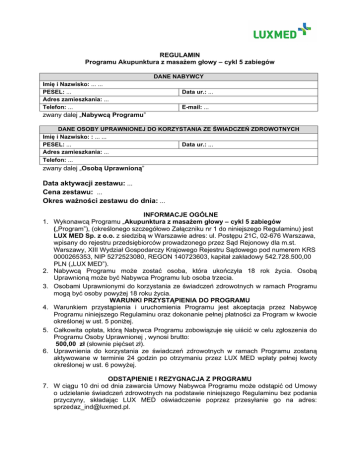 REGULAMIN Programu Akupunktura z masażem głowy – cykl 5 zabiegów DANE NABYWCY Imię i Nazwisko: ... ... PESEL: ... Adres zamieszkania: ... Telefon: ... Data ur.: ... E-mail: ... zwany dalej „Nabywcą Programu” DANE OSOBY UPRAWNIONEJ DO KORZYSTANIA ZE ŚWIADCZEŃ ZDROWOTNYCH Imię i Nazwisko: : ... ... PESEL: ... Data ur.: ... Adres zamieszkania: ... Telefon: ... zwany dalej „Osobą Uprawnioną” Data aktywacji zestawu: ... Cena zestawu: ... Okres ważności zestawu do dnia: ... 1. 2. 3. 4. 5. 6. INFORMACJE OGÓLNE Wykonawcą Programu „Akupunktura z masażem głowy – cykl 5 zabiegów („Program”), (określonego szczegółowo Załączniku nr 1 do niniejszego Regulaminu) jest LUX MED Sp. z o.o. z siedzibą w Warszawie adres: ul. Postępu 21C, 02-676 Warszawa, wpisany do rejestru przedsiębiorców prowadzonego przez Sąd Rejonowy dla m.st. Warszawy, XIII Wydział Gospodarczy Krajowego Rejestru Sądowego pod numerem KRS 0000265353, NIP 5272523080, REGON 140723603, kapitał zakładowy 542.728.500,00 PLN („LUX MED”). Nabywcą Programu może zostać osoba, która ukończyła 18 rok życia. Osobą Uprawnioną może być Nabywca Programu lub osoba trzecia. Osobami Uprawnionymi do korzystania ze świadczeń zdrowotnych w ramach Programu mogą być osoby powyżej 18 roku życia. WARUNKI PRZYSTĄPIENIA DO PROGRAMU Warunkiem przystąpienia i uruchomienia Programu jest akceptacja przez Nabywcę Programu niniejszego Regulaminu oraz dokonanie pełnej płatności za Program w kwocie określonej w ust. 5 poniżej. Całkowita opłata, którą Nabywca Programu zobowiązuje się uiścić w celu zgłoszenia do Programu Osoby Uprawnionej , wynosi brutto: 500,00 zł (słownie pięćset zł). Uprawnienia do korzystania ze świadczeń zdrowotnych w ramach Programu zostaną aktywowane w terminie 24 godzin po otrzymaniu przez LUX MED wpłaty pełnej kwoty określonej w ust. 6 powyżej. ODSTĄPIENIE I REZYGNACJA Z PROGRAMU 7. W ciągu 10 dni od dnia zawarcia Umowy Nabywca Programu może odstąpić od Umowy o udzielanie świadczeń zdrowotnych na podstawie niniejszego Regulaminu bez podania przyczyny, składając LUX MED oświadczenie poprzez przesyłanie go na adres: [email protected]. 8. Prawo odstąpienia od Umowy zawartej na odległość nie przysługuje Nabywcy Programu w wypadku rozpoczęcia świadczenia usług w ramach Programu, za zgodą Nabywcy, przed upływem 10 dni od dnia zawarcia Umowy. WARUNKI REALIZACJI PROGRAMU 9. Udzielanie świadczeń zdrowotnych w ramach Programu odbywa się w dedykowanej do Programu placówce PROFEMED przy ul. Al. Jerozolimskie 65/79 (VI piętro) w Warszawie w godzinach pracy tej placówki. 10. Warunkiem udzielenia świadczenia zdrowotnego w ramach Programu jest uprzednie uzgodnienie terminu jego wykonania poprzez skontaktowanie się z infolinią PROFEMED pod numerem 22 33 22 844 lub bezpośrednio z placówką PROFEMED pod numerem 885670140. 11. Świadczenia w ramach Programu należy zrealizować nie później niż w ciągu 3 miesięcy od dnia aktywowania uprawnień Osoby Uprawnionej do Programu. OŚWIADCZENIE NABYWCY 12. Nabywca (w rozumieniu Regulaminu Programu Akupunktura z masażem głowy – cykl 5 zabiegów) poinformował Osobę Uprawnioną (w rozumieniu ww regulaminu) do korzystania z usług w ramach Programu (w rozumieniu ww regulaminu) o: 1. adresie siedziby i pełnej nazwie LUX MED Sp. z o.o. jako administratora danych tej Osoby przekazanych przez Nabywcę; 2. celu i zakresie zbierania przez LUX MED Sp. z o.o. danych, o których mowa w pkt 1) powyżej; 3. źródle danych, o których mowa w pkt 1 powyżej; 4. prawie dostępu Osoby Uprawnionej do treści swoich danych przetwarzanych przez LUX MED Sp. z o.o. jako administratora danych oraz prawie do ich poprawiania; 5. uprawnieniach wynikających z art. 32 ust. 1 pkt 7 i 8 Ustawy z dnia 2 sierpnia 1997 r. o ochronie danych osobowych („Ustawa”) tj. a) wniesienia, w przypadkach wymienionych w art. 23 ust. 1 pkt 4 i 5 Ustawy, pisemnego, umotywowanego żądania zaprzestania przetwarzania jej danych ze względu na jej szczególną sytuację, b) wniesienia sprzeciwu wobec przetwarzania jej danych w przypadkach, wymienionych w art. 23 ust. 1 pkt 4 i 5 Ustawy, gdy administrator danych zamierza je przetwarzać w celach marketingowych lub wobec przekazywania jej danych osobowych innemu administratorowi danych. 13. Nabywca oświadcza, iż posiada zgodę osoby wskazanej w Regulaminie Programu Akupunktura z masażem głowy – cykl 5 zabiegów jako Osoba Uprawniona do korzystania z usług w ramach Programu, na przekazanie następujących danych osobowych tej osoby: imienia i nazwiska, daty urodzenia, numeru PESEL, numeru telefonu, adres e-mail, adres zamieszkania. KONTAKT I REKLAMACJE 14. Reklamacje przyjmowane są wyłącznie w formie pisemnej. 15. Reklamacje dotyczące obsługi rozpatrywane są w ciągu 5 dni roboczych, reklamacje dotyczące kwestii medycznych rozpatrywane są w ciągu 14 dni roboczych od daty wpływu reklamacji na adres: LUX MED Sp. z o.o. Departament Obsługi Klienta Dział Zarządzania Reklamacjami ul. Postępu 21C 02-676 Warszawa lub na adres poczty elektronicznej: [email protected] POSTANOWIENIA KOŃCOWE 16. Nie ma możliwości dokonania cesji praw do Programu na inną osobę. 17. Zakup Programu oraz korzystanie ze świadczeń zdrowotnych w ramach Programu nie łączy się z żadnymi innymi promocjami ani rabatami udzielanymi przez LUX MED na jakiekolwiek usługi . 18. W przypadkach rozbieżności pomiędzy postanowieniami niniejszego regulaminu a Regulaminem Sklep, zastosowanie znajdą postanowienia niniejszego regulaminu. 19. Integralną część Regulaminu stanowi załącznik nr 1. Załącznik nr 1 Wykaz usług wchodzących w skład Programu Akupunktura z masażem głowy – cykl 5 zabiegów Akupunktura z masażem głowy – 5 zabiegów
