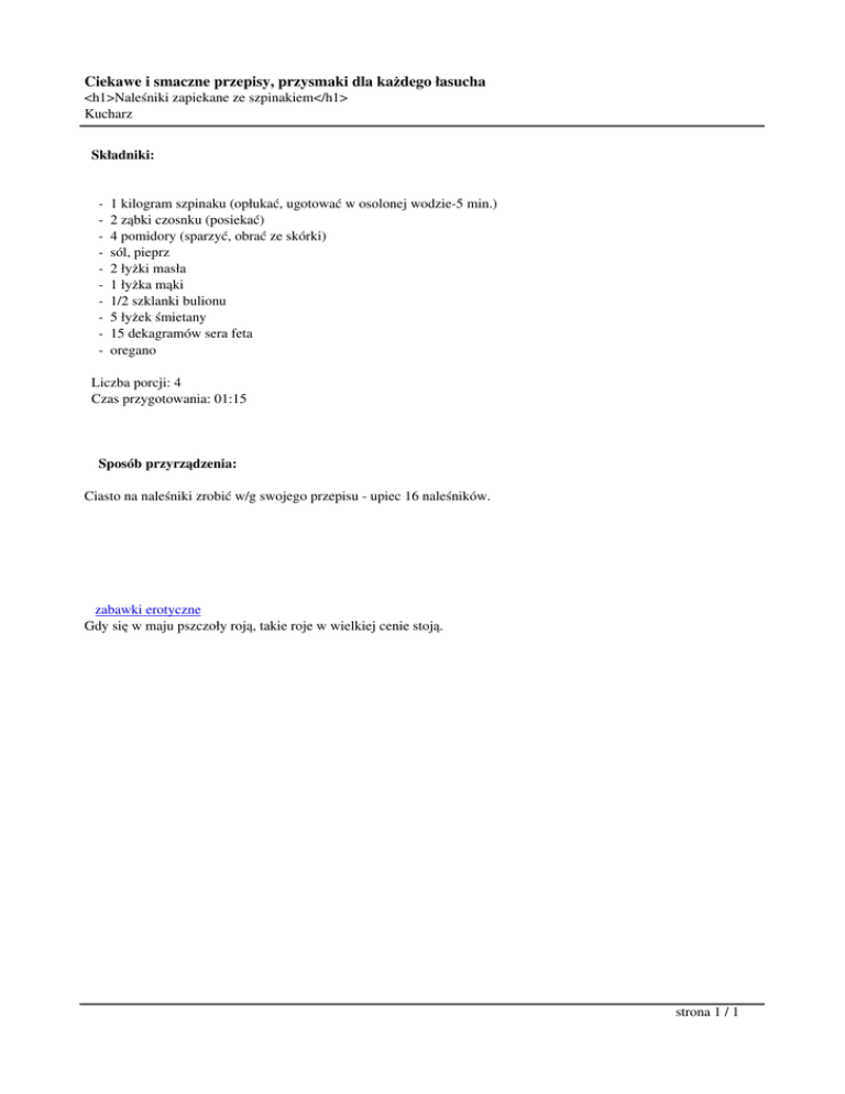 Ciekawe i smaczne przepisy, przysmaki dla każdego łasucha <h1>Naleśniki zapiekane ze szpinakiem</h1> Kucharz Składniki: - 1 kilogram szpinaku (opłukać, ugotować w osolonej wodzie-5 min.) 2 ząbki czosnku (posiekać) 4 pomidory (sparzyć, obrać ze skórki) sól, pieprz 2 łyżki masła 1 łyżka mąki 1/2 szklanki bulionu 5 łyżek śmietany 15 dekagramów sera feta oregano Liczba porcji: 4 Czas przygotowania: 01:15 Sposób przyrządzenia: Ciasto na naleśniki zrobić w/g swojego przepisu - upiec 16 naleśników. zabawki erotyczne Gdy się w maju pszczoły roją, takie roje w wielkiej cenie stoją. strona 1 / 1