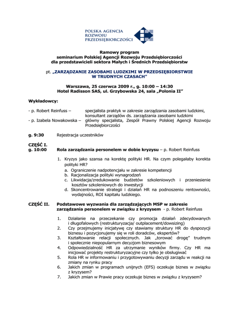 Ramowy program seminarium Polskiej Agencji Rozwoju Przedsiębiorczości dla przedstawicieli sektora Małych i Średnich Przedsiębiorstw pt. „ZARZĄDZANIE ZASOBAMI LUDZKIMI W PRZEDSIĘBIORSTWIE W TRUDNYCH CZASACH” Warszawa, 25 czerwca 2009 r., g. 10:00 – 14:30 Hotel Radisson SAS, ul. Grzybowska 24, sala „Polonia II” Wykładowcy: - p. Robert Reinfuss – specjalista praktyk w zakresie zarządzania zasobami ludzkimi, konsultant zarządów ds. zarządzania zasobami ludzkimi - p. Izabela Nowakowska – główny specjalista, Zespół Prawny Polskiej Agencji Rozwoju Przedsiębiorczości g. 9:30 Rejestracja uczestników CZĘŚĆ I. g. 10:00 Rola zarządzania personelem w dobie kryzysu – p. Robert Reinfuss 1. Kryzys jako szansa na korektę polityki HR. Na czym polegałaby korekta polityki HR? a. Ograniczenie nadpotencjału w zakresie kompetencji b. Racjonalizacja polityki wynagrodzeń c. Likwidacja/zredukowanie budżetów szkoleniowych i przeniesienie kosztów szkoleniowych do inwestycji d. Skoncentrowanie strategii i działań HR na podnoszeniu rentowności, wydajności, ROI kapitału ludzkiego. CZĘŚĆ II. Podstawowe wyzwania dla zarządzających MSP w zakresie zarządzania personelem w związku z kryzysem - p. Robert Reinfuss 1. 2. 3. 4. 5. 6. 7. Działanie na przeczekanie czy promocja działań zdecydowanych i długofalowych (restrukturyzacja/ outplacement/dowsizing) Czy przejmujemy inicjatywę czy stawiamy struktury HR do dyspozycji biznesu i pozycjonujemy się w roli doradców, ekspertów? Kształtowanie relacji społecznych. Jak „torować drogę” trudnym i społecznie niepopularnym decyzjom biznesowym Odpowiedzialność HR za utrzymanie wyników firmy. Czy HR ma inicjować projekty restrukturyzacyjne czy tylko je obsługiwać Rola HR w informowaniu i przygotowywaniu decyzji zarządu w reakcji na zmiany na rynku pracy Jakich zmian w programach unijnych (EFS) oczekuje biznes w związku z kryzysem? Jakich zmian w Prawie pracy oczekuje biznes w związku z kryzysem? (ok. g. 12:00 g. 13:30 Przerwa na kawę w trakcie obrad: 30 min.) Aktualne aspekty prawne związane z polityką personalną w przedsiębiorstwach w czasach kryzysu - p. Izabela Nowakowska – główny specjalista w Zespole Prawnym PARP 1. Jak prawidłowo rozwiązać umowę o pracę z pracownikiem 2. Pracownicy chronieni przed wypowiedzeniem umowy o pracę 3. Zwolnienia grupowe a indywidualne zgodnie z przepisami ustawy z 13 marca 2003 r. o szczególnych zasadach rozwiązywania z pracownikami stosunków pracy z przyczyn niedotyczących pracowników (Dz. U. Nr 90 poz. 844 z późn. zm.) g. 14:00 Pytania, komentarze uczestników konferencji g. 14:30 Zakończenie seminarium
