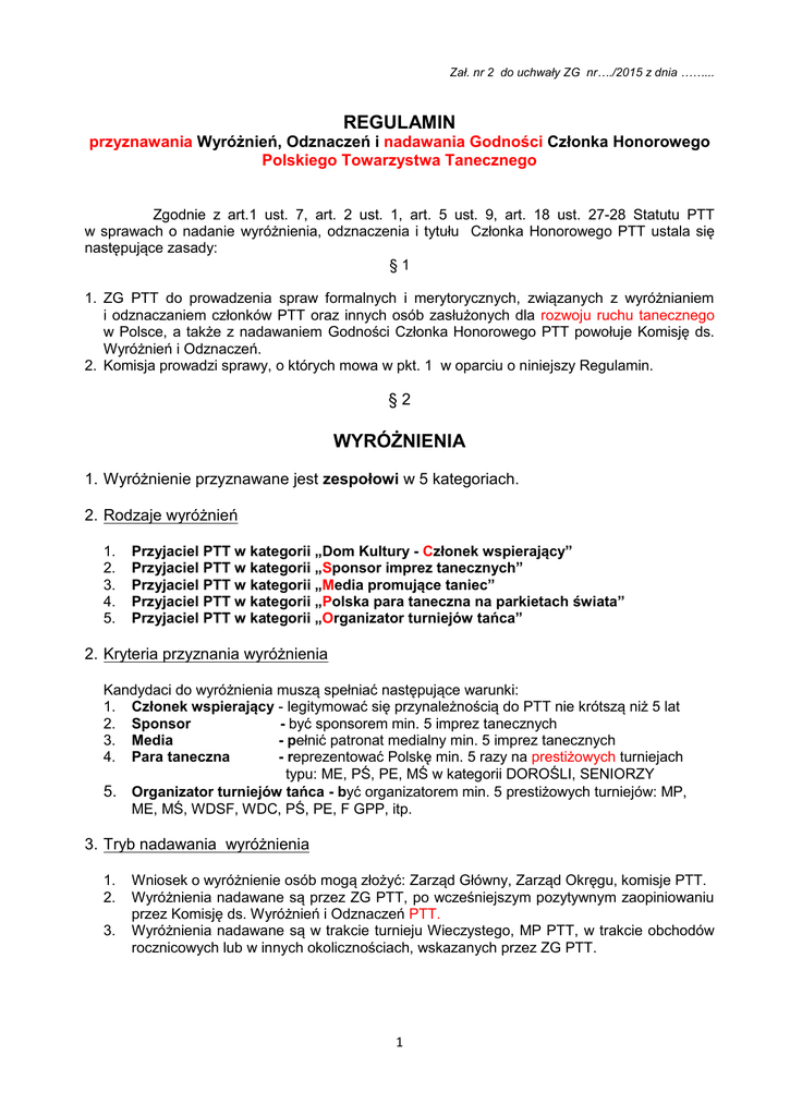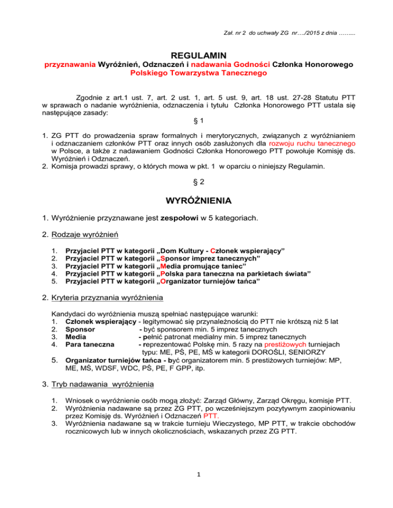 Zał. nr 2 do uchwały ZG nr…./2015 z dnia ……... REGULAMIN przyznawania Wyróżnień, Odznaczeń i nadawania Godności Członka Honorowego Polskiego Towarzystwa Tanecznego Zgodnie z art.1 ust. 7, art. 2 ust. 1, art. 5 ust. 9, art. 18 ust. 27-28 Statutu PTT w sprawach o nadanie wyróżnienia, odznaczenia i tytułu Członka Honorowego PTT ustala się następujące zasady: §1 1. ZG PTT do prowadzenia spraw formalnych i merytorycznych, związanych z wyróżnianiem i odznaczaniem członków PTT oraz innych osób zasłużonych dla rozwoju ruchu tanecznego w Polsce, a także z nadawaniem Godności Członka Honorowego PTT powołuje Komisję ds. Wyróżnień i Odznaczeń. 2. Komisja prowadzi sprawy, o których mowa w pkt. 1 w oparciu o niniejszy Regulamin. §2 WYRÓŻNIENIA 1. Wyróżnienie przyznawane jest zespołowi w 5 kategoriach. 2. Rodzaje wyróżnień 1. 2. 3. 4. 5. Przyjaciel PTT w kategorii „Dom Kultury - Członek wspierający” Przyjaciel PTT w kategorii „Sponsor imprez tanecznych” Przyjaciel PTT w kategorii „Media promujące taniec” Przyjaciel PTT w kategorii „Polska para taneczna na parkietach świata” Przyjaciel PTT w kategorii „Organizator turniejów tańca” 2. Kryteria przyznania wyróżnienia Kandydaci do wyróżnienia muszą spełniać następujące warunki: 1. Członek wspierający - legitymować się przynależnością do PTT nie krótszą niż 5 lat 2. Sponsor - być sponsorem min. 5 imprez tanecznych 3. Media - pełnić patronat medialny min. 5 imprez tanecznych 4. Para taneczna - reprezentować Polskę min. 5 razy na prestiżowych turniejach typu: ME, PŚ, PE, MŚ w kategorii DOROŚLI, SENIORZY 5. Organizator turniejów tańca - być organizatorem min. 5 prestiżowych turniejów: MP, ME, MŚ, WDSF, WDC, PŚ, PE, F GPP, itp. 3. Tryb nadawania wyróżnienia 1. 2. 3. Wniosek o wyróżnienie osób mogą złożyć: Zarząd Główny, Zarząd Okręgu, komisje PTT. Wyróżnienia nadawane są przez ZG PTT, po wcześniejszym pozytywnym zaopiniowaniu przez Komisję ds. Wyróżnień i Odznaczeń PTT. Wyróżnienia nadawane są w trakcie turnieju Wieczystego, MP PTT, w trakcie obchodów rocznicowych lub w innych okolicznościach, wskazanych przez ZG PTT. 1 §3 ODZNAKI PTT 1. Odznaka przyznawana jest w przypadkach indywidualnych. 2. Rodzaje odznak 2.1 Brązowa Odznaka PTT 2.2 Srebrna Odznaka PTT 2.3 Złota Odznaka PTT 3. Kryteria przyznania odznaki 3.1 Odznaka przyznawana jest za wybitne zasługi i osiągnięcia w dziedzinie tańca. 3.2 Odznakę może otrzymać: 3.2.1 osoba pełnoletnia, legitymująca się min. 10-letnią przynależnością do PTT, 3.2.2 posiadająca udokumentowane zasługi w dziedzinie tańca, 3.2.3 ciesząca się autorytetem w środowisku tanecznym. 3.3. Odznakę można otrzymać: 3.3.1. Odznakę Brązową po min. 10 latach przynależności do PTT, 3.3.2. Odznakę Srebrną po min. 15 latach przynależności do PTT, 3.3.3. Odznakę Złotą po min. 20 latach przynależności do PTT. 4. Tryb nadawania odznaki 4.1 Wniosek o odznakę mogą złożyć: ZG, ZO, komisje PTT. 4.2 Odznaka przyznawana jest przez ZG PTT, po wcześniejszym pozytywnym zaopiniowaniu przez Komisję ds. Wyróżnień i Odznaczeń PTT. 4.3 Odznaki przyznawane są w trakcie turnieju Wieczystego, MP PTT, w trakcie obchodów rocznicowych lub w innych okolicznościach, wskazanych przez ZG PTT. §4 Godność CZŁONKA HONOROWEGO PTT 1. Godność Członka Honorowego przyznawana jest w przypadkach indywidualnych 2. Kryteria nadawania Godności CZŁONKA HONOROWEGO PTT Kandydat musi spełniać łącznie następujące kryteria: 2.1 Staż członkowski w PTT – minimum 25 lat. 2.2 Aktywna działalność w strukturach na szczeblu lokalnym i krajowym. 2.3 Wybitne zasługi dla rozwoju ruchu tanecznego i realizacji celów PTT. 2.4 Udział w pracach różnych komisji i/lub zespołach problemowych. 2.5 Osoba ciesząca się autorytetem w środowisku tanecznym. 3. Tryb nadawania godności 3.1 Godność „Członka Honorowego PTT” może zostać nadana osobie pełnoletniej. 3.2 Godność nadaje Walny Zjazd PTT, na wniosek Zarządu Głównego lub Zarządu Okręgu. 3.3 Wręczenie Aktu godności następuje w trakcie turnieju Wieczystego, MP PTT, w trakcie obchodów rocznicowych lub w innych okolicznościach, wskazanych przez ZG PTT. 2 4. Uprawnienia Członka Honorowego PTT 4.1. Członkowi Honorowemu przysługują wszystkie uprawnienia członka zwyczajnego. 4.2. Członek Honorowy zwolniony jest z opłacania składek członkowskich. 4.3. Członek zapraszany jest na Walne Zebrania Okręgu i Walny Zjazd PTT z głosem doradczym §5 Postanowienia ogólne 1. Wnioski w sprawie przyznania wyróżnienia, odznaki i nadania tytułu Członka Honorowego PTT wraz z załącznikami składa się do biura PTT. 2. Załączniki do wniosku: a) uchwała Zarządu Okręgu lub uchwała Zarządu Głównego o skierowaniu wniosku do Komisji. b) uzasadnienie merytoryczne - potwierdzenie spełnienia kryteriów, określonych w § 1-3. 3. Biuro PTT po ich ewidencji przekazuje wnioski do Komisji ds. Wyróżnień i Odznaczeń, celem weryfikacji oraz wydania opinii. 4. Komisja dokonuje weryfikacji wniosków wraz załącznikami w terminie 30 dni od daty ich otrzymania. 5. Komisja przedkłada do Zarządu Głównego wniosek z pozytywną opinią, po stwierdzeniu spełnienia przez zainteresowanego wszystkich warunków. 6. Zarząd Główny na najbliższym posiedzeniu podejmuje stosowną uchwałę. §6 W przypadkach nie unormowanych niniejszym regulaminem każdorazowo decyduje ZG PTT. §7 Regulamin wchodzi w życie z dniem zatwierdzenia przez Walny Zjazd PTT. 3