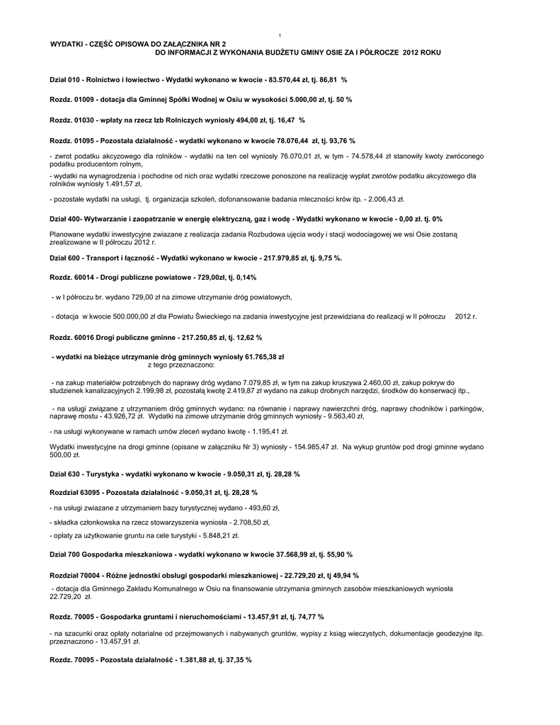 1 WYDATKI - CZĘŚĆ OPISOWA DO ZAŁĄCZNIKA NR 2 DO INFORMACJI Z WYKONANIA BUDŻETU GMINY OSIE ZA I PÓŁROCZE 2012 ROKU Dział 010 - Rolnictwo i łowiectwo - Wydatki wykonano w kwocie - 83.570,44 zł, tj. 86,81 % Rozdz. 01009 - dotacja dla Gminnej Spółki Wodnej w Osiu w wysokości 5.000,00 zł, tj. 50 % Rozdz. 01030 - wpłaty na rzecz Izb Rolniczych wyniosły 494,00 zł, tj. 16,47 % Rozdz. 01095 - Pozostała działalność - wydatki wykonano w kwocie 78.076,44 zł, tj. 93,76 % - zwrot podatku akcyzowego dla rolników - wydatki na ten cel wyniosły 76.070,01 zł, w tym - 74.578,44 zł stanowiły kwoty zwróconego podatku producentom rolnym, - wydatki na wynagrodzenia i pochodne od nich oraz wydatki rzeczowe ponoszone na realizację wypłat zwrotów podatku akcyzowego dla rolników wyniosły 1.491,57 zł, - pozostałe wydatki na usługi, tj. organizacja szkoleń, dofonansowanie badania mleczności krów itp. - 2.006,43 zł. Dział 400- Wytwarzanie i zaopatrzanie w energię elektryczną, gaz i wodę - Wydatki wykonano w kwocie - 0,00 zł. tj. 0% Planowane wydatki inwestycyjne zwiazane z realizacja zadania Rozbudowa ujęcia wody i stacji wodociagowej we wsi Osie zostaną zrealizowane w II półroczu 2012 r. Dział 600 - Transport i łączność - Wydatki wykonano w kwocie - 217.979,85 zł, tj. 9,75 %. Rozdz. 60014 - Drogi publiczne powiatowe - 729,00zł, tj. 0,14% - w I półroczu br. wydano 729,00 zł na zimowe utrzymanie dróg powiatowych, - dotacja w kwocie 500.000,00 zł dla Powiatu Świeckiego na zadania inwestycyjne jest przewidziana do realizacji w II półroczu 2012 r. Rozdz. 60016 Drogi publiczne gminne - 217.250,85 zł, tj. 12,62 % - wydatki na bieżące utrzymanie dróg gminnych wyniosły 61.765,38 zł z tego przeznaczono: - na zakup materiałów potrzebnych do naprawy dróg wydano 7.079,85 zł, w tym na zakup kruszywa 2.460,00 zł, zakup pokryw do studzienek kanalizacyjnych 2.199,98 zł, pozostałą kwotę 2.419,87 zł wydano na zakup drobnych narzędzi, środków do konserwacji itp., - na usługi związane z utrzymaniem dróg gminnych wydano: na równanie i naprawy nawierzchni dróg, naprawy chodników i parkingów, naprawę mostu - 43.926,72 zł. Wydatki na zimowe utrzymanie dróg gminnych wyniosły - 9.563,40 zł, - na usługi wykonywane w ramach umów zleceń wydano kwotę - 1.195,41 zł. Wydatki inwestycyjne na drogi gminne (opisane w załączniku Nr 3) wyniosły - 154.985,47 zł. Na wykup gruntów pod drogi gminne wydano 500,00 zł. Dział 630 - Turystyka - wydatki wykonano w kwocie - 9.050,31 zł, tj. 28,28 % Rozdział 63095 - Pozostała działalność - 9.050,31 zł, tj. 28,28 % - na usługi zwiazane z utrzymaniem bazy turystycznej wydano - 493,60 zł, - składka członkowska na rzecz stowarzyszenia wyniosła - 2.708,50 zł, - opłaty za użytkowanie gruntu na cele turystyki - 5.848,21 zł. Dział 700 Gospodarka mieszkaniowa - wydatki wykonano w kwocie 37.568,99 zł, tj. 55,90 % Rozdział 70004 - Różne jednostki obsługi gospodarki mieszkaniowej - 22.729,20 zł, tj 49,94 % - dotacja dla Gminnego Zakładu Komunalnego w Osiu na finansowanie utrzymania gminnych zasobów mieszkaniowych wyniosła 22.729,20 zł. Rozdz. 70005 - Gospodarka gruntami i nieruchomościami - 13.457,91 zł, tj. 74,77 % - na szacunki oraz opłaty notarialne od przejmowanych i nabywanych gruntów, wypisy z ksiąg wieczystych, dokumentacje geodezyjne itp. przeznaczono - 13.457,91 zł. Rozdz. 70095 - Pozostała działalność - 1.381,88 zł, tj. 37,35 % 2 - na wypłatę odszkodowań za zajmowanie lokali mieszkalnych przez osoby, wobec których sąd orzekł tytuł eksmisyjny oraz wynajem pomieszczeń dla tych osób wydano - 1.381,88 zł. Dział 710 - Działalność usługowa - wydatki wykonano w kwocie - 28.804,79 zł, tj. 50,10 % - na usługi związane z planowaniem przestrzennym oraz zmianami w planie zagospodarowania przestrzennego wydano - 23.859,79 zł - na opracowanie kartograficzne i pomiary geodezyjne dot. gruntów gminnych wydano - 4.945,00 zł. - przewidywane wydatki na utrzymanie cmentarzy w kwcie 2.500,00 zł są przewidzane do wykorzystania w II półroczu br. Dział 720 - Informatyka - 0,00 zł, tj. 0,00% Planowane wydatki zostaną zrealizowane w II półroczu. Dział 750 - Administracja publiczna - Wydatki wykonano w kwocie - 901.979,25 zł, tj. 55,43 %. Rozdział 75011 - Urzędy wojewódzkie - 34.414,27 zł, tj. 47,40 % - na realizację zadań z zakresu administracji rządowej wydano kwotę 34.414,27 zł, w tym na wynagrodzenia i pchodne - 30.902,00 zł. Rozdział 75022 - Rady gmin - 42.248,01 zł, tj. 52,81 % - wydatki związane z funkcjonowaniem Rady Gminy wyniosły - 42.248,01 zł, w tym diety radnych - 36.940,00 zł, wydatki rzeczowe: zakupy materiałów, wydatki na usługi pozostałe i koszty delegacji wyniosły - 5.308,01 zł. Rozdział 75023 - Urzędy gmin 735.109,88 zł, tj. 56,50 %. - wydatki na funkcjonowanie administracji gminnej i utrzymanie Urzędu Gminy wyniosły - 735.109,88 zł, z tego na wynagrodzenia pracowników i pochodne od wynagrodzeń wydano kwotę - 575.835,00 zł, - na wypłaty prowizji od zainkasowanych opłat i należności podatkokowych - 8.381,15 zł, wynagrodzenia bezosobowe 8.127,00 zł, - na Zakładowy Fundusz Świadczeń Socjalnych przekazano kwotę - 15.413,00 zł, - wydatki rzeczowe Urzędu Gminy wyniosły - 127.353,73 zł, w tym na zakup materiałów - 38.706,24 zł, usługi telekomunikacyjne 8.139,52 zł, usługi pocztowe, bankowe, egzekucyjne, serwisowe itp. - 54.321,30 zł, energia - 1.814,26 zł, podróże służbowe - 13.009,68 zł, ubezpieczenie majątku gminy 6.556,80 zł, szkolenia pracowników - 3.900,00 zł, ekwiwalenty 815,93 zł, usługi zdrowotne 90,00 zł. Rozdz. 75075 - Promocja jednostek samorządu terytorialnego - 27.457,96 zł, tj. 78,45 % Wydatki związane z promocją gminy w I półroczu 2012 roku wyniosły - 27.457,96 zł. W tej kwocie finansowane były między innymi - zakup materiałów reklamowych i promocyjnych, organizacja i