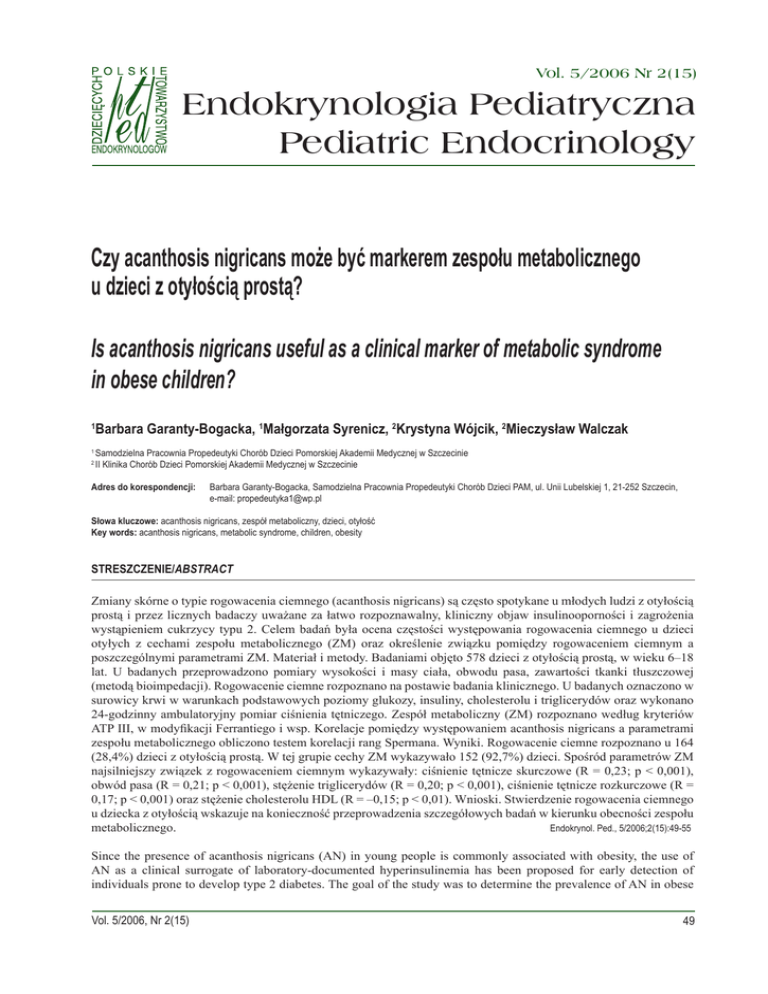 Vol. 5/2006 Nr 2(15) Endokrynologia Pediatryczna Pediatric Endocrinology Czy acanthosis nigricans może być markerem zespołu metabolicznego u dzieci z otyłością prostą? Is acanthosis nigricans useful as a clinical marker of metabolic syndrome in obese children? 1 Barbara Garanty-Bogacka, 1Małgorzata Syrenicz, 2Krystyna Wójcik, 2Mieczysław Walczak 1 Samodzielna Pracownia Propedeutyki Chorób Dzieci Pomorskiej Akademii Medycznej w Szczecinie II Klinika Chorób Dzieci Pomorskiej Akademii Medycznej w Szczecinie 2 Adres do korespondencji: Barbara Garanty-Bogacka, Samodzielna Pracownia Propedeutyki Chorób Dzieci PAM, ul. Unii Lubelskiej 1, 21-252 Szczecin, e-mail: [email protected] Słowa kluczowe: acanthosis nigricans, zespół metaboliczny, dzieci, otyłość Key words: acanthosis nigricans, metabolic syndrome, children, obesity STRESZCZENIE/ABSTRACT Zmiany skórne o typie rogowacenia ciemnego (acanthosis nigricans) są często spotykane u młodych ludzi z otyłością prostą i przez licznych badaczy uważane za łatwo rozpoznawalny, kliniczny objaw insulinooporności i zagrożenia wystąpieniem cukrzycy typu 2. Celem badań była ocena częstości występowania rogowacenia ciemnego u dzieci otyłych z cechami zespołu metabolicznego (ZM) oraz określenie związku pomiędzy rogowaceniem ciemnym a poszczególnymi parametrami ZM. Materiał i metody. Badaniami objęto 578 dzieci z otyłością prostą, w wieku 6–18 lat. U badanych przeprowadzono pomiary wysokości i masy ciała, obwodu pasa, zawartości tkanki tłuszczowej (metodą bioimpedacji). Rogowacenie ciemne rozpoznano na postawie badania klinicznego. U badanych oznaczono w surowicy krwi w warunkach podstawowych poziomy glukozy, insuliny, cholesterolu i triglicerydów oraz wykonano 24-godzinny ambulatoryjny pomiar ciśnienia tętniczego. Zespół metaboliczny (ZM) rozpoznano według kryteriów ATP III, w modyfikacji Ferrantiego i wsp. Korelacje pomiędzy występowaniem acanthosis nigricans a parametrami zespołu metabolicznego obliczono testem korelacji rang Spermana. Wyniki. Rogowacenie ciemne rozpoznano u 164 (28,4%) dzieci z otyłością prostą. W tej grupie cechy ZM wykazywało 152 (92,7%) dzieci. Spośród parametrów ZM najsilniejszy związek z rogowaceniem ciemnym wykazywały: ciśnienie tętnicze skurczowe (R = 0,23; p < 0,001), obwód pasa (R = 0,21; p < 0,001), stężenie triglicerydów (R = 0,20; p < 0,001), ciśnienie tętnicze rozkurczowe (R = 0,17; p < 0,001) oraz stężenie cholesterolu HDL (R = –0,15; p < 0,01). Wnioski. Stwierdzenie rogowacenia ciemnego u dziecka z otyłością wskazuje na konieczność przeprowadzenia szczegółowych badań w kierunku obecności zespołu metabolicznego. Endokrynol. Ped., 5/2006;2(15):49-55 Since the presence of acanthosis nigricans (AN) in young people is commonly associated with obesity, the use of AN as a clinical surrogate of laboratory-documented hyperinsulinemia has been proposed for early detection of individuals prone to develop type 2 diabetes. The goal of the study was to determine the prevalence of AN in obese Vol. 5/2006, Nr 2(15) 49 Praca oryginalna Endokrynol. Ped., 5/2006;2(15):49-55 children with metabolic syndrome (MS) as well as to assess the relationship between AN and selected parameters of MS. Material and methods. A total of 578 obese children and adolescents, aged 6 018 years were evaluated. Measurements of weight, height, waist circumference, body fat content (by bioimpedance method) were performed. Acanthosis nigricans was recognized by clinical evaluation. Fasting glucose, insulin, cholesterol and triglycerides were determined in blood samples. 24-h ambulatory blood pressure monitoring were also performed. Metabolic syndrome was determined according to the ATP III criteria with a modification by Ferranti et al. To assess the association between AN and metabolic syndrome parameters, the rang Spearman correlation test was performed. Results. AN was recognized in 164 (28.4%) children. In this group, MS was revealed in 152 (92.7%) patients. The presence of AN correlated with systolic blood pressure (R = 0.23; p < 0.001), waist circumference (R = 0.21; p < 0.001), triglycerides in serum (R = 0.20; p < 0.001), diastolic blood pressure (R = 0.17; p < 0.001), and HDL cholesterol level’s (R = 0.15; p < 0.01). Conclusions. Acanthosis nigricans may be useful as early indicator of metabolic syndrome in obese children. Pediatr. Endocrinol., 5/2006;2(15):49-55 Wstęp Terminem „zespół metaboliczny” określa się nagromadzenie czynników ryzyka chorób sercowo-naczyniowych, których podłożem patogenetycznym jest najprawdopodobniej insulinooporność i hiperinsulinemia, zależne zarówno od czynników genetycznych, jak i środowiskowych [1]. Wyodrębnienie zespołu metabolicznego zaproponował w r. 1988 G. Reaven [2], wskazując, że tworzy go jednoczesne występowanie otyłości brzusznej, hiperglikemii, nadciśnienia tętniczego i dyslipidemii pod postacią hipertriglicerydemii oraz obniżenia HDL-cholesterolu. W późniejszych latach do zespołu dodano wiele innych zaburzeń i czynników ryzyka sercowo-naczyniowego, jak np. mikroalbuminuria, zwiększenie tendencji prozakrzepowych, zmniejszenie aktywności fibrynolitycznej, nasilenie mechanizmów oksydacyjnych w komórkach, stan zwiększonej aktywacji prozapalnej [3]. Spośród licznych definicji i kryteriów rozpoznawania zespołu metabolicznego najczęściej (zarówno w badaniach epidemiologicznych, jak i praktyce lekarskiej) stosuje się definicję zaproponowaną przez WHO [4] oraz kryteria III Raportu Narodowego Programu Edukacji Cholesterolowej (NCEP) na temat Wykrywania, Oceny i Leczenia Wysokiego Poziomu Cholesterolu u Dorosłych (Adult Treatment Panel III, ATP III) [5]. Opracowanie tych kryteriów umożliwiło rozwój badań epidemiologicznych dotyczących częstości występowania i charakterystyki zespołu w różnych populacjach ludzi dorosłych [6, 7]. Badania te dostarczyły nowych dowod