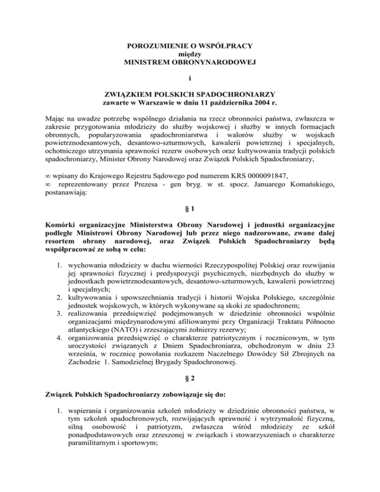 POROZUMIENIE O WSPÓŁPRACY między MINISTREM OBRONYNARODOWEJ i ZWIĄZKIEM POLSKICH SPADOCHRONIARZY zawarte w Warszawie w dniu 11 października 2004 r. Mając na uwadze potrzebę wspólnego działania na rzecz obronności państwa, zwłaszcza w zakresie przygotowania młodzieży do służby wojskowej i służby w innych formacjach obronnych, popularyzowania spadochroniarstwa i walorów służby w wojskach powietrznodesantowych, desantowo-szturmowych, kawalerii powietrznej i specjalnych, ochotniczego utrzymania sprawności rezerw osobowych oraz kultywowania tradycji polskich spadochroniarzy, Minister Obrony Narodowej oraz Związek Polskich Spadochroniarzy, • wpisany do Krajowego Rejestru Sądowego pod numerem KRS 0000091847, • reprezentowany przez Prezesa - gen bryg. w st. spocz. Januarego Komańskiego, postanawiają: §1 Komórki organizacyjne Ministerstwa Obrony Narodowej i jednostki organizacyjne podległe Ministrowi Obrony Narodowej lub przez niego nadzorowane, zwane dalej resortem obrony narodowej, oraz Związek Polskich Spadochroniarzy będą współpracować ze sobą w celu: 1. wychowania młodzieży w duchu wierności Rzeczypospolitej Polskiej oraz rozwijania jej sprawności fizycznej i predyspozycji psychicznych, niezbędnych do służby w jednostkach powietrznodesantowych, desantowo-szturmowych, kawalerii powietrznej i specjalnych; 2. kultywowania i upowszechniania tradycji i historii Wojska Polskiego, szczególnie jednostek wojskowych, w których wykonywane są skoki ze spadochronem; 3. realizowania przedsięwzięć podejmowanych w dziedzinie obronności wspólnie organizacjami międzynarodowymi afiliowanymi przy Organizacji Traktatu Północno atlantyckiego (NATO) i zrzeszającymi żołnierzy rezerwy; 4. organizowania przedsięwzięć o charakterze patriotycznym i rocznicowym, w tym uroczystości związanych z Dniem Spadochroniarza, obchodzonym w dniu 23 września, w rocznicę powołania rozkazem Naczelnego Dowódcy Sił Zbrojnych na Zachodzie 1. Samodzielnej Brygady Spadochronowej. §2 Związek Polskich Spadochroniarzy zobowiązuje się do: 1. wspierania i organizowania szkoleń młodzieży w dziedzinie obronności państwa, w tym szkoleń spadochronowych, rozwijających sprawność i wytrzymałość fizyczną, silną osobowość i patriotyzm, zwłaszcza wśród młodzieży ze szkół ponadpodstawowych oraz zrzeszonej w związkach i stowarzyszeniach o charakterze paramilitarnym i sportowym; 2. współdziałania przy organizowaniu przez resort obrony narodowej regionalnych ogólnokrajowych zawodów sportowych o charakterze paramilitarnym oraz uwzględniających konkurencje spadochronowe; 3. rozwijania w ramach Europejskiej Federacji Spadochroniarzy (UEP) współpracy ze środowiskami rezerwistów jednostek spadochronowych z armii państw członków NATO w celu wymiany doświadczeń w zakresie form i metod szkolenia, rozwiązań organizacyjnych, kierunków doskonalenia sprzętu spadochronowego oraz organizowania wspólnych przedsięwzięć promujących międzynarodową współpracę żołnierzy rezerwy i sportowców z państw europejskich; 4. kształtowania patriotycznych postaw i upowszechniania wiedzy o historii i tradycjach oręża polskiego, zwłaszcza w środowiskach młodzieży zrzeszonej w Związku Polskich Spadochroniarzy oraz żołnierzy rezerwy; 5. udziału w uroczystościach rocznicowych Wojska Polskiego i jednostek wojskowych, szczególnie powietrzno-desantowych, desantowo-szturmowych, kawalerii powietrznej i specjalnych; 6. współpracy z organizacjami byłych żołnierzy zawodowych Wojska Polskiego; 7. troski o miejsca pamięci narodowej związane z działalnością wojenną spadochroniarzy; 8. ubezpieczenia od następstw nieszczęśliwych wypadków i odpowiedzialności cywilnej wszystkich uczestników przedsięwzięć organizowanych na terenach i w obiektach wojskowych oraz przedsięwzięć, w których wykorzystany jest sprzęt wojskowy. §3 Resort obrony narodowej udzieli Związkowi Polskich Spadochroniarzy pomocy w działalności statutowej służącej obronności państwa poprzez: 1. obejmowanie przez instytucje i jednostki wojskowe patronatu nad oddziałami Związku Polskich Spadochroniarzy; 2. udostępnianie - w miarę posiadanych możliwości - ośrodków szkolenia, pomieszczeń, sprzętu, w tym wojskowych samolotów, śmigłowców i spadochronów, oraz środków łączności na podstawie odrębnych umów cywilnoprawnych, zgodnie z następującymi zasadami: a. bezpłatnie udostępnione mienie może być wykorzystane wyłącznie do celów statutowych Związku Polskich Spadochroniarzy oraz przedsięwzięć określonych w planie, o którym mowa w §4, b. wydatki niezbędne do funkcjonowania udostępnionego mienia ponosi Związek Polskich Spadochroniarzy z własnych środków albo refunduje jednostce wojskowej poniesione z tego tytułu wydatki, c. wszelkie zawinione straty zaistniałe w udostępnionym mieniu Związek Polskich Spadochroniarzy pokrywa z własnych środków; 3. umożliwienie organizowania przez Związek Polskich Spadochroniarzy zawodów sportowych oraz wspólnych szkoleń spadochronowych z członkami organizacji spadochroniarzy zrzeszających żołnierzy rezerwy z państw będących członkami NATO oraz zrzeszonych w UEP. §4 Związek Polskich Spadochroniarzy i upoważniona komórka organizacyjna Ministerstwa Obrony Narodowej będą uzgadniać do 30 czerwca każdego roku plan wspólnych przedsięwzięć na rzecz obronności na następny rok kalendarzowy oraz będą corocznie dokonywać oceny efektów współdziałania. §5 Dowódcy jednostek wojskowych (od szczebla dowódcy brygady - równorzędnego) oraz władze statutowe Związku Polskich Spadochroniarzy na obszarze swego działania mogą zawierać porozumienia o współpracy, ustalając do 30 listopada każdego roku harmonogramy wspólnych przedsięwzięć na rok następny oraz wyznaczą swoich przedstawicieli do koordynowania bieżącej współpracy. §6 Strony porozumienia nie ponoszą wo