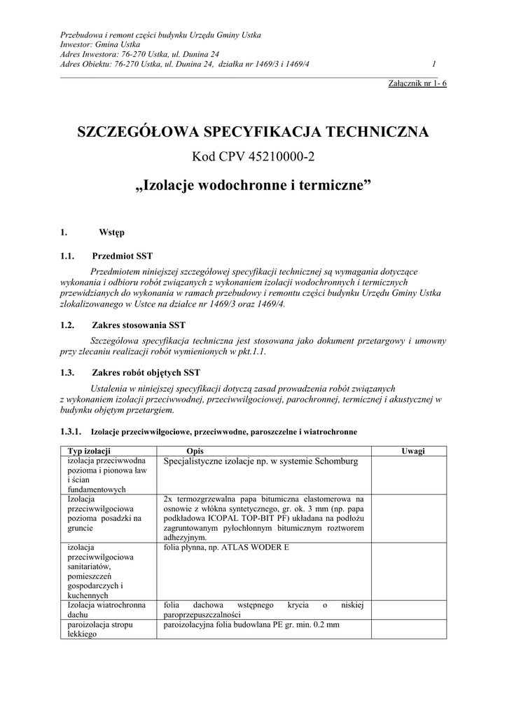 Przebudowa i remont części budynku Urzędu Gminy Ustka Inwestor: Gmina Ustka Adres Inwestora: 76-270 Ustka, ul. Dunina 24 Adres Obiektu: 76-270 Ustka, ul. Dunina 24, działka nr 1469/3 i 1469/4 1 ________________________________________________________________________________________ Załącznik nr 1- 6 SZCZEGÓŁOWA SPECYFIKACJA TECHNICZNA Kod CPV 45210000-2 „Izolacje wodochronne i termiczne” 1. Wstęp 1.1. Przedmiot SST Przedmiotem niniejszej szczegółowej specyfikacji technicznej są wymagania dotyczące wykonania i odbioru robót związanych z wykonaniem izolacji wodochronnych i termicznych przewidzianych do wykonania w ramach przebudowy i remontu części budynku Urzędu Gminy Ustka zlokalizowanego w Ustce na działce nr 1469/3 oraz 1469/4. 1.2. Zakres stosowania SST Szczegółowa specyfikacja techniczna jest stosowana jako dokument przetargowy i umowny przy zlecaniu realizacji robót wymienionych w pkt.1.1. 1.3. Zakres robót objętych SST Ustalenia w niniejszej specyfikacji dotyczą zasad prowadzenia robót związanych z wykonaniem izolacji przeciwwodnej, przeciwwilgociowej, parochronnej, termicznej i akustycznej w budynku objętym przetargiem. 1.3.1. Izolacje przeciwwilgociowe, przeciwwodne, paroszczelne i wiatrochronne Typ izolacji izolacja przeciwwodna pozioma i pionowa ław i ścian fundamentowych Izolacja przeciwwilgociowa pozioma posadzki na gruncie izolacja przeciwwilgociowa sanitariatów, pomieszczeń gospodarczych i kuchennych Izolacja wiatrochronna dachu paroizolacja stropu lekkiego Opis Specjalistyczne izolacje np. w systemie Schomburg 2x termozgrzewalna papa bitumiczna elastomerowa na osnowie z włókna syntetycznego, gr. ok. 3 mm (np. papa podkładowa ICOPAL TOP-BIT PF) układana na podłoŜu zagruntowanym pyłochłonnym bitumicznym roztworem adhezyjnym. folia płynna, np. ATLAS WODER E folia dachowa wstępnego krycia o niskiej paroprzepuszczalności paroizolacyjna folia budowlana PE gr. min. 0.2 mm Uwagi Przebudowa i remont części budynku Urzędu Gminy Ustka Inwestor: Gmina Ustka Adres Inwestora: 76-270 Ustka, ul. Dunina 24 Adres Obiektu: 76-270 Ustka, ul. Dunina 24, działka nr 1469/3 i 1469/4 2 ________________________________________________________________________________________ 1.3.2. Izolacje termiczne Typ izolacji Izolacja termiczna ścian zewnętrznych fundamentowych i ścian przyziemia w strefie cokołowej Izolacja termiczna ścian zewnętrznych przyziemia Izolacja termiczna dachu Izolacja termiczna podłogi na gruncie 1.3. Opis Uwagi twardy styropian - EPS 100-038 dach/podłoga, gr. 10 cm o zwiększonej odporności na wilgoć styropian EPS 70-040 Fasada gr. 10 cm wełna mineralna np ROCKWOOL MEGAROCK gr. 18 cm styropian EPS 100-038 dach/podłoga gr. 8 cm Określenia podstawowe ⇒ Izolacje przeciwwilgociowe – przeznaczone do ochrony obiektów budowlanych lub ich części ⇒ ⇒ ⇒ ⇒ przed działaniem wody nie wywierającej ciśnienia hydrostatycznego. Izolacje przeciwwodne - przeznaczone do ochrony obiektów budowlanych lub ich części przed działaniem wody, która wywiera ciśnienie hydrostatyczne. Izolacje parochronne – przeznaczone do zabezpieczenia przegród budowlanych przed działaniem pary wodnej. Izolacje termiczne - przeznaczone do zabezpieczenia przegród budowlanych przed utratą ciepła. Izolacje akustyczne – przeznaczone do zabezpieczenia przegród budowlanych przed hałasem. 1.4. Ogólne wymagania dotyczące robót Ogólne wymagania dotyczące robót podano w OST zał. 1-1. Wykonawca robót jest odpowiedzialny za jakość ich wykonania oraz za zgodność z SST i poleceniami inspektora nadzoru. ⇒ Izolacje powinny stanowić ciągły i szczelny układ jedno- lub wielowarstwowy oddzielający budowlę lub jej część od wody lub pary wodnej. ⇒ Izolacje powinny ściśle przylegać do izolowanego podkładu. Nie powinny pękać, a ich powierzchnia powinna być gładka bez lokalnych wgłębień lub wybrzuszeń. ⇒ Nie dopuszcza się łączenia izolacji poziomych i pionowych, odrębnego rodzaju pod względem materiałowym oraz róŜnej klasy odporności, np. zaprawy wodoszczelnej i materiałów rolowych, jako równorzędnych zabezpieczeń. ⇒ Miejsca przechodzenia przez warstwy izolacyjne wszelkich przewodów instalacyjnych i elementów konstrukcyjnych (np. słupów) powinny być uszczelniane w sposób wykluczający przeciekanie wody między tymi przewodami lub elementami i izolacją. ⇒ Izolacje wodochronne powinny być wykonywane w warunkach umoŜliwiających prawidłową realizację, a mianowicie: po ukończeniu robót poprzedzających roboty izolacyjne, po naleŜytym obniŜeniu poziomu wody gruntowej, jeśli zachodzi taka potrzeba, w temperaturze otoczenia nie niŜszej niŜ 50C – dla izolacji z materiałów bitumicznych przy zastosowaniu lepiku na gorąco; 100C – dla izolacji z materiałów bitumicznych przy zastosowaniu lepiku na zimno; 150C – dla izolacji z folii z tworzyw sztucznych; 180C – dla izolacji z Ŝywic syntetycznych. Przebudowa i remont części budynku Urzędu Gminy Ustka Inwestor: Gmina Ustka Adres Inwestora: 76-270 Ustka, ul. Dunina 24 Adres Obiektu: 76-270 Ustka, ul. Dunina 24, działka nr 1469/3 i 1469/4 3 ________________________________________________________________________________________ ⇒ Podczas robót izolacyjnych naleŜy chronić układane warstwy izolacji przed uszkodzeniami mechanicznymi oraz moŜliwością zawilgocenia i zalania wodą. 2. Materiały 2.1. Wymagania podstawowe ⇒ Wszelkie materiały do wykonywania izolacji wodochronnych: bitumicznych, z folii z tworzyw sztucznych oraz Ŝywic syntetycznych powinny odpowiadać wymaganiom zawartym w normach państwowych lub świadectwach ITB dopuszczających dany materiał do powszechnego stosowania w budownictwie. ⇒ Do papowych izolacji naleŜy stosować papy o wkładach nie podlegających rozkładowi biologicznemu, do których zalicza się papy na tkaninie z włókien szklanych i na welonie szklanym oraz papy na włóknie. ⇒ Le