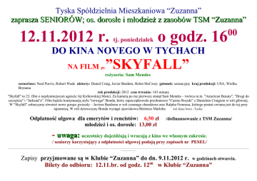 Tyska Spółdzielnia Mieszkaniowa “Zuzanna” zaprasza SENIORÓW; os. dorosłe i młodzież z zasobów TSM “Zuzanna” 12.11.2012 r. tj. poniedziałek 00 o godz. 16 DO KINA NOVEGO W TYCHACH ”SKYFALL” NA FILM pt. reżyseria: Sam Mendes scenariusz: Neal Purvis, Robert Wade aktorzy: Daniel Craig, Javier Bardem, Helen McCrory gatunek: sensacyjny kraj produkcji: USA, Wielka Brytania rok produkcji: 2012 czas trwania: 143 minuty "Skyfall" to 23. film o najsłynniejszym agencie Jej Królewskiej Mości. Za kamerą po raz pierwszy stanął Sam Mendes – twórca m.in. "American Beauty", "Drogi do szczęścia" i "Jarhead’a". Film będzie kontynuacją stylu "nowego" Bonda, który zapoczątkowało przełomowe "Casino Royale" z Danielem Craigiem w roli głównej. W "Skyfall" zobaczymy również nowe gorące gwiazdy – Javiera Bardema w roli czarnego charakteru oraz Ralpha Fiennesa, którego postać owiana jest do tej pory tajemnicą. W roli dziewczyny Bonda wystąpi zjawiskowa Bérénice Marlohe. /inf. Kino Nove - Tychy/ Odpłatność ulgowa dla emerytów i rencistów: 6,50 zł młodzież i os. dorosłe: 13,00 zł /dofinansowanie z TSM Zuzanna/ - uwaga: uczestnicy dojeżdżają i wracają z kina we własnym zakresie. / seniorzy korzystający z odpłatności ulgowej podają przy zapisach nr PESEL/ --------------------------------------------------------------------------------------------------------------------------------------------------------------------------------------------------------------------------------------------------------------------------------------------------------------------------------------------------------------------------------------------------------------------------- Zapisy przyjmowane są w Klubie “Zuzanna” do dn. 9.11.2012 r. w godzinach otwarcia. Bilety do odbioru: 12.11.br. od godz. 1200 w Klubie “Zuzanna”