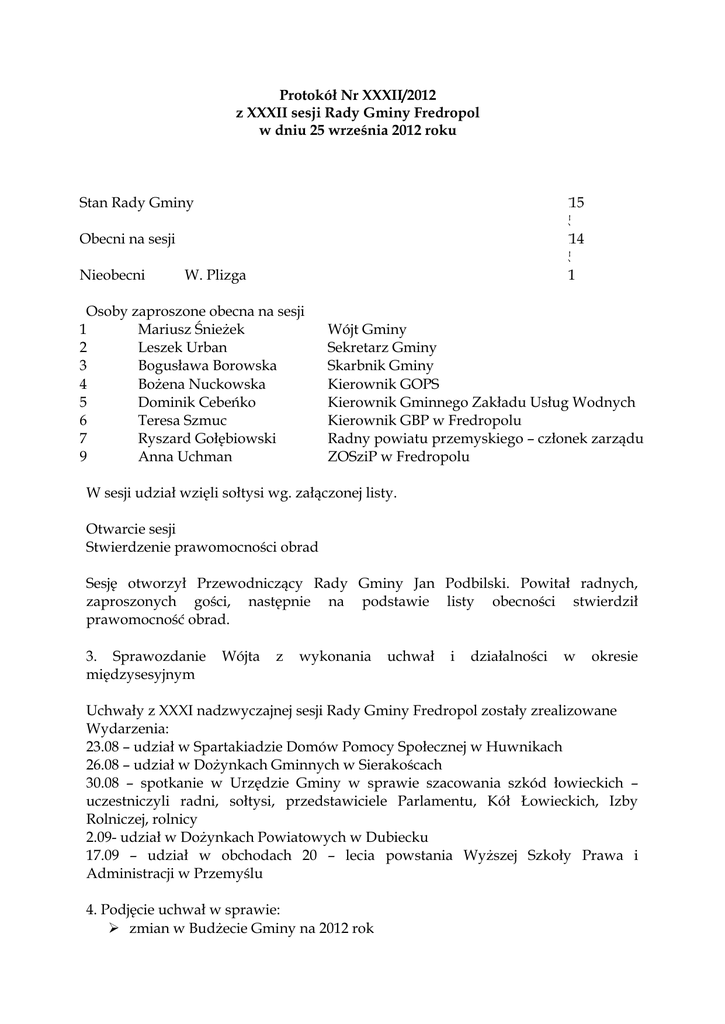Sesja XXXII Rady Gminy Fredropol z dnia 25 września 2012 roku