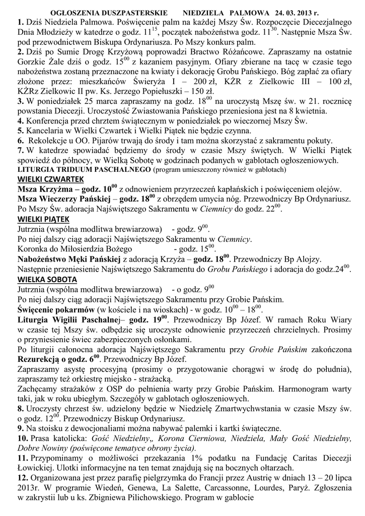OGŁOSZENIA DUSZPASTERSKIE NIEDZIELA PALMOWA 24. 03. 2013 r. 1. Dziś Niedziela Palmowa. Poświęcenie palm na każdej Mszy Św. Rozpoczęcie Diecezjalnego Dnia Młodzieży w katedrze o godz. 1115, początek nabożeństwa godz. 1130. Następnie Msza Św. pod przewodnictwem Biskupa Ordynariusza. Po Mszy konkurs palm. 2. Dziś po Sumie Drogę Krzyżową poprowadzi Bractwo Różańcowe. Zapraszamy na ostatnie Gorzkie Żale dziś o godz. 1500 z kazaniem pasyjnym. Ofiary zbierane na tacę w czasie tego nabożeństwa zostaną przeznaczone na kwiaty i dekorację Grobu Pańskiego. Bóg zapłać za ofiary złożone przez: mieszkańców Świeryża I – 200 zł, KŻR z Zielkowic III – 100 zł, KŻRz Zielkowic II pw. Ks. Jerzego Popiełuszki – 150 zł. 3. W poniedziałek 25 marca zapraszamy na godz. 1800 na uroczystą Mszę św. w 21. rocznicę powstania Diecezji. Uroczystość Zwiastowania Pańskiego przeniesiona jest na 8 kwietnia. 4. Konferencja przed chrztem świątecznym w poniedziałek po wieczornej Mszy Św. 5. Kancelaria w Wielki Czwartek i Wielki Piątek nie będzie czynna. 6. Rekolekcje u OO. Pijarów trwają do środy i tam można skorzystać z sakramentu pokuty. 7. W katedrze spowiadać będziemy do środy w czasie Mszy świętych. W Wielki Piątek spowiedź do północy, w Wielką Sobotę w godzinach podanych w gablotach ogłoszeniowych. LITURGIA TRIDUUM PASCHALNEGO (program umieszczony również w gablotach) WIELKI CZWARTEK Msza Krzyżma – godz. 1000 z odnowieniem przyrzeczeń kapłańskich i poświęceniem olejów. Msza Wieczerzy Pańskiej – godz. 1800 z obrzędem umycia nóg. Przewodniczy Bp Ordynariusz. Po Mszy Św. adoracja Najświętszego Sakramentu w Ciemnicy do godz. 2200. WIELKI PIĄTEK Jutrznia (wspólna modlitwa brewiarzowa) - godz. 900. Po niej dalszy ciąg adoracji Najświętszego Sakramentu w Ciemnicy. Koronka do Miłosierdzia Bożego - godz. 1500. Nabożeństwo Męki Pańskiej z adoracją Krzyża – godz. 1800. Przewodniczy Bp Alojzy. Następnie przeniesienie Najświętszego Sakramentu do Grobu Pańskiego i adoracja do godz.2400. WIELKA SOBOTA Jutrznia (wspólna modlitwa brewiarzowa) - o godz. 900 Po niej dalszy ciąg adoracji Najświętszego Sakramentu przy Grobie Pańskim. Święcenie pokarmów (w kościele i na wioskach) - w godz. 1000 – 1800. Liturgia Wigilii Paschalnej– godz. 1900. Przewodniczy Bp Józef. W ramach Roku Wiary w czasie tej Mszy św. odbędzie się uroczyste odnowienie przyrzeczeń chrzcielnych. Prosimy o przyniesienie świec zabezpieczonych osłonkami. Po liturgii całonocna adoracja Najświętszego Sakramentu przy Grobie Pańskim zakończona Rezurekcją o godz. 600. Przewodniczy Bp Józef. Zapraszamy asystę procesyjną (prosimy o przygotowanie chorągwi w środę do południa), zapraszamy też orkiestrę miejsko - strażacką. Zachęcamy strażaków z OSP do pełnienia warty przy Grobie Pańskim. Harmonogram warty taki, jak w roku ubiegłym. Szczegóły w gablotach ogłoszeniowych. 8. Uroczysty chrzest św. udzielony będzie w Niedzielę Zmartwychwstania w czasie Mszy św. o godz. 1200. Przewodniczy Biskup Ordynariusz. 9. Na stoisku z dewocjonaliami można nabywać palemki i kartki świąteczne. 10. Prasa katolicka: Gość Niedzielny,, Korona Cierniowa, Niedziela, Mały Gość Niedzielny, Dobre Nowiny (poświęcone tematyce obrony życia). 11. Przypominamy o możliwości przekazania 1% podatku na Fundację Caritas Diecezji Łowickiej. Ulotki informacyjne na ten temat znajdują się na bocznych ołtarzach. 12. Organizowana jest przez parafię pielgrzymka do Francji przez Austrię w dniach 13 – 20 lipca 2013r. W programie Wiedeń, Genewa, La Salette, Carcassonne, Lourdes, Paryż. Zgłoszenia w zakrystii lub u ks. Zbigniewa Pilichowskiego. Program w gablocie