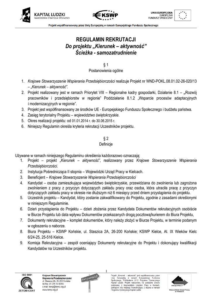 REGULAMIN REKRUTACJI Do projektu „Kierunek – aktywność” Ścieżka - samozatrudnienie §1 Postanowienia ogólne 1. Krajowe Stowarzyszenie Wspierania Przedsiębiorczości realizuje Projekt nr WND-POKL.08.01.02-26-020/13 – „Kierunek – aktywność”. 2. Projekt realizowany jest w ramach Priorytet VIII – Regionalne kadry gospodarki, Działanie 8.1 – „Rozwój pracowników i przedsiębiorstw w regionie” Poddziałanie 8.1.2 „Wsparcie procesów adaptacyjnych i modernizacyjnych w regionie”. 3. Projekt jest współfinansowany ze środków UE - Europejskiego Funduszu Społecznego i budżetu państwa. 4. Zasięg terytorialny Projektu – województwo świętokrzyskie. 5. Okres realizacji projektu: od 01.01.2014 r. do 30.06.2015 r. 6. Niniejszy Regulamin określa kryteria rekrutacji Uczestników projektu. §2 Definicje Używane w ramach niniejszego Regulaminu określenia każdorazowo oznaczają: 1. Projekt – projekt „Kierunek – aktywność”, realizowany przez Krajowe Stowarzyszenie Wspierania Przedsiębiorczości. 2. Instytucja Pośrednicząca II stopnia – Wojewódzki Urząd Pracy w Kielcach. 3. Beneficjent – Krajowe Stowarzyszenie Wspierania Przedsiębiorczości 4. Kandydat – osoba zamieszkująca województwo świętokrzyskie, przewidziana do zwolnienia lub zagrożona zwolnieniem z pracy z przyczyn dotyczących zakładu pracy oraz osoba, która utraciła pracę z przyczyn dotyczących zakładu pracy w okresie nie dłuższym niż 6 miesięcy przed dniem przystąpienia do projektu. 5. Uczestnik projektu – Kandydat, który zostanie zakwalifikowany do Projektu, zgodnie z zasadami określonymi w niniejszym Regulaminie. 6. Dzień przystąpienia do Projektu – dzień złożenia przez Kandydata Dokumentów rekrutacyjnych osobiście w Biurze Projektu lub data wpływu Dokumentów przekazanych drogą pocztową/kurierem do Biura Projektu, 7. Dokumenty rekrutacyjne – komplet dokumentów, który należy złożyć w Biurze Projektu, w terminie podanym w ogłoszeniu o naborze. 8. Biura Projektu – KSWP Końskie, ul. Staszica 2A, 26-200 Końskie; KSWP Kielce, Al. IX Wieków Kielc 6/24-25, 25-516 Kielce. 9. Komisja Rekrutacyjna – zespół oceniający Dokumenty rekrutacyjne do Projektu i dokonujący kwalifikacji Kandydatów na Uczestników projektu. 1 §3 Uczestnicy projektu 1. Wsparcie kierowane jest do osób zamieszkujących województwo świętokrzyskie, przewidzianych do zwolnienia lub zagrożonych zwolnieniem z pracy z przyczyn dotyczących zakładu pracy oraz osób, które utraciły pracę z przyczyn dotyczących zakładu pracy w okresie nie dłuższym niż 6 miesięcy przed dniem przystąpienia do projektu. 2. Priorytetowo traktowane będą : kobiety - 3 pkt. osoby, które na pewno utracą pracę z przyczyn dotyczących zakładu pracy - 3 pkt., osoby, które utraciły już zatrudnienie z przyczyn dotyczących zakładu pracy - 5 pkt. §4 Wyłączenia z udziału w Projekcie 1. W Projekcie nie mogą uczestniczyć: a. osoby zatrudnione u Beneficjenta lub w Instytucji Pośredniczącej II stopnia, b. osoby, które korzystają równolegle z innych środków publicznych, w tym zwłaszcza ze środków Funduszu Pracy, PFRON oraz w ramach Poddziałania 8.1.2 / Działania 6.2, na rozpoczęcie działalności gospodarczej, c. osoby, które były wspólnikami spółek osobowych prawa handlowego (spółki jawnej, spółki partnerskiej, spółki komandytowej, spółki komandytowo-akcyjnej) oraz spółek cywilnych w okresie 12 kolejnych miesięcy przed przystąpieniem do Projektu, d. osoby, które były udziałowcami lub akcjonariuszami spółek kapitałowych prawa handlowego (spółek z ograniczoną odpowiedzialnością, spółek akcyjnych) w okresie 12 kolejnych miesięcy przed przystąpieniem do Projektu. Dopuszczalne jest uczestnictwo w Projekcie udziałowców lub akcjonariuszy spółek kapitałowych prawa handlowego, których akcje są notowane na giełdzie papierów wartościowych, e. osoby, które były członkami spółdzielni utworzonych na podstawie prawa spółdzielczego w okresie 12 kolejnych miesięcy przed przystąpieniem do Projektu. Dopuszczalne jest uczestnictwo w Projekcie osób będących członkami spółdzielni oszczędnościowo-pożyczkowych, spółdzielni budownictwa mieszkaniowego i banków spółdzielczych, jeżeli nie osiągają przychodu z tytułu tego członkowstwa, f. osoby, które w bieżącym roku kalendarzowym oraz dwóch poprzedzających go latach kalendarzowych otrzymały pomoc de minimis z różnych źródeł i w różnych formach, której wartość brutto łącznie z pomocą, o którą ubiega się dana osoba, przekracza równowartość w złotych kwoty 200 000 euro, a w przypadku podmiotu, który miał zarejestrowaną działalność gospodarczą w sektorze transportu drogowego równowartość w złotych kwoty 100 000 euro, obliczonych według średniego kursu Narodowego Banku Polskiego obowiązującego w dniu udzielenia pomocy. g. osoby, które były zarejestrowane w Ewidencji Działalności Gospodarczej, Krajowym Rejestrze Sądowym, Centralnej Ewidencji i Informacji o Działalności Gospodarczej lub prowadziły działalność na podstawie odrębnych przepisów (w tym m.in. działalność adwokacką, komorniczą lub oświatową) w okresie 12 miesięcy poprzedzających dzień przystąpienia do projektu. 2. Nie jest dopuszczalne udzielenie wsparcia osobom planującym rozpoczęcie działalności gospodarczej w zakresie wymienionym w § 32 ust. 2 Rozporządzenia Ministra Rozwoju Regionalnego z dnia 15 grudnia 2010 r. w sprawie udzielania pomocy publicznej w ramach Programu Operacyjnego Kapitał Ludzki (Dz. U. z 2010 r. Nr 239, 2 poz. 1598) oraz Rozporządzenia Ministra Rozwoju Regionalnego z 20 października 2011 r. zmieniające rozporządzenie w sprawie udzielania pomocy publicznej w ramach Programu Operacyjnego Kapitał Ludzki (Dz. U. z 2011 r. Nr 233, poz. 1383). §5 Dokumenty rekrutacyjne Dokumenty rekrutacyjne składają się z następujących e