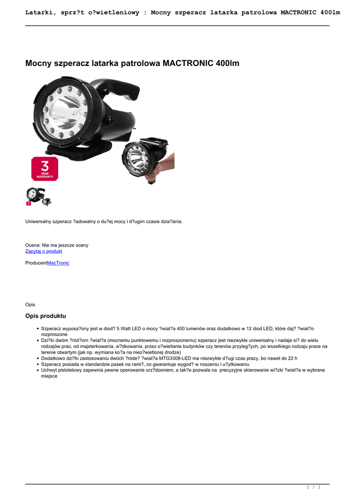Latarki, sprz?t o?wietleniowy : Mocny szperacz latarka patrolowa MACTRONIC 400lm Mocny szperacz latarka patrolowa MACTRONIC 400lm Uniwersalny szperacz ?adowalny o du?ej mocy i d?ugim czasie dzia?ania. Ocena: Nie ma jeszcze oceny Zapytaj o produkt ProducentMacTronic Opis Opis produktu Szperacz wyposa?ony jest w diod? 5 Watt LED o mocy ?wiat?a 400 lumenów oraz dodatkowo w 12 diod LED, które daj? ?wiat?o rozproszone Dzi?ki dwóm ?ród?om ?wiat?a (mocnemu punktowemu i rozproszonemu) szperacz jest niezwykle uniwersalny i nadaje si? do wielu rodzajów prac, od majsterkowania, w?dkowania, przez o?wietlanie budynków czy terenów przyleg?ych, po wszelkiego rodzaju prace na terenie otwartym (jak np. wymiana ko?a na nieo?wietlonej drodze) Dodatkowo dzi?ki zastosowaniu dwóch ?róde? ?wiat?a MTG3308-LED ma niezwykle d?ugi czas pracy, bo nawet do 22 h Szperacz posiada w standardzie pasek na rami?, co gwarantuje wygod? w noszeniu i u?ytkowaniu Uchwyt pistoletowy zapewnia pewne operowanie urz?dzeniem, a tak?e pozwala na precyzyjne skierowanie wi?zki ?wiat?a w wybrane miejsce 1 / 1 Powered by TCPDF (www.tcpdf.org)