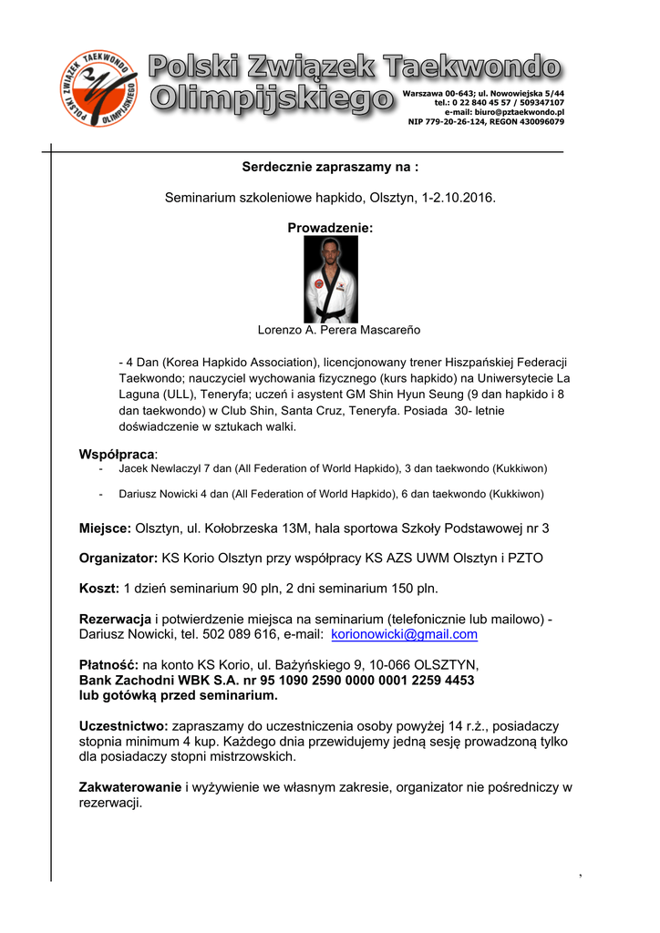 Warszawa 00-643; ul. Nowowiejska 5/44 tel.: 0 22 840 45 57 / 509347107 e-mail: [email protected] NIP 779-20-26-124, REGON 430096079 Serdecznie zapraszamy na : Seminarium szkoleniowe hapkido, Olsztyn, 1-2.10.2016. Prowadzenie: Lorenzo A. Perera Mascareño - 4 Dan (Korea Hapkido Association), licencjonowany trener Hiszpańskiej Federacji Taekwondo; nauczyciel wychowania fizycznego (kurs hapkido) na Uniwersytecie La Laguna (ULL), Teneryfa; uczeń i asystent GM Shin Hyun Seung (9 dan hapkido i 8 dan taekwondo) w Club Shin, Santa Cruz, Teneryfa. Posiada 30- letnie doświadczenie w sztukach walki. Współpraca: - Jacek Newlaczyl 7 dan (All Federation of World Hapkido), 3 dan taekwondo (Kukkiwon) - Dariusz Nowicki 4 dan (All Federation of World Hapkido), 6 dan taekwondo (Kukkiwon) Miejsce: Olsztyn, ul. Kołobrzeska 13M, hala sportowa Szkoły Podstawowej nr 3 Organizator: KS Korio Olsztyn przy współpracy KS AZS UWM Olsztyn i PZTO Koszt: 1 dzień seminarium 90 pln, 2 dni seminarium 150 pln. Rezerwacja i potwierdzenie miejsca na seminarium (telefonicznie lub mailowo) Dariusz Nowicki, tel. 502 089 616, e-mail: [email protected] Płatność: na konto KS Korio, ul. Bażyńskiego 9, 10-066 OLSZTYN, Bank Zachodni WBK S.A. nr 95 1090 2590 0000 0001 2259 4453 lub gotówką przed seminarium. Uczestnictwo: zapraszamy do uczestniczenia osoby powyżej 14 r.ż., posiadaczy stopnia minimum 4 kup. Każdego dnia przewidujemy jedną sesję prowadzoną tylko dla posiadaczy stopni mistrzowskich. Zakwaterowanie i wyżywienie we własnym zakresie, organizator nie pośredniczy w rezerwacji. , Program: 1. 2. 3. 4. 5. specyficzne ciosy i kopnięcia dla hapkido; dźwignie nadgarstkowe i barkowe, rzuty trening padów; zastosowanie technik hapkido i taekwondo w samoobronie (hosinsul); przygotowanie mentalne w hapkido (ćwiczenia oddechowe i wizualizacyjne), Sobota, 1.10.2016, sesje treningowe: 13:00 -14.30 15:00 – 16.30 17:00 – 18:30 19.00 - Spotkanie z Prezesem Polskiego Związku Taekwondo Olimpijskiego. Niedziela, 2.10.2016, sesje treningowe: 9:00 – 10:30 11:00 – 12:30 13:00 – 14:30 • Uwaga: uczestnicy seminarium winni być ubezpieczeni we własnym zakresie od następstw nieszczęśliwych wypadków lub posiadać potwierdzenie objęcia ubezpieczeniem NNW przez macierzysty Klub. Osoby niepełnoletnie powinny posiadać pisemną zgodę rodziców/opiekunów prawnych. Organizator nie ponosi odpowiedzialności za ewentualne wypadki w trakcie uczestniczenia w seminarium. , , ,