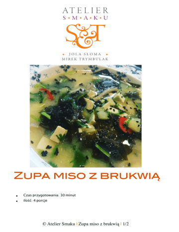 Zupa miso z brukwią • Czas przygotowania: 30 minut • ilość: 4 porcje © Atelier Smaku | Zupa miso z brukwią | 1/2 Składniki: • 15 dag brukwi • 20 dag tofu • 10 dag boczniaka • 1/2 papryczki chilli • 3 łyżki białego miso z ryżem • kilka wodorostów Wakame • 1 garść liści świeżej kolendry • 1 łyżka podprażonych ziaren czarnego sezamu • 1/3 łyżeczki curry • 1/3 łyżeczki czarnego mielonego pieprzu • 1 litr wody • 1 łyżka oleju sezamowego do polania Sposób przygotowania: Wakame kroimy w paski i na kilka minut zalewamy wrzątkiem, by zmiękły i zwiększyły swoją objętość. Boczniaki kroimy w paski, brukiew w kostkę i wrzucamy wszystko do wrzącej się wody. Gotujemy, aż brukiew zmięknie, następnie dodajemy pokrojone w plastry i pozbawione pestek chilli, a także curry i pieprz oraz Wakame. Całość gotujemy minutę i dorzucamy pokrojone w małą kostkę tofu i posiekaną kolendrę. Na koniec dodajemy miso rozmieszane w odrobinie zupy. Nakładamy do talerzy, posypujemy prażonym czarnym sezamem i skrapiamy olejem sezamowym. Smacznego, na zdrowie. © Atelier Smaku | Zupa miso z brukwią | 2/2
