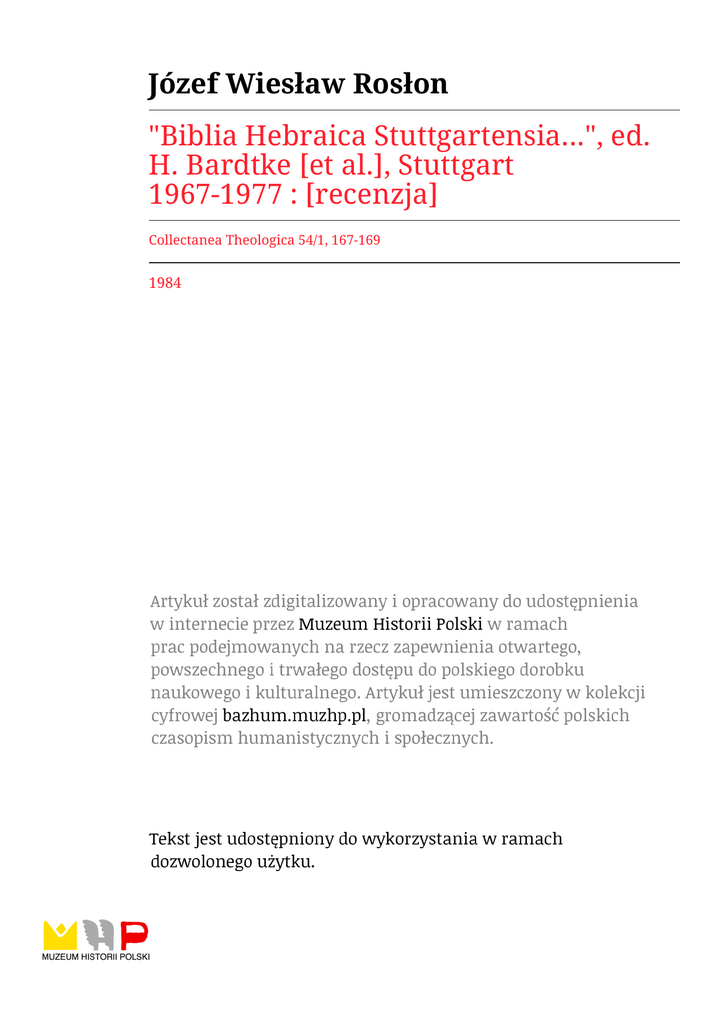 Józef Wiesław Rosłon "Biblia Hebraica Stuttgartensia...", ed. H