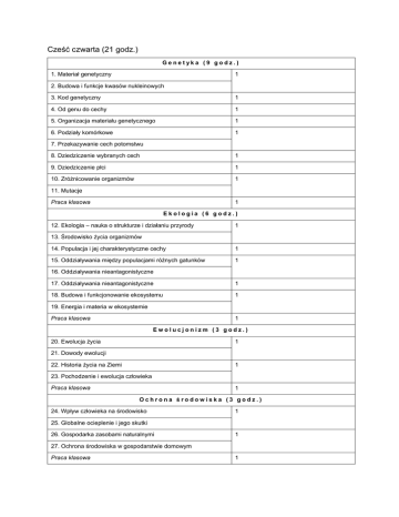 Cześć czwarta (21 godz.) Ge ne t yk a (9 godz.) 1. Materiał genetyczny 1 2. Budowa i funkcje kwasów nukleinowych 3. Kod genetyczny 1 4. Od genu do cechy 1 5. Organizacja materiału genetycznego 1 6. Podziały komórkowe 1 7. Przekazywanie cech potomstwu 8. Dziedziczenie wybranych cech 1 9. Dziedziczenie płci 1 10. Zróżnicowanie organizmów 1 11. Mutacje Praca klasowa 1 Ekologia (6 godz.) 12. Ekologia – nauka o strukturze i działaniu przyrody 1 13. Środowisko życia organizmów 14. Populacja i jej charakterystyczne cechy 1 15. Oddziaływania między populacjami różnych gatunków 1 16. Oddziaływania nieantagonistyczne 17. Oddziaływania nieantagonistyczne 1 18. Budowa i funkcjonowanie ekosystemu 1 19. Energia i materia w ekosystemie Praca klasowa 1 Ewolucjonizm (3 godz.) 20. Ewolucja życia 1 21. Dowody ewolucji 22. Historia życia na Ziemi 1 23. Pochodzenie i ewolucja człowieka Praca klasowa 1 Ochrona środowiska (3 godz.) 24. Wpływ człowieka na środowisko 1 25. Globalne ocieplenie i jego skutki 26. Gospodarka zasobami naturalnymi 1 27. Ochrona środowiska w gospodarstwie domowym Praca klasowa 1