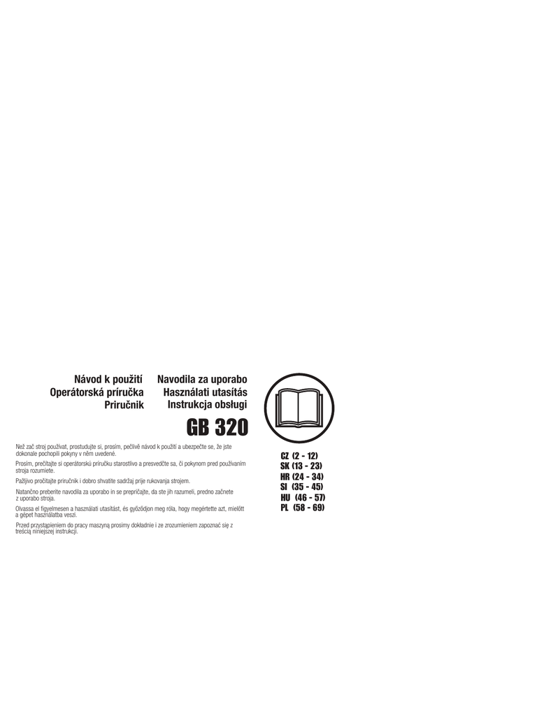 Návod k použití Operátorská príručka Priručnik Navodila za uporabo Használati utasítás Instrukcja obsługi GB 320 Než zač stroj používat, prostudujte si, prosím, pečlivě návod k použití a ubezpečte se, že jste dokonale pochopili pokyny v něm uvedené. Prosím, prečítajte si operátorskú príručku starostlivo a presvedčte sa, či pokynom pred používaním stroja rozumiete. Pažljivo pročitajte priručnik i dobro shvatite sadržaj prije rukovanja strojem. Natančno preberite navodila za uporabo in se prepričajte, da ste jih razumeli, predno začnete z uporabo stroja. Olvassa el figyelmesen a használati utasítást, és győződjon meg róla, hogy megértette azt, mielőtt a gépet használatba veszi. Przed przystąpieniem do pracy maszyną prosimy dokładnie i ze zrozumieniem zapoznać się z treścią niniejszej instrukcji. CZ (2 - 12) SK (13 - 23) HR (24 - 34) SI (35 - 45) HU (46 - 57) PL (58 - 69) OBSAH Úvod Identifikace symbolů Obecná bezpečnostní opatření Co je co? Montaž Použití 2 3 3 5 5 6 Údržba Skladování Vyhledávání a odstraňování závad Prohlášení o shodě Technická data 9 10 11 12 12 ÚVOD Vážený zákazníku, Děkujeme, že jste si zvolili výrobek společnosti McCulloch. Stali jse se tak součástí příběhu, který se započal již velmi dávno, kdy společnost McCulloch Corporation zahájila během 2. světové války výrobu motorů. V roce 1949, kdy společnost McCulloch představila svou první řetězovou pilu pro jednoho uživatele, se zpracování dřeva navždy změnilo. Během desítek let vyráběla firma řadu průkopnických řetězových pil. Firma rostla, nejprve díky výrobě leteckých motorů a motorů pro motokáry v padesátých letech minulého století a posléze díky miniaturním řetězovým pilám v letech šedesátých. Později, v 70. a 80. letech, byla výrobní řada rozšířena o vyžínače a vysavače listí. Dnes, jako součást skupiny Husqvarna, pokračuje firma McCulloch v tradici výroby výkonných motorů, technických novinek a výrazných designů, které tvořily milníky po více než půl století. Našimi hlavními prioritami je snížení spotřeby paliva, emisí a hlučnosti a také zvýšení bezpečnosti a uživatelského komfortu. Samozřejmě doufáme, že budete s naším výrobkem McCulloch spokojeni, neboť byl vyroben tak, aby vám nerozlučně sloužil po dlouhou dobu. Jeho životnost dále prodloužíte tím, když budete dodržovat pokyny k použití, servisu a údržbě v tomto návodu k používání. Pokud budete potřebovat odbornou pomoc při opravě nebo servisu, použijte službu Service Locator na webu www.mcculloch.com. Společnost McCulloch se řídí strategií neustálého vývoje výrobku a proto si vyhrazuje právo měnit konstrukci a vzhled výrobků bez předchozího upozornění. Tento návod je rovněž k dispozici ke stažení na webu www.mcculloch.com. -- 2 -- IDENTIFIKACE SYMBOLŮ VÝSTRAHA! Toto fukaru může být nebezpečné! Nevhodné použití nebo nedostatečná péče mohou způsobit vážnou nebo dokonce fatální nehodu Používejte výhradně bezolovnatý benzín nebo kvalitní olovnatý benzin a olej pro dvoutaktní motory. Před použitím fukaru si pozorně přečtěte návod k použití. VÝSTRAHA! Fukar může odmrštit různé předměty vysokou rychlostí tak, že se mohou odrazit a dopadnout na pracovníka. Může tak dojít k vážnému poškození očí. Povinné nošení ochranných brýlí, homologované chránice sluchu a při práci v prašném prostředí obličejovou masku nebo pruhledného štítu. VÝSTRAHA! Tlumič je při provozu i po jeho skončení velmi horký. Nedotýkejte se tlumiče, krytu tlumiče ani okolních ploch; dávejte také pozor, aby s ním nepřišel do kontaktu hořlavý materiál jako suchá tráva nebo palivo. Vždy používejte schválené ochranné rukavice. Obsluha stroje musí zajistit, že se během práce nikdo nedostane do blízkosti stroje (poloměr 15 metrů). Jestliže ve stejné oblasti pracuje více osob, musí být mezi nimi dodržena bezpečnostní vzdálenost nejméně 15 metrů. VÝSTRAHA! Zkontrolujte, zda je spodní kryt zajištěn a zda je potrubí vysavače řádně instalováno. Oběžného kola se nedotýkejte rukou ani cizím předmětem. Pokyny k otevření krytu nasávání vysavače. Lehce skloňte držadlo šroubováku směrem k přední části přístroje, abyste západku uvolnili, a současně druhou rukou vytáhněte kryt sání. Svoji jednotku používejte jako vysavač pro následující účely: sbírání suchého materiálu (například listí, trávy, malých větviček a kousků papíru). Nepoužívejte přístroj jako vysavač pro následující účely: sbírání kamenů, štěrku, kov, rozbité sklo, atd., aby se zabránilo vážné poškození rotující lopatky. Hladina akustického výkonu Hladina akustického tlaku ve vzdálenosti 7,5 metrová OBECNÁ BEZPEČNOSTNÍ OPATŘENÍ VÝSTRAHA: V případě nedodržování veškerých bezpečnostních pravidel a při denostatečné opatrnosti může dojít k vážnému zranění. SE SVOJÍ JEDNOTKOU SE SEZNAMTE S Pžed použitím jednotky si pozorně přečtěte návod k obsluze, až mu dokonale porozumíte a můžete dodržet všechna bezpečnostní pravidla a varování. D Používání jednotky musí být omezeno na osoby, jež rozumění všem varováním, výstrahám a bezpečnostním pravidlům v této příručce a budou je dodržovat. VÝSTRAHA: Před spuštěním jednotky zkontrolujte pracoviště. Odstraňte veškerou suť a tvrdé objekty (například kamínky, sklo, dráty atd.), které by se za provozu mohly odra- zit, mohly by být vrženy nebo by mohly jinak způsobit úraz nebo jiné škody. Svoji jednotku používejte jako fukaru pro následující účely: D Odstranování štěrku nebo posekané trávy z vozovek, chodníků, teras, dvorů atd. D Odfukování posekané trávy, sl