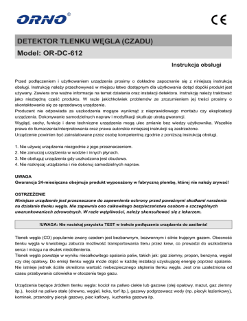 DETEKTOR TLENKU WĘGLA (CZADU) Model: OR-DC-612 Instrukcja obsługi Przed podłączeniem i użytkowaniem urządzenia prosimy o dokładne zapoznanie się z niniejszą instrukcją obsługi. Instrukcję należy przechowywać w miejscu łatwo dostępnym dla użytkowania dotąd dopóki produkt jest używany. Zawiera ona ważne informacje na temat działania oraz instalacji detektora. Instrukcję należy traktować jako niezbędną część produktu. W razie jakichkolwiek problemów ze zrozumieniem jej treści prosimy o skontaktowanie się ze sprzedawcą urządzenia. Producent nie odpowiada za uszkodzenia mogące wyniknąć z nieprawidłowego montażu czy eksploatacji urządzenia. Dokonywanie samodzielnych napraw i modyfikacji skutkuje utratą gwarancji. Wygląd, cechy, funkcje i dane techniczne urządzenia mogą ulec zmianie bez wiedzy użytkownika. Wszelkie prawa do tłumaczenia/interpretowania oraz prawa autorskie niniejszej instrukcji są zastrzeżone. Urządzenie powinien być zainstalowane przez osobę kompetentną zgodnie z poniższą instrukcją obsługi. 1. Nie używaj urządzenia niezgodnie z jego przeznaczeniem. 2. Nie zanurzaj urządzenia w wodzie i innych płynach. 3. Nie obsługuj urządzenia gdy uszkodzona jest obudowa. 4. Nie rozkręcaj urządzenia i nie dokonuj samodzielnych napraw. UWAGA Gwarancja 24-miesięczna obejmuje produkt wyposażony w fabryczną plombę, której nie należy zrywać! OSTRZEŻENIE Niniejsze urządzenie jest przeznaczone do zapewnienia ochrony przed poważnymi skutkami narażenia na działanie tlenku węgla. Nie zapewnia ono całkowitego bezpieczeństwa osobom o szczególnych uwarunkowaniach zdrowotnych. W razie wątpliwości, należy skonsultować się z lekarzem. !UWAGA: Nie naciskaj przycisku TEST w trakcie podłączenia urządzenia do zasilania! Tlenek węgla (CO) popularnie zwany czadem jest bezbarwnym, bezwonnym i silnie trującym gazem. Obecność tlenku węgla w krwiobiegu zaburza możliwość transportowania tlenu przez krew, co prowadzi do uszkodzenia serca i mózgu na skutek niedotlenienia. Tlenek węgla powstaje w wyniku niecałkowitego spalania paliw, takich jak: gaz ziemny, propan, benzyna, węgiel czy olej opałowy. Do emisji tlenku węgla może dojść w każdej instalacji uzyskującej energię poprzez spalanie. Nie istnieje jednak ściśle określona wartość niebezpiecznego stężenia tlenku węgla. Jest ona uzależniona od czasu przebywania człowieka w otoczeniu tego gazu. Urządzenia będące źródłem tlenku węgla: kocioł na paliwo ciekłe lub gazowe (olej opałowy, mazut, gaz ziemny itp.), kocioł na paliwo stałe (drewno, węgiel, koks, torf itp.), gazowy podgrzewacz wody (np. piecyk łazienkowy), kominek, przenośny piecyk gazowy, piec kaflowy, kuchenka gazowa itp. Możliwe przyczyny wysokiego stężenia tlenku węgla w budynku mieszkalnym: Nieprawidłowe lub niestaranne zainstalowanie urządzenia spalającego paliwa. Niedrożne lub popękane kominy. Niedrożne kanały wentylacyjne lub szczelne zabezpieczenia przed przeciągami. Silniki spalinowe samochodów, kosiarek itd. uruchomione i pozostawione w pomieszczeniach zamkniętych. Przenośne podgrzewacze parafinowe lub gazowe w źle wentylowanych pomieszczeniach. Objawy zatrucia tlenkiem węgla Stężenie CO Czas wdychania (przybliżony) i rozwój objawów w powietrzu ppm* 50 Maksymalne dopuszczalne stężenie przy ciągłym narażeniu przez okres 8 godz. 150 Lekki ból głowy po 1,5 godz. 200 Lekki ból głowy, zmęczenie, zawroty głowy, nudności po 2-3 godz. 400 Ból z przodu głowy w ciągu 1-2 godz. Zagrożenie życia po 3 godz. 800 Zawroty głowy, nudności i konwulsje w ciągu 45 min. Utrata przytomności w ciągu 2 godz. Śmierć w ciągu 2-3 godz.. 1600 Ból głowy, zawroty głowy i nudności w ciągu 20 min. Śmierć w ciągu 1 godz. 3200 Ból głowy, zawroty głowy i nudności w ciągu 5-10 min. Śmierć w ciągu 25-30 min. 6400 Ból głowy, zawroty głowy i nudności w ciągu 1-2 min. Śmierć w ciągu 10-15 min. 12800 Śmierć w ciągu 1-3 min. Jednostka ppm określa stężenie (trującego) gazu. CHARAKTERYSTYKA: FUNKCJE: Czujnik OR-DC-612 posiada: Czujnik OR-DC-612 jest nowoczesnym urządzeniem alarmowym zaprojektowanym do ciągłego monitoringu stężenia tlenku węgla CO (czadu) wykorzystując wysokiej jakości komponent wykonany w najbardziej zaawansowanej technologii. Detektor nie wykrywa innych trujących lub łatwopalnych gazów. wysokiej jakości czujnik elektrochemiczny „ECO-Cell” powiadomienie optyczne i dźwiękowe, podświetlany wyświetlacz LCD, zasilacz do gniazdka DC5V/500mA przycisk TEST, który pozwala sprawdzić poprawność działania czujnika, sygnalizację za pomocą diod (czerwona, zielona, żółta), funkcję pomiaru stężenia tlenku węgla w zakresie od 30 ppm do 999 ppm, funkcję pamięci (zapamiętuje ostatnie najwyższe stężenie tlenku węgla, które wywoła alarm) zgodność z normą EN-50291 -1:2010/A1:2012 dla domowych detektorów tlenku węgla SPECYFIKACJA TECHNICZNA: Zasilanie: AC 100~240V, 50/60Hz, DC5V/500mA Rodzaj czujnika: elektrochemiczny wykrywacz tlenku węgla “ECO-Cell” 50 ppm 60~90 min Czułość i czas działania: 100 ppm 10~40 min 300 ppm <3 minut Poziom głośności: Dokładność wyświetlacza: 85 dB na 1m przy alarmie pulsującym 3,4 ± 0,5 KHz 30-999 ppm (±30%) zmierzona w warunkach 20oC (±5oC) przy ciśnieniu atmosferycznym ±10% oraz wilgotności względnej 40% (±5%). Temperatura: od -10°C do 40°C Dopuszczalna wilgotność: zakres pracy w warunkach 10%-90% wilgotności względnej Wymiary: 122mm×77mm×35mm (szer./wys./gł.), zasilacz 75 x 60 x 25 mm (szer./wys./gł.) Waga netto: 0,12 kg BUDOWA URZĄDZENIA 1. Podświetlany wyświetlacz LCD 2. Dioda czerwona – ALARM 3. Otwór wentylacyjny 4. Dioda zielona - ZASILANIE 5. Dioda żółta - BŁĄD 6. Przycisk TEST INSTALACJA URZĄDZENIA Czujnik powinien być zainstalowany w pomieszczeniach, w których zamontowane urządzenia mogą być źródłem zagro
