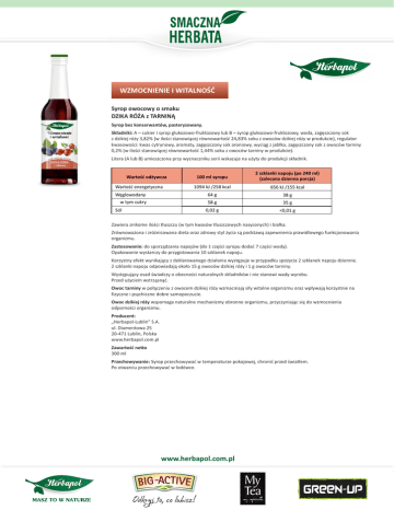 WZMOCNIENIE I WITALNOŚĆ Syrop owocowy o smaku DZIKA RÓŻA z TARNINĄ Syrop bez konserwantów, pasteryzowany. Składniki: A – cukier i syrop glukozowo-fruktozowy lub B – syrop glukozowo-fruktozowy, woda, zagęszczony sok z dzikiej róży 3,82% (w ilości stanowiącej równowartość 24,83% soku z owoców dzikiej róży w produkcie), regulator kwasowości: kwas cytrynowy, aromaty, zagęszczony sok aroniowy, wyciąg z jabłka, zagęszczony sok z owoców tarniny 0,2% (w ilości stanowiącej równowartość 1,44% soku z owoców tarniny w produkcie). Litera (A lub B) umieszczona przy wyznaczniku serii wskazuje na użyty do produkcji składnik. 100 ml syropu 2 szklanki napoju (po 240 ml) (zalecana dzienna porcja) 1094 kJ /258 kcal 656 kJ /155 kcal Węglowodany 64 g 38 g w tym cukry 58 g 35 g 0,02 g <0,01 g Wartość odżywcza Wartość energetyczna Sól Zawiera znikome ilości tłuszczu (w tym kwasów tłuszczowych nasyconych) i białka. Zrównoważona i zróżnicowana dieta oraz zdrowy styl życia są podstawą zapewnienia prawidłowego funkcjonowania organizmu. Zastosowanie: do sporządzania napojów (do 1 części syropu dodać 7 części wody). Opakowanie wystarczy do przygotowania 10 szklanek napoju. Korzystny efekt wynikający z deklarowanego działania występuje w przypadku spożycia 2 szklanek napoju dziennie. 2 szklanki napoju odpowiadają około 15 g owoców dzikiej róży i 1 g owoców tarniny. Występujący osad świadczy o obecności naturalnych składników i nie stanowi wady wyrobu. Przed użyciem wstrząsnąć. Owoc tarniny w połączeniu z owocem dzikiej róży wzmacniają siły witalne organizmu oraz wpływają korzystnie na fizyczne i psychiczne dobre samopoczucie. Owoc dzikiej róży wspomaga naturalne mechanizmy obronne organizmu, przyczyniając się do wzmocnienia odporności organizmu. Producent: „Herbapol-Lublin” S.A. ul. Diamentowa 25 20-471 Lublin, Polska www.herbapol.com.pl Zawartość netto 300 ml Przechowywanie: Syrop przechowywać w temperaturze pokojowej, chronić przed światłem. Po otwarciu przechowywać w lodówce. www.herbapol.com.pl