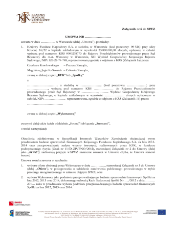 Załącznik nr 6 do SIWZ UMOWA NR …………………… zawarta w dniu ………….. w Warszawie (dalej „Umowa”), pomiędzy: 1. Krajowy Fundusz Kapitałowy S.A. z siedzibą w Warszawie (kod pocztowy: 00-526) przy ulicy Kruczej 16/22 o kapitale zakładowym w wysokości 23.800.000,00 złotych, opłacony w całości wpisaną pod numerem KRS 0000238773 do Rejestru Przedsiębiorców prowadzonego przez Sąd Rejonowy dla m.st. Warszawy w Warszawie, XII Wydział Gospodarczy Krajowego Rejestru Sądowego, NIP: 526-28-74-748, reprezentowaną zgodnie z odpisem z KRS (Załącznik 1a) przez: Czesława Gawłowskiego – Prezesa Zarządu, Magdalenę Jagiełło-Szostak – Członka Zarządu, zwaną w dalszej części „KFK” lub „Spółką” a ……………………….. z siedzibą w ……………….. (kod pocztowy: ………………) przy ……………….., wpisaną pod numerem KRS ……………… do Rejestru Przedsiębiorców prowadzonego przez Sąd Rejonowy w ……………, …….. Wydział Gospodarczy Krajowego Rejestru Sądowego, o kapitale zakładowym w wysokości ……………… złotych opłaconym w całości, NIP: ……………….. reprezentowaną, zgodnie z odpisem z KRS (Załącznik 1b) przez: …………………………… zwaną w dalszej części „Wykonawcą” zwanymi dalej także każda oddzielnie „Stroną” lub łącznie „Stronami”, o treści następującej: Określenia zdefiniowane w Specyfikacji Istotnych Warunków Zamówienia obejmującej swym przedmiotem badanie sprawozdań finansowych Krajowego Funduszu Kapitałowego S.A. za lata 20122014 oraz przeprowadzenie audytu wyceny inwestycji, realizowanych przez KFK, w fundusze podwyższonego ryzyka (Znak nr 11/D-ZP/PNO/2012), stanowiącej Załącznik nr 2 do Umowy (dalej jako „SIWZ”), zachowują przyjęte w SIWZ znaczenie również w Umowie chyba, że Umowa stanowi inaczej. Umowa została zawarta w rezultacie: 1. wyboru oferty złożonej przez Wykonawcę w dniu …………., stanowiącej Załącznik nr 3 do Umowy (dalej „Oferta”), w postępowaniu o udzielenie zamówienia publicznego prowadzonego w trybie przetargu nieograniczonego w zakresie objętym SIWZ, oraz 2. wyboru Wykonawcy jako podmiotu przeprowadzającego badanie sprawozdań finansowych Spółki za lata 2012, 2013 oraz 2014, dokonanego uchwałą Rady Nadzorczej Spółki Nr …./2012 z dnia ……… 201… roku w przedmiocie wyboru podmiotu przeprowadzającego badanie sprawozdań finansowych Spółki za lata 2012, 2013 oraz 2014. Krajowy Fundusz Kapitałowy S.A., ul. Krucza 16/22, 00-526 Warszawa, Tel. (+48) 22 578 26 86, fax (+48) 22 578 26 87, e-mail: [email protected] Sąd Rejonowy dla m. st. Warszawy w Warszawie, XII Wydział Gospodarczy Krajowego Rejestru Sądowego, KRS 0000238773 NIP 526-28-74-748, REGON 140182478, Kapitał zakładowy: 23.800.000 PLN Zarząd: Prezes Zarządu: Czesław Gawłowski, Członek Zarządu: Magdalena Jagiełło-Szostak, Członek Zarządu: Daniel Kawoń PRZEDMIOT UMOWY §1 1. KFK zleca, a Wykonawca zobowiązuje się do przeprowadzenia badania rocznych sprawozdań finansowych KFK za lata 2012, 2013 oraz 2014. 2. W ramach badania każdego z rocznych sprawozdań finansowych KFK za lata 2012, 2013 oraz 2014, Wykonawca zobowiązuje się wyodrębnić: 1) audyt wyceny inwestycji portfelowych KFK w fundusze podwyższonego w ramach dotacji celowej Ministra Gospodarki, za lata 2012, 2013 oraz 2014; ryzyka 2) audyt wyceny inwestycji portfelowych KFK w fundusze podwyższonego ryzyka w ramach projektu „Wspieranie funduszy kapitału podwyższonego ryzyka przez Krajowy Fundusz Kapitałowy” w ramach działania 3.2 „Wspieranie Funduszy Kapitału podwyższonego ryzyka” osi priorytetowej 3. „Kapitał dla innowacji” Programu Operacyjnego Innowacyjna Gospodarka 2007-2013 (dalej „Projekt POIG”), za lata 2012, 2013 oraz 2014; 3) audyt wyceny inwestycji portfelowych KFK w fundusze podwyższonego ryzyka w ramach projektu „Poprawa otoczenia biznesu i dostępu do finansowania małych i średnich przedsiębiorstw poprzez wspieranie funduszy podwyższonego ryzyka w ramach SzwajcarskoPolskiego Programu Współpracy (dalej „Projekt SPPW”), za lata 2012, 2013 oraz 2014. §2 METODYKA, OŚWIADCZENIA 1. Wykonawca zobowiązuje się do przeprowadzenia badania rocznych sprawozdań finansowych KFK za lata 2012, 2013 oraz 2014, w szczególności zgodnie z następującymi przepisami: Ustawą z dnia 29 września 1994 roku o rachunkowości (tekst jednolity Dz. U. z 2009, nr 152, poz. 1223 z późniejszymi zmianami), dalej „Ustawa”, Ustawą z dnia 7 maja 2009 roku o biegłych rewidentach i ich samorządzie, podmiotach uprawnionych do badania sprawozdań finansowych oraz o nadzorze publicznym (Dz. U. z 2009 r. nr 77, poz. 649 z późniejszymi zmianami), dalej „Ustawa o biegłych rewidentach” Normami badania ustalonymi przez Krajową Izbę Biegłych Rewidentów. Wykonawca oświadcza, że jest podmiotem uprawnionym do badania sprawozdań finansowych, zgodnie z art. 47 Ustawy o biegłych rewidentach, wpisanym na listę Krajowej Rady Biegłych Rewidentów pod nr …… KFK oświadcza, że Wykonawca został powołany do wykonania prac określonych w § 1 Umowy w trybie przewidzianym w art. 66 ust. 4 Ustawy, z rygorami określonymi w ust. 6 tego artykułu, przez Radę Nadzorczą KFK jako organu uprawnionego, zgodnie z § 21 ust. 2 pkt. 2) Statutu KFK, do wyboru podmiotu przeprowadzającego badanie sprawozdania finansowego KFK. 2/8 Krajowy Fundusz Kapitałowy S.A., ul. Krucza 16/22, 00-526 Warszawa, Tel. (+48) 22 578 26 86, fax (+48) 22 578 26 87, e-mail: [email protected] Sąd Rejonowy dla m. st. Warszawy w Warszawie, XII Wydział Gospodarczy Krajowego Rejestru Sądowego, KRS 0000238773 NIP 526-28-74-748, REGON 140182478, Kapitał zakładowy: 23.800.000 PLN Zarząd: Prezes Zarządu Czesław Gawłowski, Członek Zarządu: Magdalena Jagiełło-Szostak, Członek Zarządu: Daniel Kawoń HARMONOGRAM. WYKONANIE UMOWY §3 1
