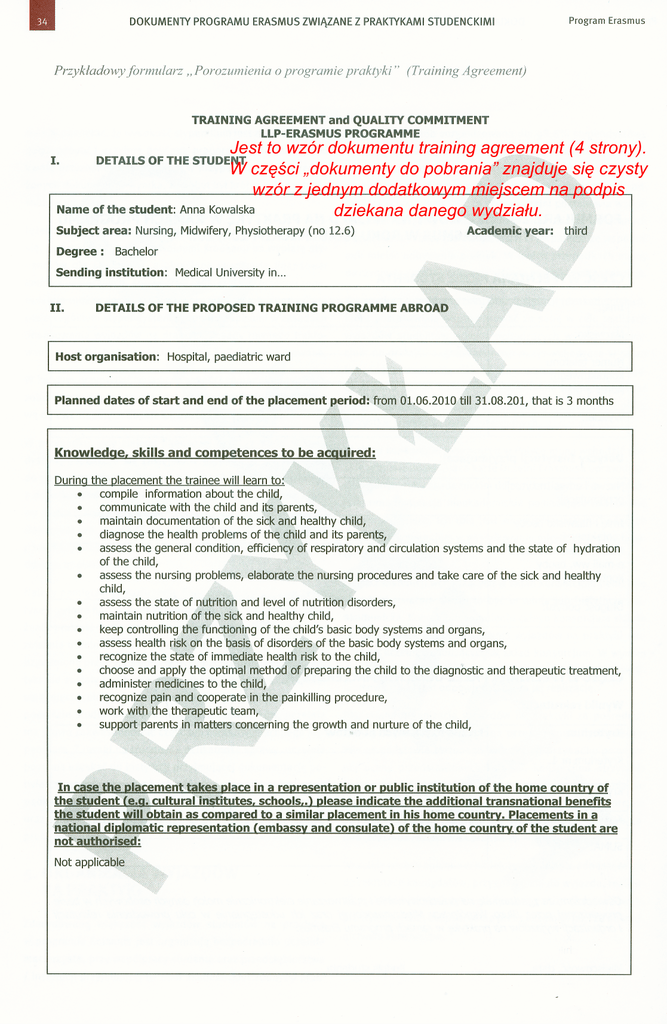 Jest to wzór dokumentu training agreement (4 strony). W części „dokumenty do pobrania” znajduje się czysty wzór z jednym dodatkowym miejscem na podpis dziekana danego wydziału.