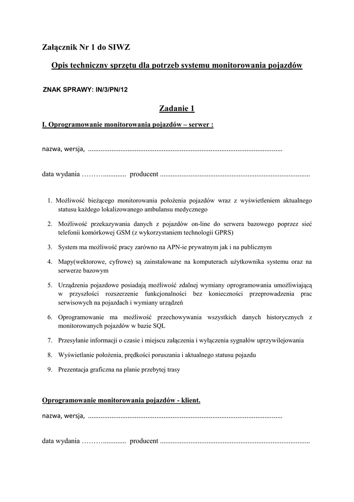 Załącznik Nr 1 do SIWZ Opis techniczny sprzętu dla potrzeb systemu monitorowania pojazdów ZNAK SPRAWY: IN/3/PN/12 Zadanie 1 I. Oprogramowanie monitorowania pojazdów – serwer : nazwa, wersja, ............................................................................................................ data wydania ………............. producent .................................................................................... 1. MoŜliwość bieŜącego monitorowania połoŜenia pojazdów wraz z wyświetleniem aktualnego statusu kaŜdego lokalizowanego ambulansu medycznego 2. MoŜliwość przekazywania danych z pojazdów on-line do serwera bazowego poprzez sieć telefonii komórkowej GSM (z wykorzystaniem technologii GPRS) 3. System ma moŜliwość pracy zarówno na APN-ie prywatnym jak i na publicznym 4. Mapy(wektorowe, cyfrowe) są zainstalowane na komputerach uŜytkownika systemu oraz na serwerze bazowym 5. Urządzenia pojazdowe posiadają moŜliwość zdalnej wymiany oprogramowania umoŜliwiającą w przyszłości rozszerzenie funkcjonalności bez konieczności przeprowadzenia prac serwisowych na pojazdach i wymiany urządzeń 6. Oprogramowanie ma moŜliwość przechowywania wszystkich danych historycznych z monitorowanych pojazdów w bazie SQL 7. Przesyłanie informacji o czasie i miejscu załączenia i wyłączenia sygnałów uprzywilejowania 8. Wyświetlanie połoŜenia, prędkości poruszania i aktualnego statusu pojazdu 9. Prezentacja graficzna na planie przebytej trasy Oprogramowanie monitorowania pojazdów - klient. nazwa, wersja, ............................................................................................................ data wydania ………............. producent .................................................................................... 1. Kontrola dostępu uŜytkowników do wybranych funkcji programu 2. Konfiguracja obiektu: a) wybór ikony przy pomocy której dany obiekt będzie wizualizowany na mapie (uŜytkownik ma moŜliwość definiowania własnych ikon) b) ustawienia częstotliwości aktualizacji pozycji obiektu c) edycja nazwy i opisu obiektu, który widoczny będzie na mapie d) opis i konfiguracja czujników oraz czytników podłączonych do obiektu 3. MoŜliwość przesyłania dowolnej treści komunikatów do obiektu lub grupy obiektów (pojazdów) w wypadku, gdy pojazd wyposaŜony jest dodatkowo w terminal 4. Automatyczna archiwizacja danych 5. Zarządzanie zdefiniowanymi grupami obiektów 6. Wybór sposobu i planowanie transmisji zgromadzonych danych w pamięci sterownika GPS 7. Funkcja "śledzenie" - powodującą automatyczne podąŜanie mapy za wybranym do śledzenia obiektem 8. Funkcja "pojedyncze odpytanie" - umoŜliwiające wyświetlenie pozycji i danych "z ostatniej chwili" 9. Funkcja "tylko wybrane obiekty" - funkcja powodująca wyświetlenie wyłącznie wybranych obiektów na mapie 10. MoŜliwość wygenerowania raportu drogowy za wybrany okres zawierającego m.in. : a) przebytą odległość b) łączny czas jazdy c) łączny czas postojów d) ilość zuŜytego paliwa e) liczbę tankowań f) liczbę gwałtownych ubytków paliwa g) średnia prędkość h) maksymalna prędkość i) łączny czas i ilość załączeń urządzeń (pompa, silnik, klapy, zawory itp.) j) szczegółowe zestawienie zmian powyŜszych wielkości Integracja: 1. Wykonawca zobowiązany jest do udostępnienia protokołu komunikacyjnego umoŜliwiającego komunikację z zewnętrznymi systemami. Udostępniony protokół winien zapewniać realizację min następujących funkcji: 2. a) moŜliwość przesyłania szczegółów zlecenia wezwanie z zewnętrznego systemu (opis zlecenia, adres zdarzenia) bezpośrednio do karetki, która ma realizować zlecenie wyjazdu. b) moŜliwość przesłania z terminala zainstalowanego w karetce oraz zapis w systemie zewnętrznym informacji o zmianie statusu, dokładny czas zmiany statusu, współrzędne geograficzne zmiany statusu (data wyjazdu, przyjazd na miejsce, wyjazd z miejsca, data powrotu) Oferowane rozwiązanie powinno mieć moŜliwość współpracy z wojewódzkim systemem komunikacji statusowej i lokalizacji pojazdów GPS uŜytkowanym przez jednostki Państwowej StraŜy PoŜarnej na terenie województwa kujawsko-pomorskiego w zakresie co najmniej wzajemnej wymiany danych o monitorowanych pojazdach. Sprzęt: Sterownik pojazdu: nazwa, model ............................................................................................................ data produkcji………............. producent .................................................................................... Sterownik pojazdu powinien posiadać następujące funkcje 1. Moduł GPS z SIRF STAR III; 2. Moduł GSM/GPRS, w którym do transmisji danych zastosowano przemysłowy moduł GSM z funkcją GPRS; 3.Moduł "czarnej skrzynki" - czyli układy pamięci umoŜliwiające rejestrację parametrów przejazdu i parametry pracy pojazdu. Częstotliwość zapisu danych jest zdalnie programowalna z krokiem zapisu nie gorszym niŜ co 5 sek. Moduł ten zapisuje rekord informacji zawierający takie dane jak: data, czas, pozycja, azymut, prędkość, status, stany czujników; 4. Moduł wejść cyfrowych - umoŜliwia podłączenie, sygnałów typu zał./wył. Podłączamy sygnał "ze stacyjki" oraz załączenia "sygnalizacji uprzywilejowania"; 5. Moduł podtrzymania bateryjnego - urządzenie posiada podtrzymanie bateryjne na minimum 6 godzin pracy; 6. Moduł RS - urządzenie umoŜliwia podłączenie terminala statusów; 7. Złącze umoŜliwiające podłączenie zewnętrznej, aktywnej anteny GPS odbierającej sygnały z satelitów, Terminal statusów z wyświetlaczem graficznym oraz ekranem dotykowym: nazwa, model ...................................................................................................................... data produkcji ………............. producent .............................................................................. 1. Prze