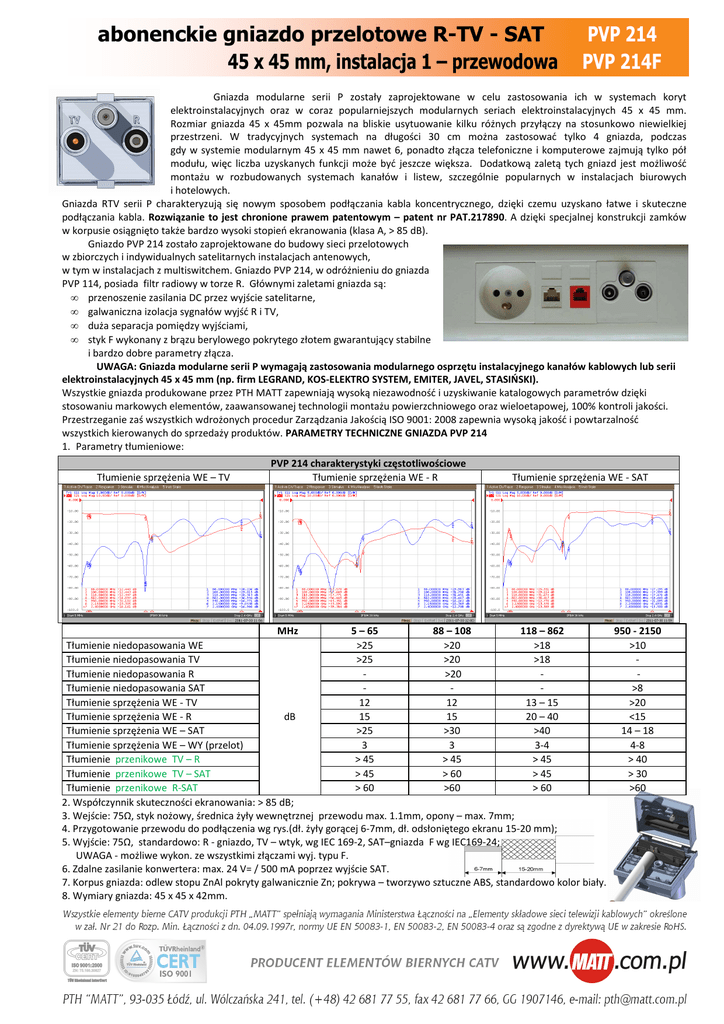 abonenckie gniazdo przelotowe R-TV - SAT 45 x 45 mm, instalacja 1 – przewodowa PVP 214 PVP 214F Gniazda modularne serii P zostały zaprojektowane w celu zastosowania ich w systemach koryt elektroinstalacyjnych oraz w coraz popularniejszych modularnych seriach elektroinstalacyjnych 45 x 45 mm. Rozmiar gniazda 45 x 45mm pozwala na bliskie usytuowanie kilku różnych przyłączy na stosunkowo niewielkiej przestrzeni. W tradycyjnych systemach na długości 30 cm można zastosować tylko 4 gniazda, podczas gdy w systemie modularnym 45 x 45 mm nawet 6, ponadto złącza telefoniczne i komputerowe zajmują tylko pół modułu, więc liczba uzyskanych funkcji może być jeszcze większa. Dodatkową zaletą tych gniazd jest możliwość montażu w rozbudowanych systemach kanałów i listew, szczególnie popularnych w instalacjach biurowych i hotelowych. Gniazda RTV serii P charakteryzują się nowym sposobem podłączania kabla koncentrycznego, dzięki czemu uzyskano łatwe i skuteczne podłączania kabla. Rozwiązanie to jest chronione prawem patentowym – patent nr PAT.217890. A dzięki specjalnej konstrukcji zamków w korpusie osiągnięto także bardzo wysoki stopień ekranowania (klasa A, > 85 dB). Gniazdo PVP 214 zostało zaprojektowane do budowy sieci przelotowych w zbiorczych i indywidualnych satelitarnych instalacjach antenowych, w tym w instalacjach z multiswitchem. Gniazdo PVP 214, w odróżnieniu do gniazda PVP 114, posiada filtr radiowy w torze R. Głównymi zaletami gniazda są: • przenoszenie zasilania DC przez wyjście satelitarne, • galwaniczna izolacja sygnałów wyjść R i TV, • duża separacja pomiędzy wyjściami, • styk F wykonany z brązu berylowego pokrytego złotem gwarantujący stabilne i bardzo dobre parametry złącza. UWAGA: Gniazda modularne serii P wymagają zastosowania modularnego osprzętu instalacyjnego kanałów kablowych lub serii elektroinstalacyjnych 45 x 45 mm (np. firm LEGRAND, KOS-ELEKTRO SYSTEM, EMITER, JAVEL, STASIŃSKI). Wszystkie gniazda produkowane przez PTH MATT zapewniają wysoką niezawodność i uzyskiwanie katalogowych parametrów dzięki stosowaniu markowych elementów, zaawansowanej technologii montażu powierzchniowego oraz wieloetapowej, 100% kontroli jakości. Przestrzeganie zaś wszystkich wdrożonych procedur Zarządzania Jakością ISO 9001: 2008 zapewnia wysoką jakość i powtarzalność wszystkich kierowanych do sprzedaży produktów. PARAMETRY TECHNICZNE GNIAZDA PVP 214 1. Parametry tłumieniowe: Tłumienie sprzężenia WE – TV PVP 214 charakterystyki częstotliwościowe Tłumienie sprzężenia WE - R Tłumienie sprzężenia WE - SAT MHz 5 – 65 88 – 108 118 – 862 950 - 2150 Tłumienie niedopasowania WE >25 >20 >18 >10 Tłumienie niedopasowania TV >25 >20 >18 Tłumienie niedopasowania R >20 Tłumienie niedopasowania SAT >8 Tłumienie sprzężenia WE - TV 12 12 13 – 15 >20 Tłumienie sprzężenia WE - R dB 15 15 20 – 40 <15 Tłumienie sprzężenia WE – SAT >25 >30 >40 14 – 18 Tłumienie sprzężenia WE – WY (przelot) 3 3 3-4 4-8 Tłumienie przenikowe TV – R > 45 > 45 > 45 > 40 Tłumienie przenikowe TV – SAT > 45 > 60 > 45 > 30 Tłumienie przenikowe R-SAT > 60 >60 > 60 >60 2. Współczynnik skuteczności ekranowania: > 85 dB; 3. Wejście: 75Ω, styk nożowy, średnica żyły wewnętrznej przewodu max. 1.1mm, opony – max. 7mm; 4. Przygotowanie przewodu do podłączenia wg rys.(dł. żyły gorącej 6-7mm, dł. odsłoniętego ekranu 15-20 mm); 5. Wyjście: 75Ω, standardowo: R - gniazdo, TV – wtyk, wg IEC 169-2, SAT–gniazda F wg IEC169-24; UWAGA - możliwe wykon. ze wszystkimi złączami wyj. typu F. 6. Zdalne zasilanie konwertera: max. 24 V= / 500 mA poprzez wyjście SAT. 7. Korpus gniazda: odlew stopu ZnAl pokryty galwanicznie Zn; pokrywa – tworzywo sztuczne ABS, standardowo kolor biały. 8. Wymiary gniazda: 45 x 45 x 42mm.