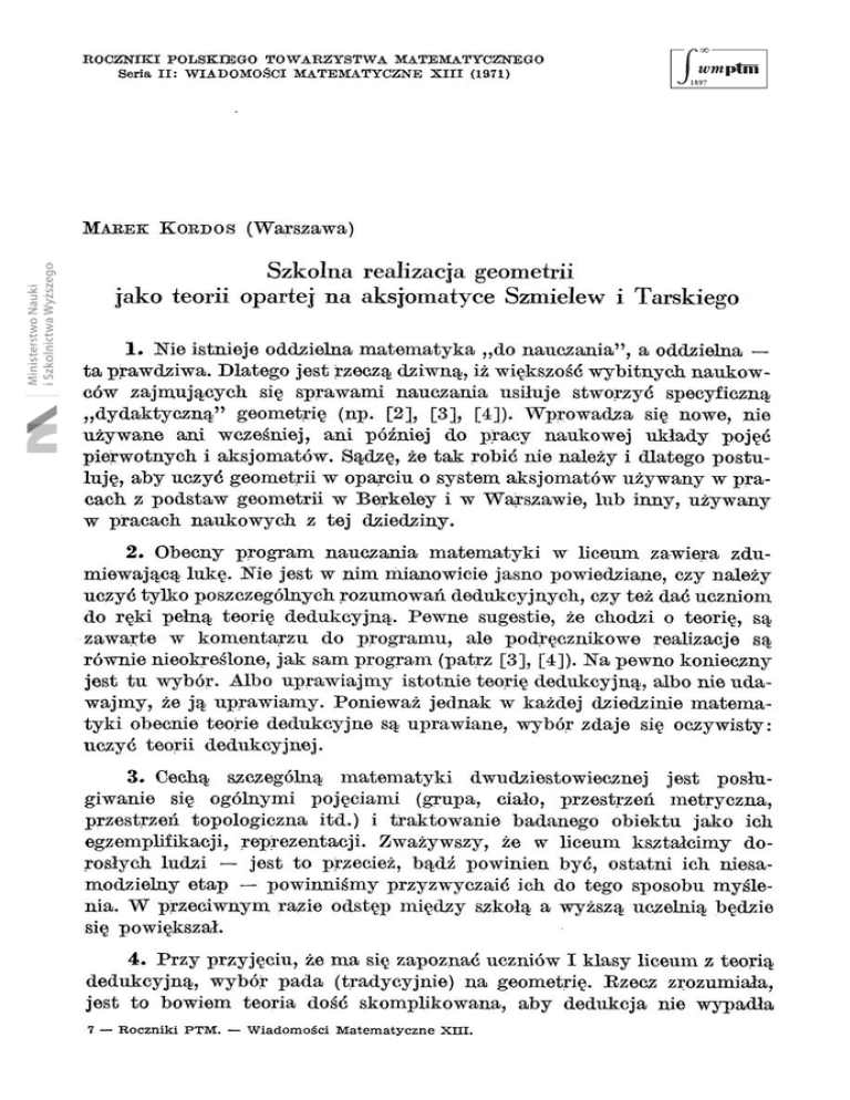 ROCZNIKI POLSKIEGO TOWARZYSTWA MA.TEMATYCZNEGO Seria II: WIADOMOŚCI MATEMATYCZNE XIII (1971) MAREK KORDOS (Warszawa) Szkolna realizacja geometrii jako teorii opartej na aksjomatyce Szmielew i Tarskiego I. Nie istnieje oddzielna matematyka „do nauczania", a oddzielna ta p;rawdziwa. Dlatego jest rzeczą dziwną, iż. większość wybitnych naukowców zajmujących się sprawami nauczania usiłuje stwo;rzyć specyficzną „dydaktyczną" geomet;rię (np. [2], [3], [4]). Wp!'owadza się nowe, nie używane ani wcześniej, ani później do ptacy naukowej układy pojęć pierwotnych i aksjomatów. Sądzę, że tak robić nie należy i dlatego postuluję, aby uczyć geomet!'ii w opa;rciu o system aksjomatów używany w pracach z podstaw geometrii w Berkeley i w W~s.zawie, lub inny, używany w pracach naukowych z tej dziedziny. 2. Obecny p;rogram nauczania matematyki w liceum za.wie;ra .zduNie jest w nim mianowicie jasno powiedziane, czy należy uczyć tylko poszczególnych ;rozumowań dedukcyjnych, czy też dać uczniom do ręki pełną teorię dedukcyjną. Pewne sugestie, że chodzi o teorię, są zaw3JI'te w komenta;rzu do programu, ale pod!ęcznikowe realizacje są równie nieokrnślone, jak sam program (patrz [3], [4]). Na pewno konieczny jest tu wybór . .Albo uprawiajmy istotnie teo;rię dedukcyjną, albo nie udawajmy, że ją up;rawiamy. Ponieważ jednak w każdej dziedzinie matematyki obecnie teorie dedukcyjne są uprawiane, wybór zdaje się oczywisty: uczyć teorii dedukcyjnej. miewającą lukę. 3. Cechą szczególną matematyki dwudziestowiecznej jest posłu giwanie się ogólnymi pojęciami (gI'.upa, ciało, przest;rzeń metryczna, przest;rzeń topologiczna itd.) i traktowanie badanego obiektu jako ich egzemplifikacji, ;rep):'ezentacji. Zważywszy, że w liceum kształcimy do;rosłych ludzi jest to przecież, bądź powinien być, ostatni ich niesamodzielny etap - powinniśmy przyzwyczaić ich do tego sposobu myśle nia. W przeciwnym razie odstęp między szkołą a wyższą uczelnią będzie się powiększał. 4. Przy ma się zapoznać uczniów I klasy liceum z teorią wybó;r pada (tradycyjnie) na geometrię. Rzecz z~ozumiała, jest to bowiem teoria dość skomplikowana, aby dedukcja nie wypadła przyjęciu, że dedukcyjną, 7- Roczniki PTM. - Wiadomości Matematyczne XIII. 98 M. Kordos w niej sztrn;~.znie (jak to bywa np. z arytmetyką), a z drugiej st;rony geometria obfituje w proste twierdzenia, na któ;rych można uczyć rozumowań dedukcyjnych. Kłopoty i spory .zaczynają się w momencie wybo:ru aksjomatyki, pomimo że od czasów Hilberta wiemy dobrze co to jest teoria dedukcyjna i co to są w ogóle podstawy jakiejś gałęzi matematyki, a od czasów Tarskiego (definicja prawdy w teoriach dedukcyjnych) wiemy, jak się tym zajmować. Powinniśmy więc sta;rać się, aby obrany przez nas układ aksjomatów opisywał teorię niesprzeczną i zupełną, by miał mało pojęć pie;rwotnych, wreszcie by aksjomaty były proste, tzn. o jasnym sensie intuicyjnym i krótkim zapisie fo;rrnalnym. Czasem postuluje się również niezależność aksjomatów, z czego jednak w wykładzie na ogół :rezygnuje się, a to dla zmniejszenia liczby dowodów, dbając jednak, aby te „zbędne" aksjomaty również były ładne. Z takiej aksjomatyki .zręcznie i prosto wyprowadza się wszelkie potrzebne twierdzenia. N a takiej aksjomatyce z;resztą kształci się już dziś również duża część studentów - p;rzys.złych nauczycieli. 5. Przy krótkim omówieniu poszczególnych aksjomatyk trudno jest przedstawić wszystkim zainteresowanym kompletne wykłady geometrii na nich oparte. Właściwie p):'zecież dopiero pełne monografie dają całkowity obraz .zalet i wad danej aksjomatyki. Z drugiej strony nie wydaje się, aby argumentem w dyskusji mogło być porównanie dwóch dowodów pojedynczego twierdzenia. T;rzeba chyba dyskutować, co jest głównym narzędziem i na jakiej drodze otrzymujemy to narzędzie do dyspozycji. 6. Jeżeli chodzi o pierwszą sprawę, to sytuacja jest dość szczęśliwa. Obecnie .za takie narzędzie przyjęło się uważać symetrię osiową. Szczególną rolę odegrał tu Bachmann [1]. A więc wyjątkowo natrafiliśmy na sprawę, która nie jest dyskutowana. Pozostaje jednak kwestia, jak tę symetrię i jej własności z danej aksjomatyki uzyskać. 7. Aksjomatyka, o której tu będzie mowa, została podana przez Szmielew i Alfreda Ta;rskiego w 1965 r. Jest to istotnie nowa proponowanych od dawna prze.z Tarskiego poJęc wykorzystania wersja pierwotnych: t_rójargumentowej relacji B - „leżenia między" - i czteroargumentowej ;relacji D - „przystawania" (porównaj np. [5 ], gdzie jest podana starsza wersja aksjomatyki). Sens intuicyjny relacji B(abc) jest: punkt b leży wewnątrz odcinka ac; jest on .znany choćby .z pracy Hilberta, którego aksjomatyka jest punktem wyjścia omawianej aksjomatyki. Natomiast sens D(abcd) jest: odległość a i b jest taka, jak odległość ci d. Teoria tu opisywana jest elementarna (oparta na logice pierwszego rzędu) . .Aksjomatyka, o której mowa, została wielokrotnie sprawdzona Wandę Szkolna realizacja geornetrii 99 dydaktycznie p;rzez prof. W. Szmielew i dra L. vV. Szcze;rbę w wykładach uniwersyteckich oraz przez mg;ra J. Lisiewicza i autora niniejszego artykułu w I klasie liceum im. Gotwalda, którym opiekuje się Instytut Matematyki Uniwersytetu Warszawskiego. Młodzież w tym liceum jest wyselekcjonowana. Jednak selekcja przy przyjmowaniu kandydatów odbiła się, jak sądzę, nie na stworzeniu możliwości stosowania tej aksjomatyki, lecz tylko na umożliwieniu uprawiania teorii na bardzo wysokim po.ziomie. I z tego poziomu na pewno w zwykłej klasie t;rzeba by zrezygnować. Nie sądzę, aby dotyczyło to jednak aksjomatyki. W roku szkolnym 1968/69, dzięki sta;raniom Ośrodka Metodycznego Kuratorium Stołecznego, umożliwiono mi nauczanie geometrii według tejże aksjomatyki w I klasie liceum z nieselekcjonowaną mł
