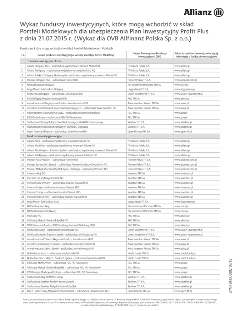 Wykaz funduszy inwestycyjnych, które mogą wchodzić w skład Portfeli Modelowych dla ubezpieczenia Plan Inwestycyjny Profit Plus z dnia 21.07.2015 r. (Wykaz dla OVB Allfinanz Polska Sp. z o.o.) Fundusze, które mogą wchodzić w skład Portfeli Modelowych Polskich Lp. Nazwa Towarzystwa Funduszy Inwestycyjnych (TFI) Nazwa funduszu inwestycyjnego, w który inwestuje Portfel Modelowy Adres strony internetowej zawierającej informacje o fundusz inwestycyjnym Fundusze inwestycyjne dłużne 1 Allianz Obligacji Plus – subfundusz wydzielony w ramach Allianz FIO TFI Allianz Polska S.A. www.allianz.pl 2 Allianz Pieniężny – subfundusz wydzielony w ramach Allianz FIO TFI Allianz Polska S.A. www.allianz.pl 3 Allianz Polskich Obligacji Skarbowych – subfundusz wydzielony w ramach Allianz FIO TFI Allianz Polska S.A. www.allianz.pl 4 Pioneer Obligacji Plus – subfundusz Pioneer FIO Pioneer Pekao TFI S.A. www.pioneer.com.pl 5 NN Subfundusz Obligacji NN Investment Partners TFI S.A. www.nntfi.pl 6 Legg Mason Subfundusz Obligacji Legg Mason TFI S.A. www.leggmason.pl 7 UniKorona Obligacje – subfundusz UniFundusze FIO Union Investment TFI S.A. www.union-investment.pl 8 PKO Obligacji Długoterminowych FIO PKO TFI S.A. www.pkotfi.pl 9 Aviva Investors Obligacji – subfundusz Aviva Investors FIO Aviva Investors Poland TFI S.A. www.aviva.pl 10 Aviva Investors Dłużnych Papierów Korporacyjnych – subfundusz Aviva Investors FIO Aviva Investors Poland TFI S.A. www.aviva.pl 11 PZU Papierów Dłużnych POLONEZ – subfundusz PZU FIO Parasolowy PZU TFI S.A. www.pzu.pl 12 PZU Gotówkowy – subfundusz PZU FIO Parasolowy PZU TFI S.A. www.pzu.pl 13 Subfundusz Dłużnych Papierów Wartośćiowych SKARBIEC-Depozytowy Skarbiec TFI S.A. www.skarbiec.pl 14 Subfundusz Instrumentów Dłużnych SKARBIEC-Obligacja Skarbiec TFI S.A. www.skarbiec.pl 15 Open Finance Obligacje – subfundusz Open Finance FIO Open Finance TFI S.A. www.open-tfi.pl 16 Allianz Akcji – subfundusz wydzielony w ramach Allianz FIO TFI Allianz Polska S.A. www.allianz.pl 17 Allianz Akcji Plus – subfundusz wydzielony w ramach Allianz FIO TFI Allianz Polska S.A. www.allianz.pl 18 Allianz Akcji Małych i Średnich Spółek – subfundusz wydzielony w ramach Allianz FIO TFI Allianz Polska S.A. www.allianz.pl 19 Allianz Selektywny – subfundusz wydzielony w ramach Allianz FIO TFI Allianz Polska S.A. www.allianz.pl 20 Pioneer Akcji Polskich – subfundusz Pioneer FIO Pioneer Pekao TFI S.A. www.pioneer.com.pl 21 Pioneer Surowców i Energii – subfundusz Pioneer Funduszy Globalnych FIO Pioneer Pekao TFI S.A. www.pioneer.com.pl 22 Pioneer Małych i Średnich Spółek Rynku Polskiego – subfundusz Pioneer FIO Pioneer Pekao TFI S.A. www.pioneer.com.pl 23 Investor Akcji FIO Investors TFI S.A. www.investors.pl 24 Investor Top 25 Małych Spółek FIO Investors TFI S.A. www.investors.pl 25 Investor Gold Otwarty – subfundusz Investor Parasol SFIO Investors TFI S.A. www.investors.pl 26 Investor Rosja – subfundusz Investor Parasol SFIO Investors TFI S.A. www.investors.pl 27 Investor Turcja – subfundusz Investor Parasol SFIO Investors TFI S.A. www.investors.pl 28 Investor Indie i Chiny – subfundusz Investor Parasol SFIO Investors TFI S.A. www.investors.pl 29 Legg Mason Subfundusz Akcji Legg Mason TFI S.A. www.leggmason.pl 30 NN Subfundusz Akcji NN Investment Partners TFI S.A. www.nntfi.pl 31 NN Subfundusz Selektywny NN Investment Partners TFI S.A. www.nntfi.pl 32 PKO Akcji FIO PKO TFI S.A. www.pkotfi.pl 33 PKO Akcji Małych i Średnich Spółek FIO PKO TFI S.A. www.pkotfi.pl 34 PKO Złota – subfundusz PKO Światowy Fundusz Walutowy SFIO PKO TFI S.A. www.pkotfi.pl 35 UniKorona Akcje – subfundusz UniFundusze FIO Union Investment TFI S.A. www.union-investment.pl 36 UniAkcje Małych i Średnich Spółek – subfundusz UniFundusze FIO Union Investment TFI S.A. www.union-investment.pl 37 Aviva Investors Polskich Akcji – subfundusz Aviva Investors FIO Aviva Investors Poland TFI S.A. www.aviva.pl 38 Aviva Investors Nowych Spółek – subfundusz Aviva Investors FIO Aviva Investors Poland TFI S.A. www.aviva.pl 39 Aviva Investors Małych Spółek – subfundusz Aviva Investors FIO Aviva Investors Poland TFI S.A. www.aviva.pl 40 Noble Funds Akcji – subfundusz Noble Funds FIO Noble Funds TFI S.A. www.noblefunds.pl 41 Noble Fund Akcji Małych i Średnich Spółek – subfundusz Noble Funds FIO Noble Funds TFI S.A. www.noblefunds.pl 42 PZU Akcji KRAKOWIAK – subfundusz PZU FIO Parasolowy PZU TFI S.A. www.pzu.pl 43 PZU Akcji Małych i Średnich Spółek – subfundusz PZU FIO Parasolowy PZU TFI S.A. www.pzu.pl 44 PZU Energia Medycyna Ekologia – subfundusz PZU FIO Parasolowy PZU TFI S.A. www.pzu.pl 45 Subfundusz Akcji SKARBIEC-Akcja Skarbiec TFI S.A. www.skarbiec.pl 46 Subfundusz Skarbiec Rynków Surowcowych Skarbiec TFI S.A. www.skarbiec.pl 47 Subfundusz Skarbiec Małych i Średnich Spółek Skarbiec TFI S.A. www.skarbiec.pl 48 Open Finance Akcji Małych i Średnich Spółek – subfundusz Open Finance FIO Open Finance TFI S.A. www.open-tfi.pl Towarzystwo Ubezpieczeń Allianz Życie Polska Spółka Akcyjna z siedzibą w Warszawie, ul.–Rodziny 1 – Hiszpańskich 1, 02-685 Warszawa, wpisana do rejestru przedsiębiorców prowadzonego przez Sąd Rejonowy dla m. st. Warszawy w Warszawie, XIII Wydział Gospodarczy Krajowego Rejestru Sądowego, pod numerem KRS: 0000021971, NIP 527-17-54-073, REGON 012634451, wysokość kapitału zakładowego: 118 630 000 złotych (wpłacony w całości). ZYAI-FUNDOVB02 07/15 Fundusze inwestycyjne akcyjne
