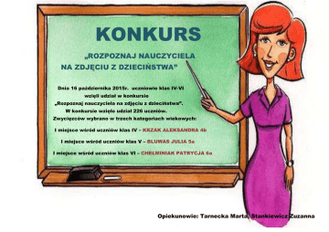 . KONKURS „ROZPOZNAJ NAUCZYCIELA NA ZDJĘCIU Z DZIECIŃSTWA” Dnia 16 października 2015r. uczniowie klas IV-VI wzięli udział w konkursie „Rozpoznaj nauczyciela na zdjęciu z dzieciństwa”. W konkursie wzięło udział 226 uczniów. Zwycięzców wybrano w trzech kategoriach wiekowych: I miejsce wśród uczniów klas IV – KRZAK ALEKSANDRA 4b I miejsce wśród uczniów klas V – BLUWAS JULIA 5a I miejsce wśród uczniów klas VI – CHEŁMINIAK PATRYCJA 6a Opiekunowie: Tarnecka Marta, Stankiewicz Zuzanna Nauczycielami, których rozpoznała największa liczba uczniów okazali się: • Dragon Dorota – rozpoznało ją 40 osób • Wieczorek Małgorzata – rozpoznało ją 30 osób • Strucka – Kraszewska Lidia – rozpoznały ją 22 osoby • Dublinowski Łukasz – rozpoznało go 20 osób • Szczepaniak Beata – rozpoznało ją 18 osób • Rosłaniec Hanna - rozpoznało ją 18 osób • Kubicka Dorota – rozpoznało ją 16 osób • Rotuska Ewelina – rozpoznało ją 15 osób • Siemińska Monika – rozpoznało ją 15 osób • Grębowska Jolanta - rozpoznało ją 13 osób • Wieczorek Katarzyna - rozpoznało ją 13 osób • Jaworska – Kranich Magdalena - rozpoznało ją 10 osób • Magdzińska Bogumiła - rozpoznało ją 9 osób • Tułnowska Anna - rozpoznało ją 9 osób • Stankiewicz Zuzanna - rozpoznało ją 9 osób • Mikulska – Kołodziej Katarzyna - rozpoznało ją 8 osób • Krzemień Beata - rozpoznało ją 7 osób • Renczkowska Agnieszka – rozpoznało ją 6 osób • Pniewska Jolanta - rozpoznało ją 5 osób • Traczyk Magdalena - rozpoznały ją 4 osoby • Zarzycka Małgorzata - rozpoznały ją 4 osoby • Wilczyńska Bożena - rozpoznały ją 4 osoby • Tarnecka Marta - rozpoznały ją 3 osoby
