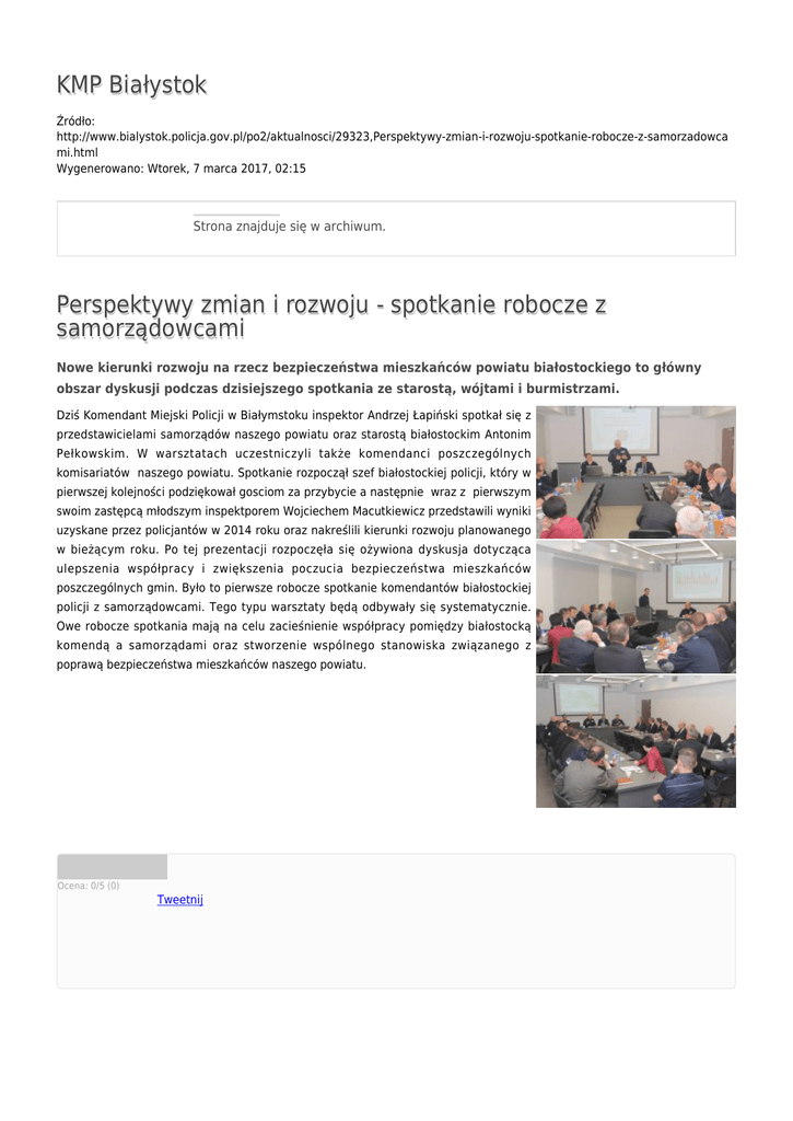KMP Białystok Źródło: http://www.bialystok.policja.gov.pl/po2/aktualnosci/29323,Perspektywy-zmian-i-rozwoju-spotkanie-robocze-z-samorzadowca mi.html Wygenerowano: Wtorek, 7 marca 2017, 02:15 Strona znajduje się w archiwum. Perspektywy zmian i rozwoju - spotkanie robocze z samorządowcami Nowe kierunki rozwoju na rzecz bezpieczeństwa mieszkańców powiatu białostockiego to główny obszar dyskusji podczas dzisiejszego spotkania ze starostą, wójtami i burmistrzami. Dziś Komendant Miejski Policji w Białymstoku inspektor Andrzej Łapiński spotkał się z przedstawicielami samorządów naszego powiatu oraz starostą białostockim Antonim Pełkowskim. W warsztatach uczestniczyli także komendanci poszczególnych komisariatów naszego powiatu. Spotkanie rozpoczął szef białostockiej policji, który w pierwszej kolejności podziękował gosciom za przybycie a następnie wraz z pierwszym swoim zastępcą młodszym inspektporem Wojciechem Macutkiewicz przedstawili wyniki uzyskane przez policjantów w 2014 roku oraz nakreślili kierunki rozwoju planowanego w bieżącym roku. Po tej prezentacji rozpoczęła się ożywiona dyskusja dotycząca ulepszenia współpracy i zwiększenia poczucia bezpieczeństwa mieszkańców poszczególnych gmin. Było to pierwsze robocze spotkanie komendantów białostockiej policji z samorządowcami. Tego typu warsztaty będą odbywały się systematycznie. Owe robocze spotkania mają na celu zacieśnienie współpracy pomiędzy białostocką komendą a samorządami oraz stworzenie wspólnego stanowiska związanego z poprawą bezpieczeństwa mieszkańców naszego powiatu. Ocena: 0/5 (0) Tweetnij