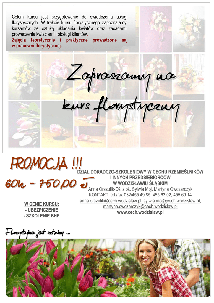 Celem kursu jest przygotowanie do świadczenia usług florystycznych. W trakcie kursu florystycznego zapoznajemy kursantów ze sztuką układania kwiatów oraz zasadami prowadzenia kwiaciarni i obsługi klientów. Zajęcia teoretycznie i praktyczne prowadzone są w pracowni florystycznej. Zapraszamy na kurs florystyczny PROMOCJA !!! 60h - 750,00 zł W CENIE KURSU: - UBEZPICZENIE - SZKOLENIE BHP Florystyka jest sztuką ... DZIAŁ DORADCZO-SZKOLENIOWY W CECHU RZEMIEŚLNIKÓW I INNYCH PRZEDSIĘBIORCÓW W WODZISŁAWIU ŚLĄSKIM Anna Orszulik-Oślizlok, Sylwia Moj, Martyna Owczarczyk KONTAKT: tel./fax 032/455 49 85, 455 63 02, 455 69 14 [email protected], [email protected], [email protected] www.cech.wodzislaw.pl