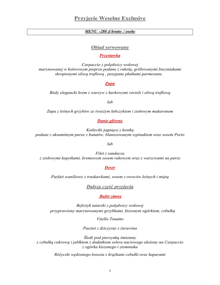 Przyjęcie Weselne Exclusive MENU -280 zł brutto / osoby Obiad serwowany Przystawka Carpaccio z polędwicy wołowej marynowanej w kolorowym pieprzu podane z rukolą, grillowanymi boczniakami skropionymi oliwą truflową , posypane płatkami parmezanu. Zupa Biały elegancki krem z warzyw z kurkowymi ravioli i oliwą truflową lub Zupa z leśnych grzybów ze świeżym lubczykiem i ziołowym makaronem Danie główne Kotleciki jagnięce z kostką podane z aksamitnym puree z batatów, blanszowanym szpinakiem oraz sosem Porto lub Filet z sandacza z ziołowymi kopytkami, kremowym sosem rakowym oraz z warzywami na parze Deser Parfait waniliowe z truskawkami, sosem z owoców leśnych i miętą Dalsza część przyjęcia Bufet zimny Befsztyk tatarski z polędwicy wołowej przyprawiony marynowanymi grzybkami, kiszonym ogórkiem, cebulką Vitello Tonatto Pasztet z dziczyzny z żurawina Śledź pod pierzynką śmietany z cebulką cukrową i jabłkiem z dodatkiem selera naciowego ułożony na Carpaccio z ogórka kiszonego i ziemniaka Różyczki wędzonego łososia z krążkami cebulki oraz kaparami 1 Łódeczki melona w szynce Serrano Sałata Cezar Sałata Rzymska z aromatycznym sosem cezar podana z filetami Anchois, ziołowymi grzankami, kaparami, oliwkami oraz chipsami z bekonu, posypana płatkami z sera Gruyere Bufet gorący Polędwiczki wieprzowe w otulinie z boczku, z nutą masła czosnkowego Pierożki ze słodką kapustą posypane chrupiącym bekonem i listkami natki pietruszki Krewetki królewskie w sosie pomarańczowym Warzywa pod beszamelem Ziemniaczki opiekane z rozmarynem Bufet słodki Mini serniki z karmelizowaną gruszką Bezy z limonkowym serkiem Babeczki z kremem i owocami Patery owoców sezonowych Tort weselny w bogatej dekoracji / 20 zł / porcja Tort Black Forest z wiśniami, bogato udekorowany świeżymi kwiatami Napoje gorące Kawa, herbata Napoje zimne Woda mineralna niegazowana, gazowana Dodatkowo należy doliczyć 10% serwis gastronomiczny 2