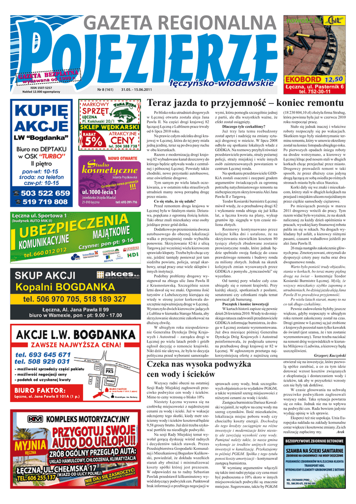Nr 8 (161) 31.05. - 15.06.2011 Teraz jazda to przyjemność – koniec remontu Po blisko roku utrudnień drogowych w Łęcznej otwarta została aleja Jana Pawła II. Na części drogi krajowej 82 łączącej Łęczną z Lublinem prace trwały od 6 lipca 2010 roku. Na prawie całym odcinku drogi krajowej w Łęcznej, która do tej pory miała jedną jezdnię, teraz są po dwa pasy ruchu w obu kierunkach. Razem z modernizacją drogi krajowej 82 wybudowano kanał deszczowy do którego będzie spływała woda z centralnej i północnej Łęcznej. Powstały także chodniki, nowe przystanki autobusowe, oraz oświetlenie drogowe. Tym samym po wielu latach oczekiwania, a w ostatnim roku straszliwych utrudnień mamy nową porządną drogę przez miasto. Co się stało, że się udało? Przed remontem droga krajowa w Łęcznej była w fatalnym stanie. Dziurawa, popękana z ogromną ilością kolein. Taki obraz znali mieszkańcy oraz osoby jeżdżące przez gród dzika. Dodatkowo po przeniesieniu dworca autobusowego do obecnej lokalizacji walka o przynajmniej rondo wybuchła ponownie. Skrzyżowanie 82-ki z ulicą Targową już wcześniej wielu kierowcom sprawiało kłopoty. Trzeba było chcąc czy nie, jeździć tamtędy ponieważ jest tam siedziba powiatu, policja, urząd skarbowy, urząd pracy oraz wiele sklepów i innych instytucji. Podobny problemy drogowy występował na zbiegu ulic Jana Pawła II z Krasnostawską. Szczególnie sezon letni dawał się we znaki. Ogromna ilość turystów z Lubelszczyzny kierująca się wtedy w stronę jezior korkowała doszczętnie najważniejszą drogę w Łęcznej. Wystarczyło dwóch kierowców jadących z Lublina w kierunku Starego Miasta, aby skrzyżowanie skutecznie zakorkować na dłuższą chwilę. W ubiegłym roku niespodziewanie Generalna Dyrekcja Dróg Krajowych i Autostrad – zarządca drogi w Łęcznej po wielu latach próśb i gróźb ogłosił decyzję o remoncie krajówki. Nikt dziś nie ukrywa, że była to decyzja polityczna przed wyborami samorządo- wymi, która pomogła szczególnie jednej z partii, ale dla wszystkich ważne, że efekt został osiągnięty. Dlaczego tyle czekaliśmy? Już trzy lata temu rozbudzony został apetyt i nadzieję na zmiany sytuacji drogowej w mieście. W lipcu 2008 odbyło się spotkanie lokalnych władz z GDDKiA. Na rozmowy przybyli również przedstawiciele powiatu, straży pożarnej policji, straży miejskiej i wiele innych osób zainteresowanych powstaniem w centrum Łęcznej ronda. Na spotkaniu przedstawiciele GDDKiA zostali osaczeni i zasypani gradem argumentów świadczących za ogromną potrzebą natychmiastowego remontu na niebezpiecznym skrzyżowaniu Alei Jana Pawła II z Targową. Teodor Kosiarski burmistrz Łęcznej mówił wtedy, że o przebudowę drogi 82 i wykonanie ronda ubiega się już kilka lat, a łączna kwota na plany, wykup gruntów itp. sięgnęła w tym czasie miliona złotych. Rozmowy kontynuowano przez kolejne kilka dni i ustalono, że na skrzyżowaniu niewielkim kosztem 80 tysięcy złotych zbudowane zostanie prowizoryczne rondo, które jednak będzie spełniało swoją funkcję do czasu prawdziwego remontu i budowy ronda za miliony złotych. Jednak na skutek kolejnych zmian wysuwanych przez GDDKiA z pomysłu „tymczasówki” się wycofano. Od tamtej pory władze cały czas ubiegały się o remont krajówki. Przy każdej okazji, spotkaniach z posłami, senatorami czy członkami rządu temat powracał jak bumerang. Początek i koniec inwestycji W kartach historii zapisze się pewnie dzień 26 kwietnia 2010. Wtedy to do miejskiego ratusza zadzwonili przedstawiciele GDDKiA informując burmistrza, że droga w Łęcznej zostanie wyremontowana. Już dwa miesiące później Generalna Dyrekcja Dróg Krajowych i Autostrad poinformowała, że podpisała umowę na przebudowę drogi krajowej nr 82 w Łęcznej. W ogłoszonym przetargu najkorzystniejszą ofertę z najniższą ceną Czeka nas wysoka podwyżka cen wody i ścieków Wszyscy radni obecni na ostatniej Sesji Rady Miejskiej zagłosowali przeciwko podwyżce cen wody i ścieków. Mimo to ceny wzrosną o blisko 10% Niestety Łęczna wysuwa się na czołówkę miejscowości z najdroższymi cenami za wodę i ścieki. Już w wakacje odczujemy tego skutki, kiedy metr sześcienny wody i ścieków kosztował będzie 9,58 groszy brutto. Już dziś trzeba szykować portfele na nieodległe podwyżki. Na sesji Rady Miejskiej temat wywołał gorącą dyskusję wśród radnych i decydentów takich stawek. Prezes Przedsiębiorstwa Gospodarki Komunalnej i Mieszkaniowej Bogusław Kulikowski, powiedział, że dokłada wszelkich starań aby obniżać i minimalizować koszty spółki której jest prezesem. W odpowiedzi na to radny Sebastian Pawlak przedstawił kilkuminutowy wywód dotyczący podwyżek cen. Punktował brak informacji o przebiegu negocjacji w sprawach ceny wody, brak szczegółowych objaśnień co to wydatków PGKiM, a także wymienił szereg miejscowości z niższymi cenami za wodę i ścieki. Zastępca burmistrza Dariusz Kowalski wyjaśnił, że wpływ na cenę wody ma szereg czynników. Ilość mieszkańców, lokalizacja miejsc poboru wody czy chociażby koszty energii. Dochodzą do tego kredyty zaciągnięte na różne inwestycje i modernizacje które niestety ale zawyżają wysokość ceny wody. Pamiętać należy także, że nasza gmina wykonuje ze środków unijnych szereg inwestycji w kanalizację. Przekazujemy to później PGKiM. Spółka z tego tytułu ponosi koszty amortyzacji – kontynuował zastępcą burmistrza. W wymianę argumentów włączyli się także inni radni pytając czy cena musi być podnoszona o 10% skoro w innych miejscowościach podwyżki są znacznie mniejsze. Sugerowano, także by PGKiM (18 230 804,10 zł) złożyła firma Strabag, która powinna była już w czerwcu 2010 roku rozpocząć pracę. Stało się jednak inaczej i właściwe roboty rozpoczęły się po wakacjach. Skutkiem tego były niedotrzymanie ter
