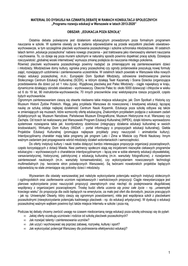 MATERIAŁ DO DYSKUSJI NA CZWARTĄ DEBATĘ W RAMACH KONSULTACJI SPOŁECZNYCH „Programu rozwoju edukacji w Warszawie w latach 2013-2020” OBSZAR: „EDUKACJA POZA SZKOŁĄ” Ostatnia debata poświęcona jest działaniom edukacyjnym prowadzonym poza formalnym programem nauczania w szkole. W systemie oświaty za te zadania odpowiedzialne są przede wszystkimi placówki oświatowowychowawcze, w tym szczególnie placówki wychowania pozaszkolnego i szkolne schroniska młodzieżowe. W ostatnich latach termin „edukacja pozaszkolna” nabiera nowego znaczenia – jest traktowana jako równoważny element nauczania i wychowania. To, co dzieje się poza murami szkolnymi w naturalny sposób powinno dopełniać pracę szkoły. Dzisiejsza rzeczywistość „globalnej wioski internetowej” wymusza zmianę podejścia do nauczania młodego pokolenia. Również placówki wychowania pozaszkolnego powinny nadążać za zmieniającymi się zainteresowaniami dzieci i młodzieży. Młodzieżowe domy kultury, ogniska pracy pozaszkolnej czy ogrody jordanowskie poszukują nowej formuły zajęć, rozwijających uzdolnienia i zainteresowania uczestników. W ostatnich latach powstało w Warszawie kilka nowych miejsc edukacji pozaszkolnej, m.in.: Europejski Dom Spotkań Młodzieży, odnowione średniowieczne piwnice Stołecznego Centrum Edukacji Kulturalnej (SCEK), w którym działają Teatr Kazamaty i Scena Dziecka (organizująca przedstawienia dla dzieci już od 1 roku życia). Wyjątkową placówką jest Pałac Młodzieży - ciągle największy w kraju, dynamicznie działający ośrodek oświatowo - wychowawczy. Obecnie Pałac to: około 5000 dziewcząt i chłopców w wieku od 6 do 19 lat, 90 instruktorów-wychowawców, 70 innych pracowników oraz wielotysięczna rzesza przyjaciół, często byłych wychowanków. Ogromnym zainteresowaniem cieszą się otwarte niedawno takie miejsca edukacyjne, jak: Dom Spotkań z Historią czy Muzeum Historii Żydów Polskich. Wagę, jaką przykłada Warszawa do nowoczesnej i kreatywnej edukacji, łączącej naukę ze sztuką oddaje najlepiej działalność Centrum Nauki Kopernik. Edukacja poza szkołą odbywa się także w zmieniających się muzeach, które wzmocniły ofertę edukacyjną. Znakomitym przykładem podjęcia z sukcesem zadań dydaktycznych są: Muzeum Narodowe, Państwowe Muzeum Etnograficzne, Muzeum Historyczne m.st. Warszawy czy Zachęta. Od trzech lat realizowany jest Warszawski Program Edukacji Kulturalnej (WPEK), dzięki któremu wprowadzono systemowe rozwiązania takie jak: koordynatorzy dzielnicowi (integrujący działania edukacji kulturalnej w swoich środowiskach), Wirtualny Dom Kultury (WiDoK – portal informujący o propozycjach edukacji kulturalnej), Giełda Projektów Edukacji Kulturalnej (promująca najlepsze przykłady pracy nauczycieli i animatorów kultury). Interdyscyplinarny charakter mają takie programy jak program Lato i Zima w Mieście czy Piknik Naukowy. Innym ważnym zadaniem jest propagowanie wśród młodzieży działań wolontariackich i samorządności. Do oferty instytucji kultury i nauki trzeba dołączyć bardzo interesujące propozycje organizacji pozarządowych, często korzystających z dotacji Miasta. Nasi partnerzy społeczni stają się inicjatorami niezwykle ciekawych programów edukacyjno – wychowawczych o charakterze interdyscyplinarnym – łączą one w sobie elementy edukacji obywatelskiej, varsavianistycznej, historycznej, patriotycznej z edukacją kulturalną (m.in. warsztaty fotograficzne), z rozwijaniem zainteresowań naukowych (m.in. warsztaty konserwatorskie), czy wykorzystaniem nowoczesnych technologii multimedialnych (np. tworzenie stron poświęconych Warszawie). Są twórcami nowatorskich projektów będących odpowiedzią na stale zmieniające się potrzeby dzieci i młodzieży. Wyzwaniem dla oświaty warszawskiej jest należyte wykorzystanie potencjału ważnych instytucji stołecznych i ogólnopolskich oraz zaoferowanie uczniom najciekawszych i wartościowych propozycji. Ciągle niewystarczające jest planowe wykorzystanie przez nauczycieli propozycji zewnętrznych oraz niechęć do podejmowania długofalowej współpracy z organizacjami pozarządowymi. Troskę budzi oferta uczenia się przez całe życie – np. „uniwersytet trzeciego wieku” (to propozycja dla osób będących na emeryturze, za mało jest ofert dla dorosłych, jeszcze pracujących - jak np. Uniwersytet Otwarty, który cieszy się ogromnym powodzeniem), nikła jest współpraca szkół z placówkami pozaszkolnymi (niewykorzystanie potencjału kadrowego placówek - np. do edukacji artystycznej). W dyskusji o edukacji pozaszkolnej ważnym wątkiem powinno być także miejsce Internetu w szkole i poza nią. Podczas tej debaty chcemy zwrócić uwagę na czasem niedocenianą rangę edukacji poza szkołą odnosząc się do pytań: • Jakiej oferty oczekują uczniowie i rodzice od szkołą placówek pozaszkolnych? • Jak rozwijać talenty i zainteresowania uczniów? • Jak uczyć i wychowywać się poprzez zabawę, rozrywkę, kulturę i sport? • Jak wykorzystać potencjał Warszawy dla podniesienia efektywności edukacji? 1 I. Cele Programu w obszarze „Edukacja poza szkołą” Cele główne Edukacja poza szkołą Cel główny 4.1: Wykorzystanie zasobów edukacji pozaszkolnej do kształtowania wrażliwości kulturalnej i tożsamości lokalnej Cel 4.1.1 Rozwój oferty edukacji międzykulturowej Cele szczegółowe Cel 4.1.2 Stworzenie warunków do uczestnictwa w kulturze Cel 4.1.3 Rozwój edukacyjnej oferty varsavianistycznej Cel 4.1.4 Budowanie porozumień szkół z placówkami edukacji pozaszkolnej, instytucjami kultury i organizacjami pozarządowe Cel główny 4.2: Zwiększenie roli edukacji pozaszkolnej i stworzenie warunków do walidacji efektów Cel 4.2.2 Współpraca w europejskiej przestrzeni edukacyjnej na poziomie instytucjonalnym i szkolnym Cel 4.2.1 Wzmacnianie roli edukacji nieformalnej i pozaformalnej Cel 4.2.3 Zwię